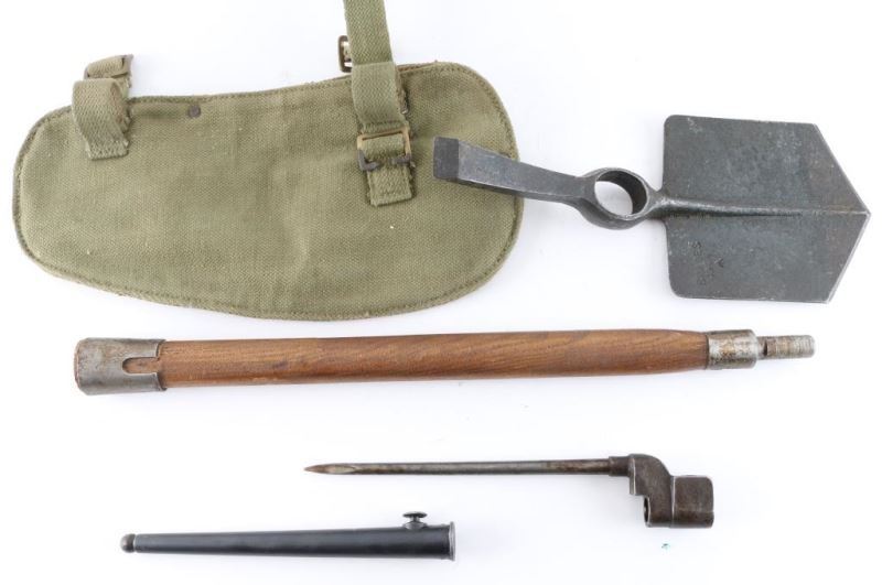 Stamped brades 1944, includes enfield bayonet an original canvas cover which is also marked 1942 with British arrow.
