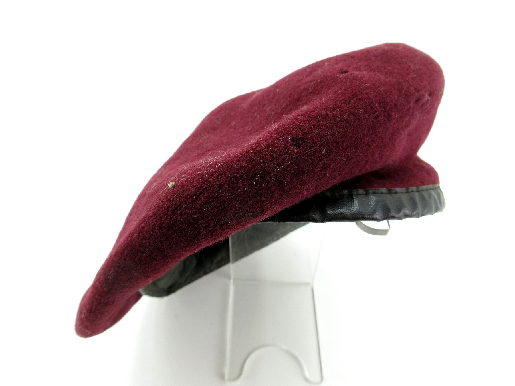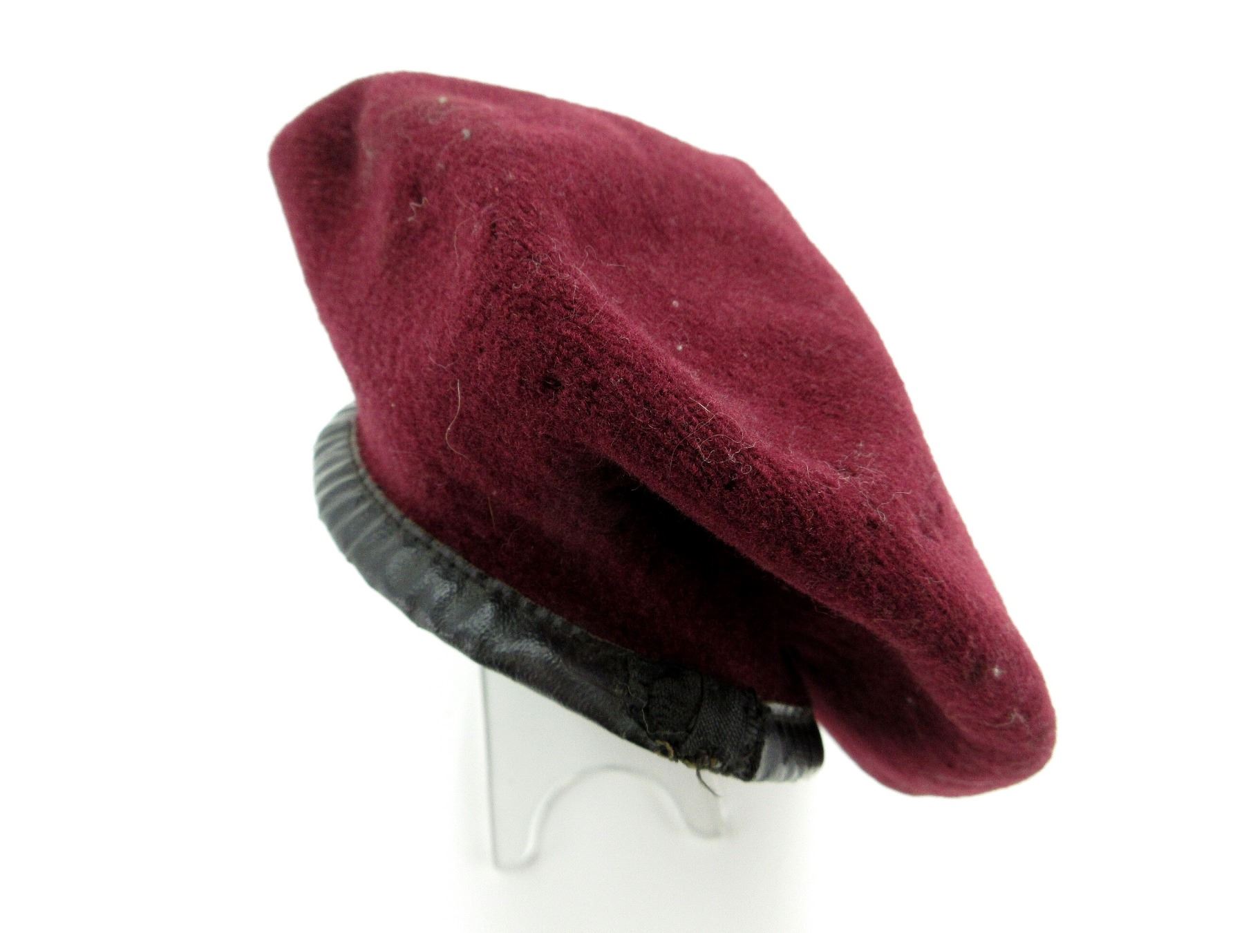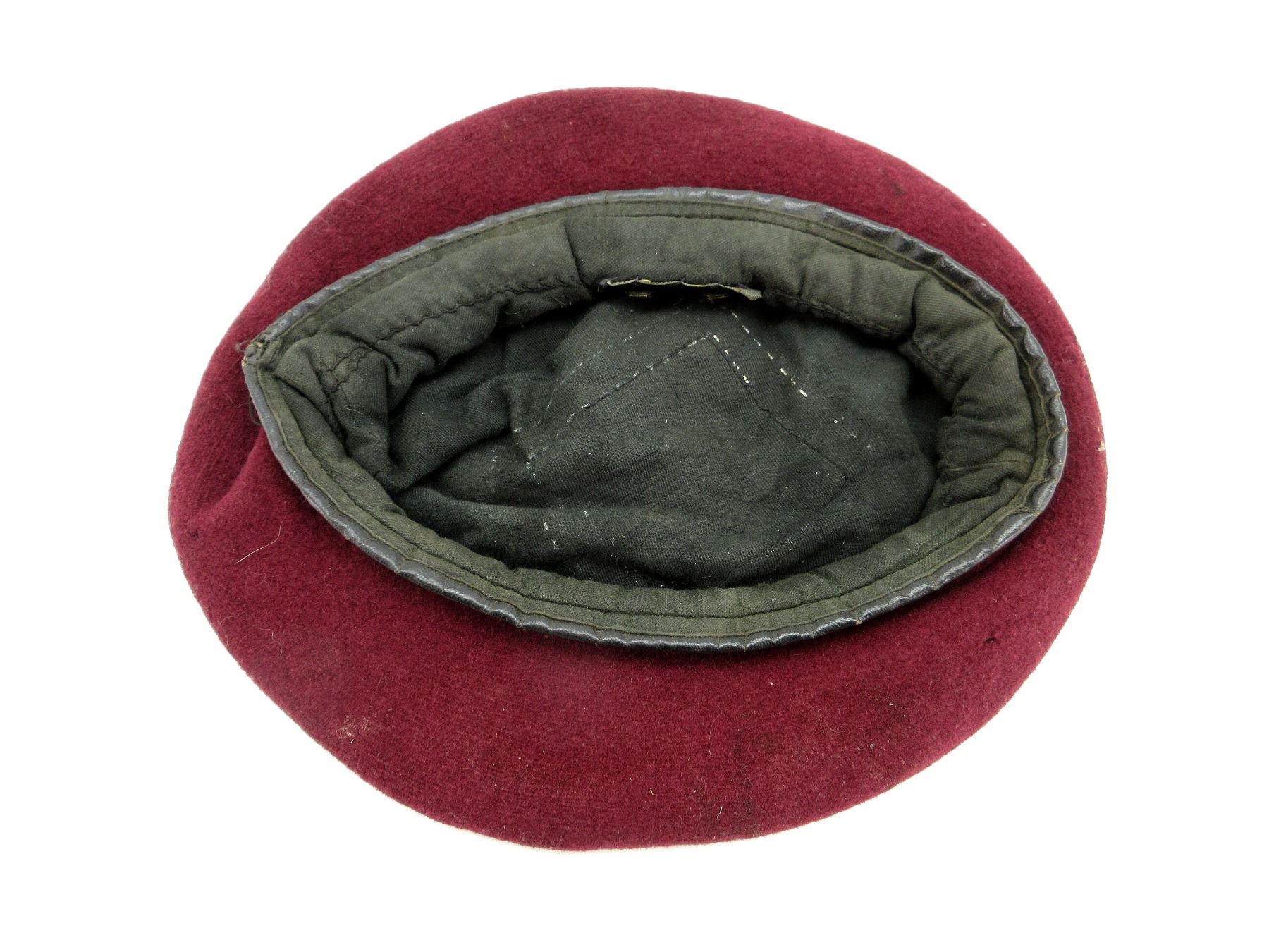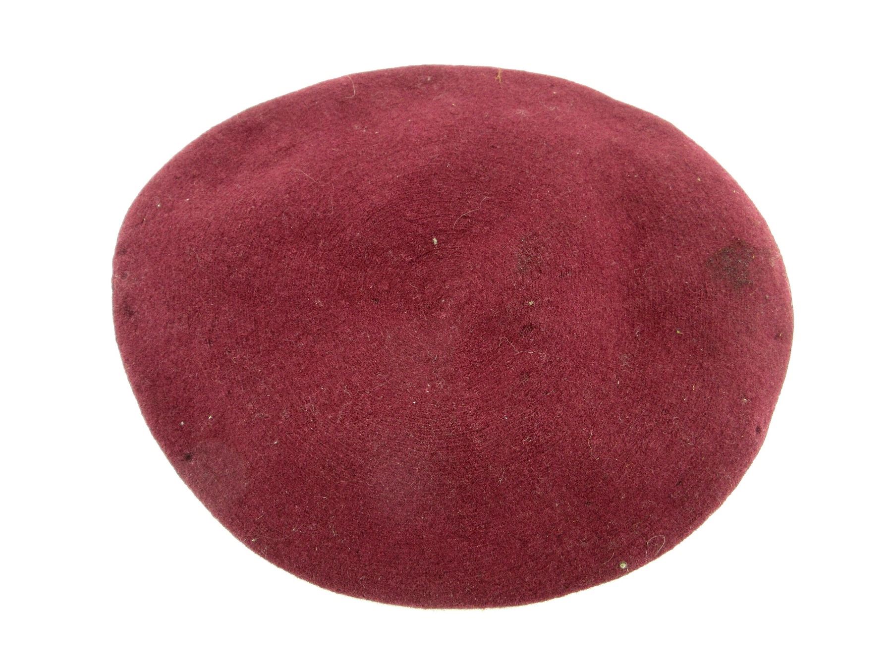 (1) MAROON WOOL BERET, CONSIGNER STATES "AIR TROOPER CANADIAN WWII BERET", NO VISIBLE MARKINGS, SHOWS AGE / WEAR / TEAR, APPROX. DIA. 6.75". SEE PHOTOS.