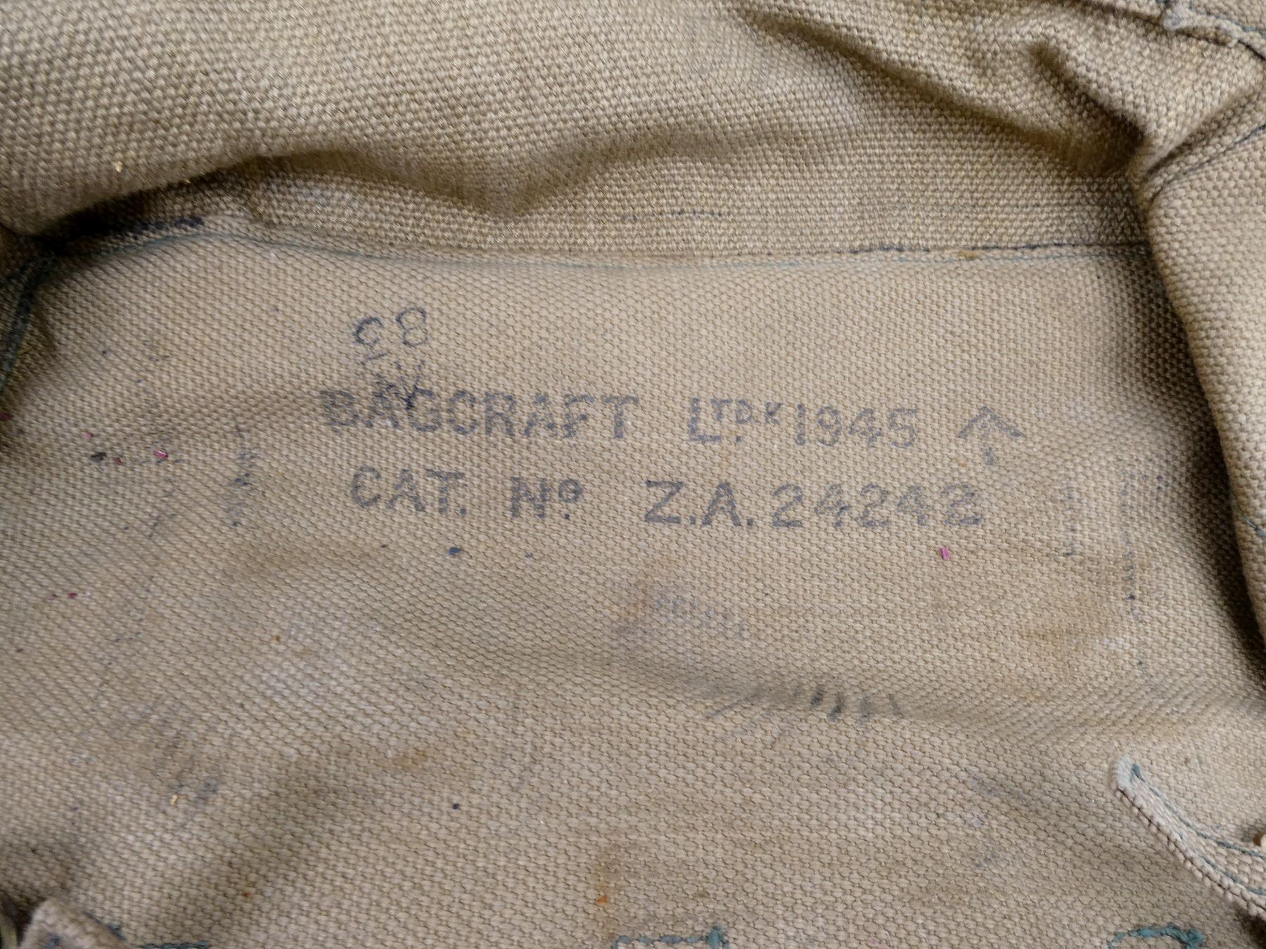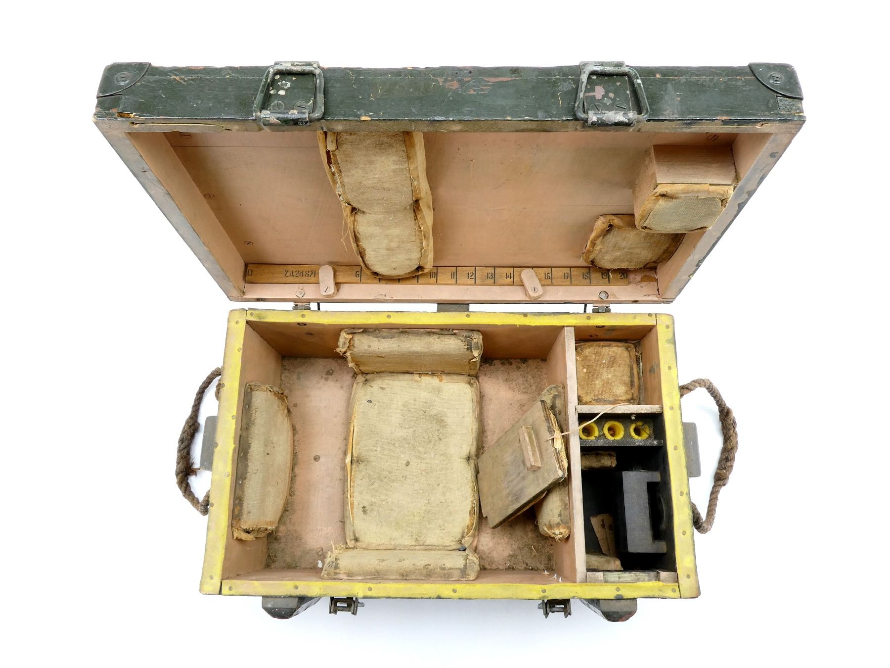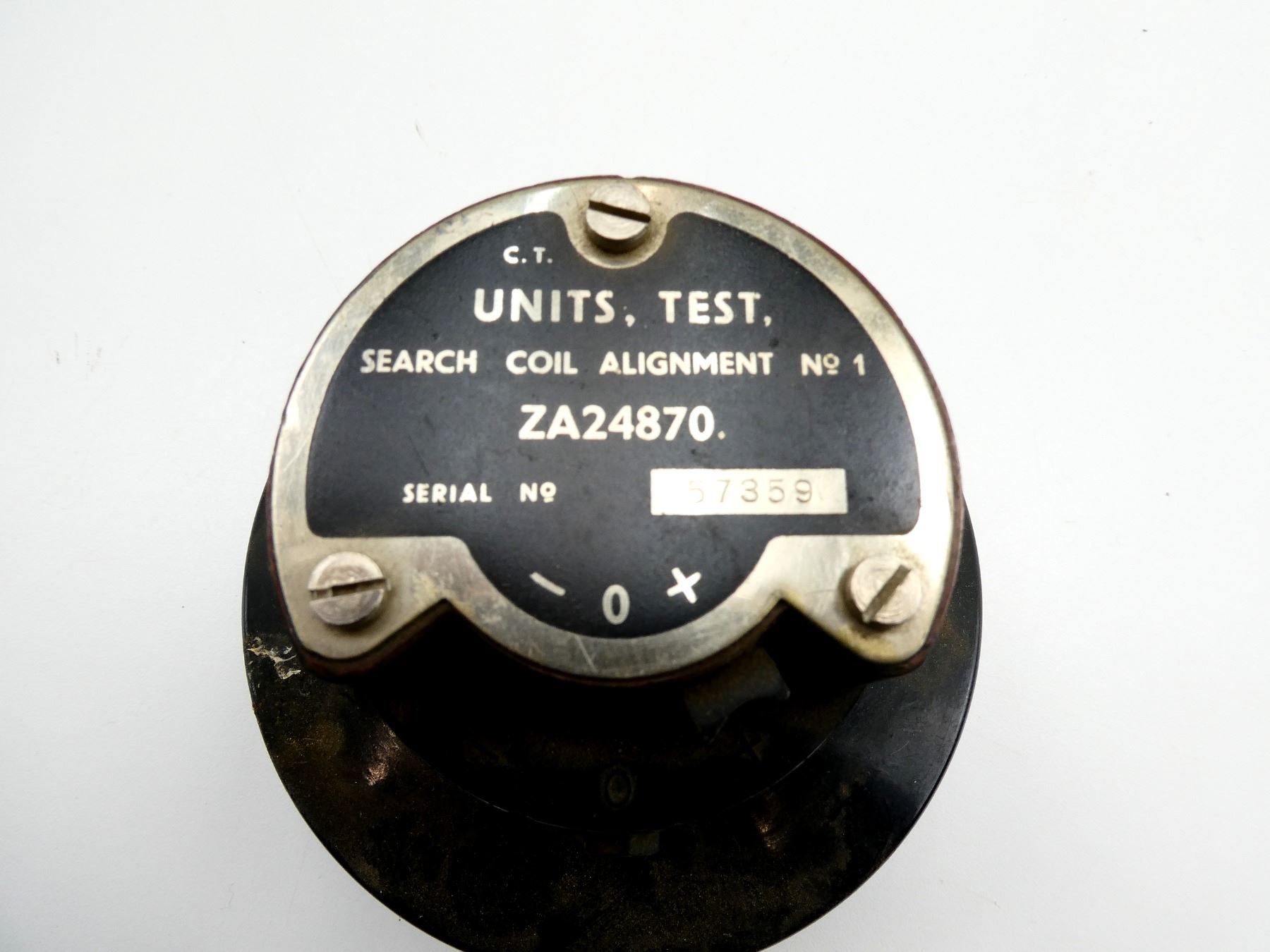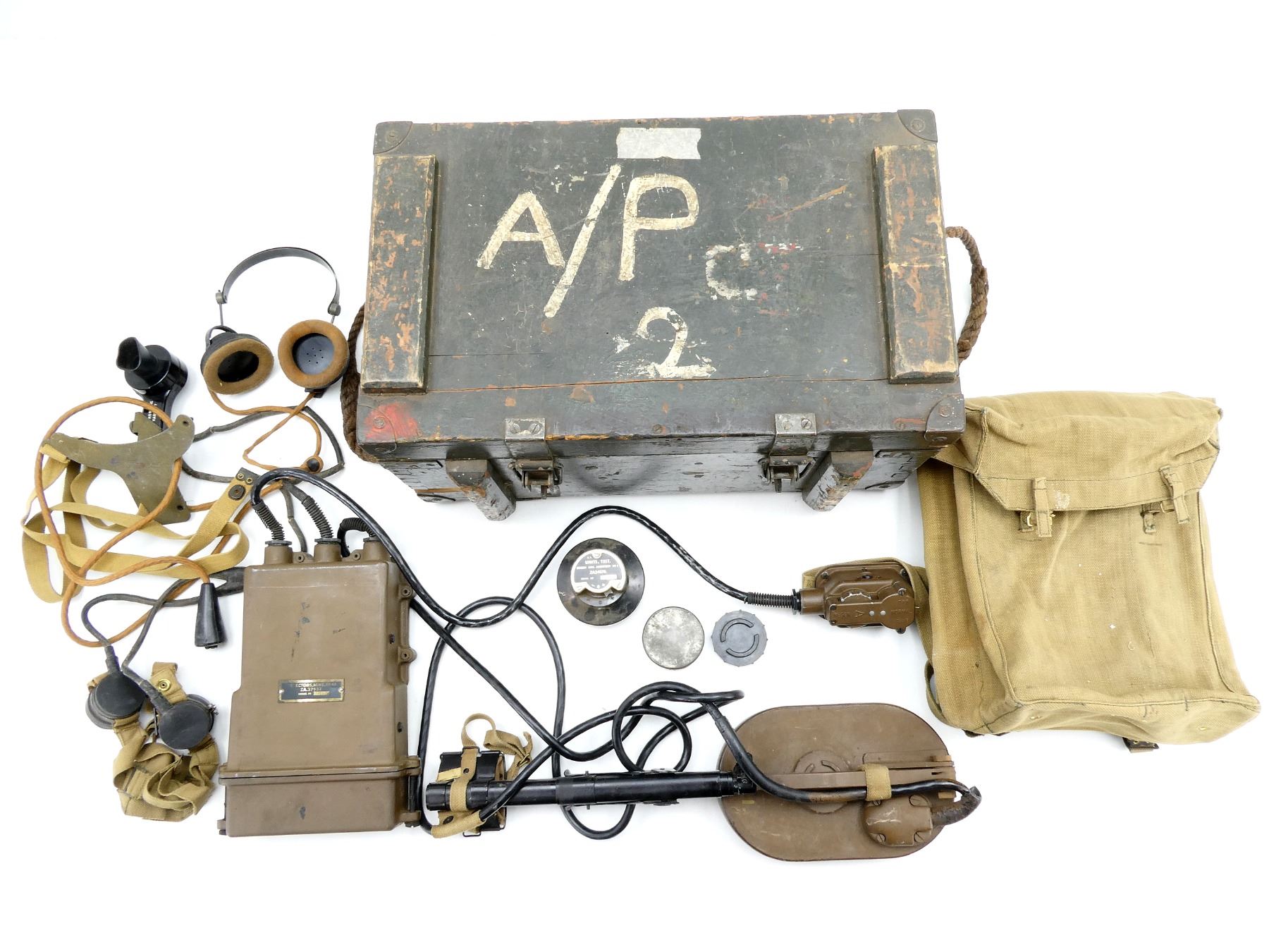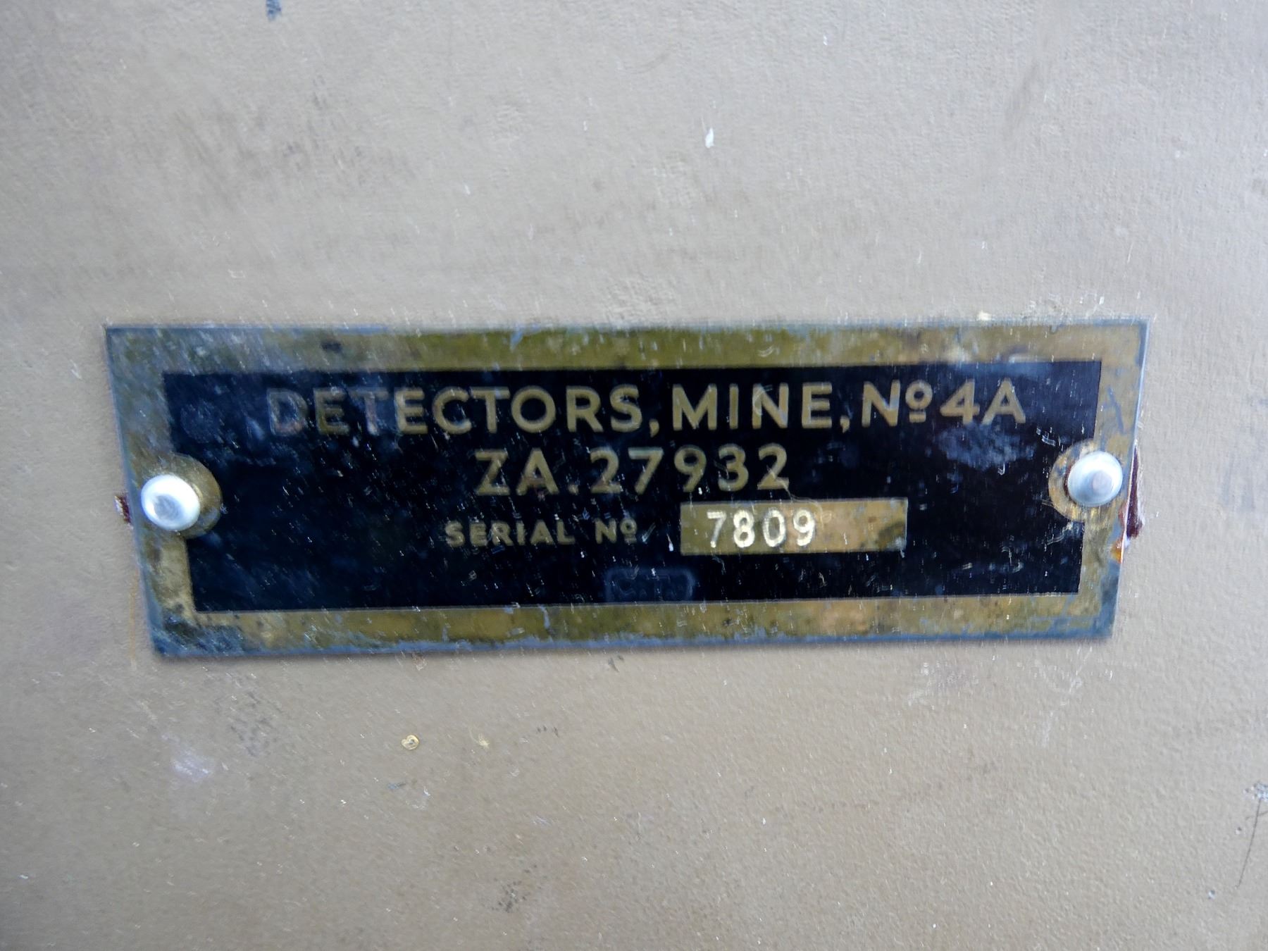 LOT INCLUDES; (1) BROWN PAINTED METAL MINE DETECTOR, WITH RECEIVER MARKED: "DETECTORS, MINE, NO.4, Z.A. 27932, SERIAL NO. 7809, C.T.", KING'S CROWN OVER "R480" & VARIOUS OTHER MARKINGS, VARIOUS CONNECTOR CABLES, SWITCH BOX WITH CONTROLS, (1) TEST SEARCH COIL UNIT MARKED: "C.T. UNITS, TEST, SEARCH COIL ALIGNMENT NO. 1, ZA24870, SERIAL NO. 57359", (1) SET OF EARPHONES WITH TAN CANVAS HEAD & CHIN STRAPS, VARIOUS MARKINGS, SHOWS AGE / WEAR / TEAR, (1) TELESCOPIC DETECTOR POLE, BLACK / BROWN PAINTED, VARIOUS MARKINGS, WITH TAN CANVAS WRIST PADS / STRAP, (1) EXTRA SET OF HEADPHONES / MICROPHONE, MARKED: "MICROPHONE, HAND NO.7" WITH C-BROAD ARROWS, (1) TAN P37 WEB CANVAS HAVERSACK WITH DIVIDERS, MARKED: "BAGCRAFT LTD. K 1945, CAT. NO. Z.A. 24242" WITH BROAD ARROW & (1) GREEN PAINTED CRATE, VARIOUS MARKINGS, PADDED / DIVIDERS INSIDE, ROPE CARRY HANDLES, APPROX. 25.5" X 16" X 12.5". SEE PHOTOS.
