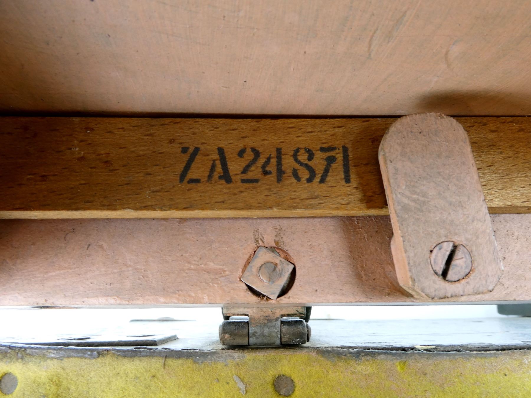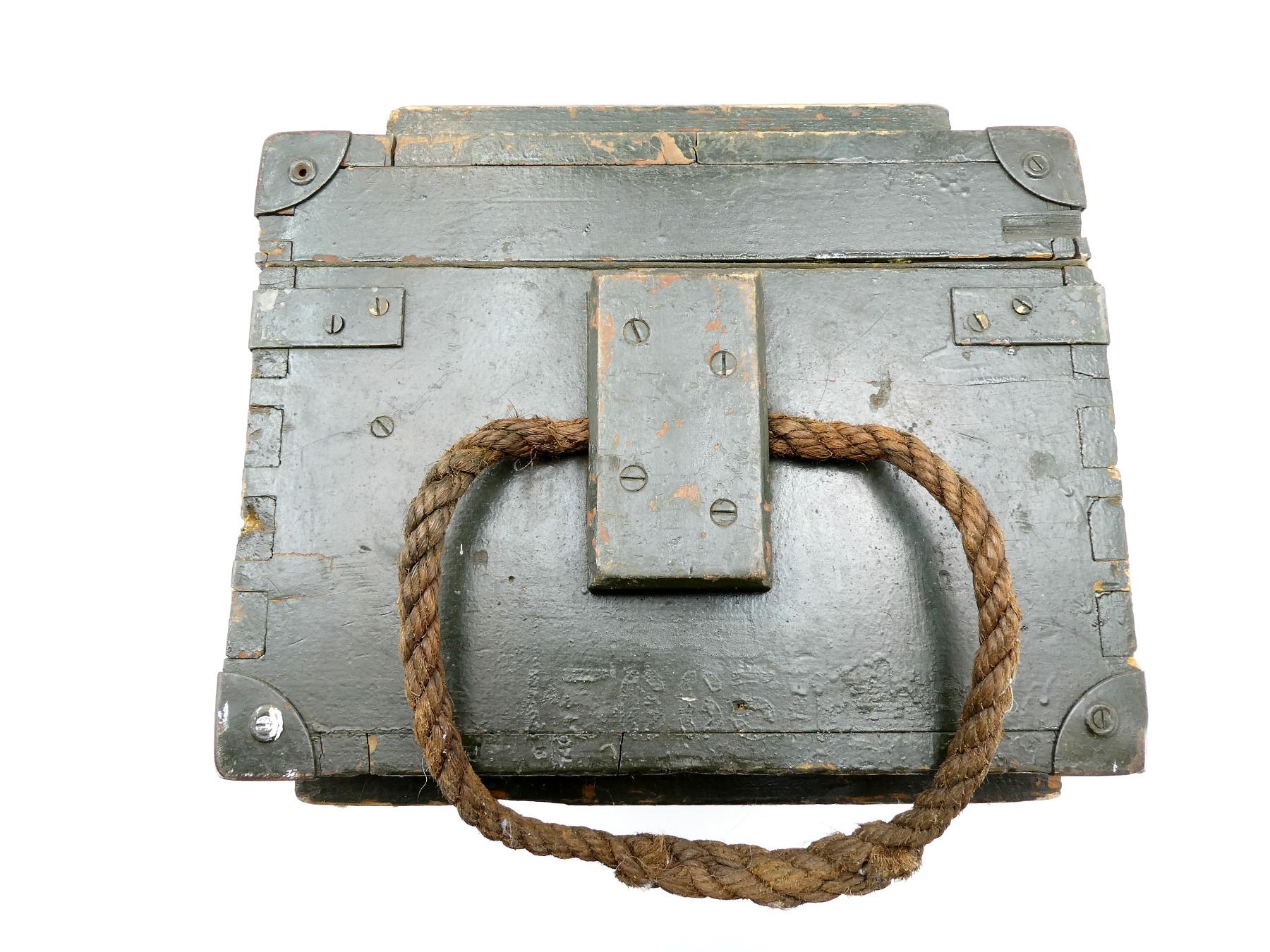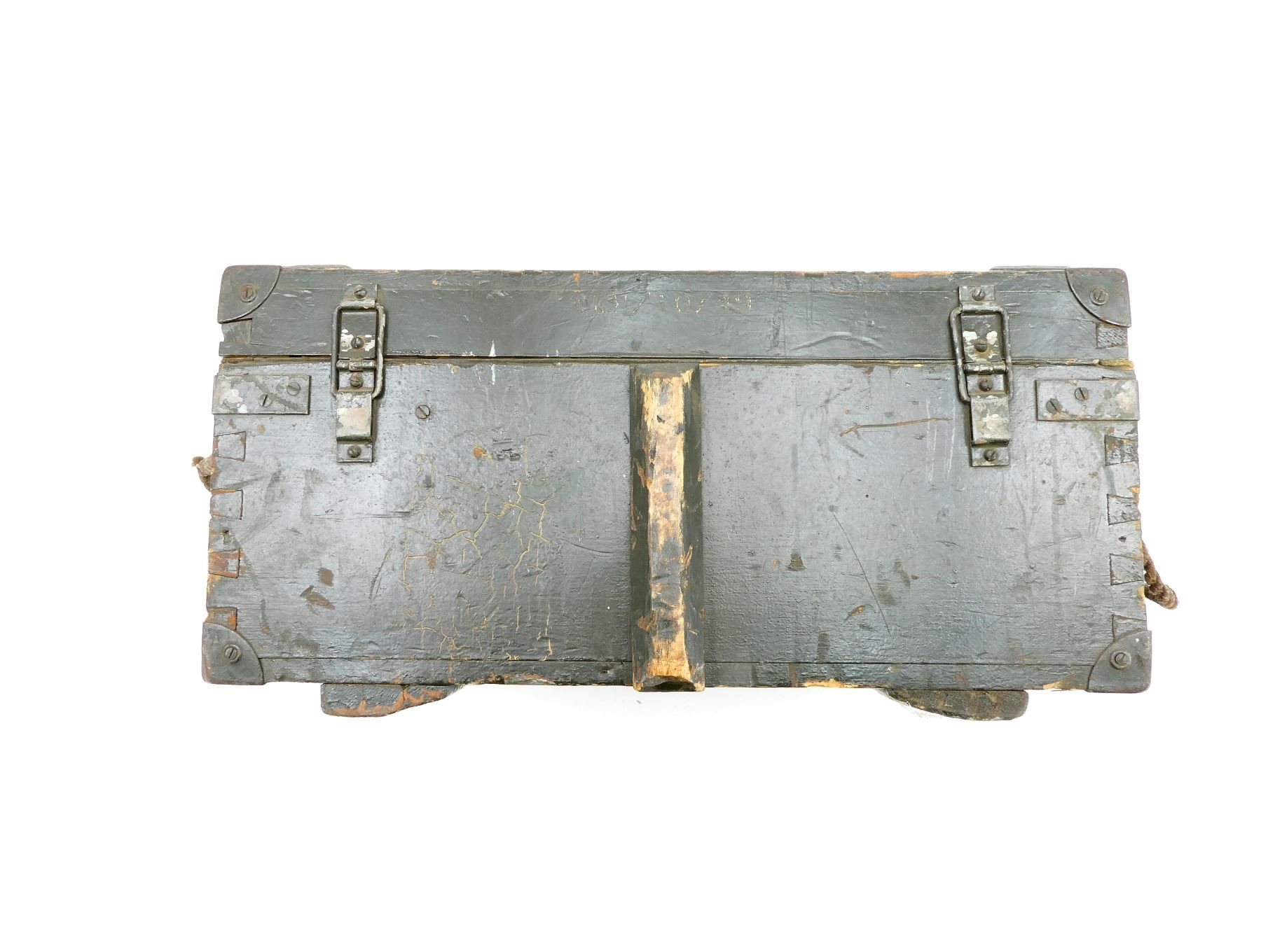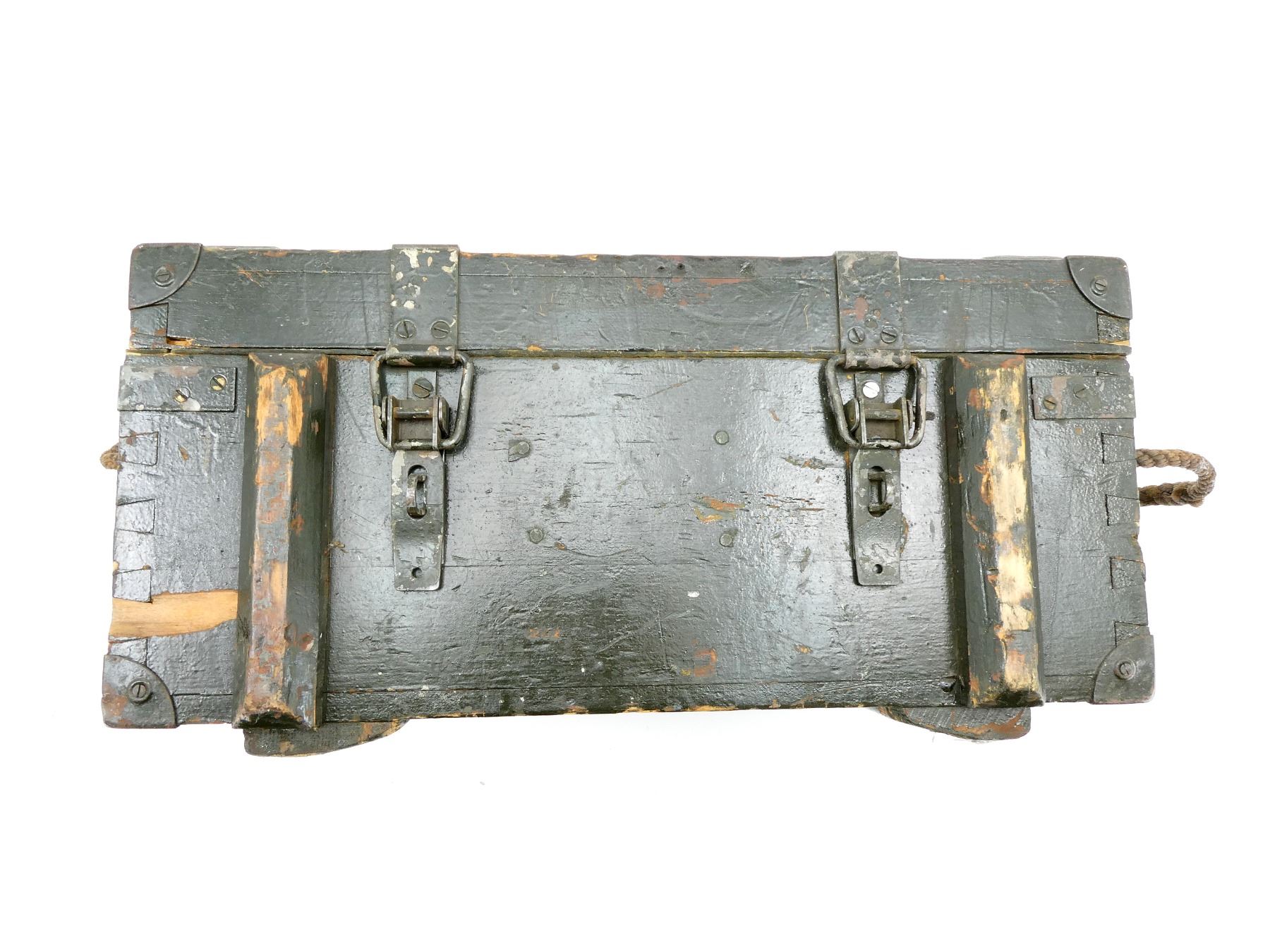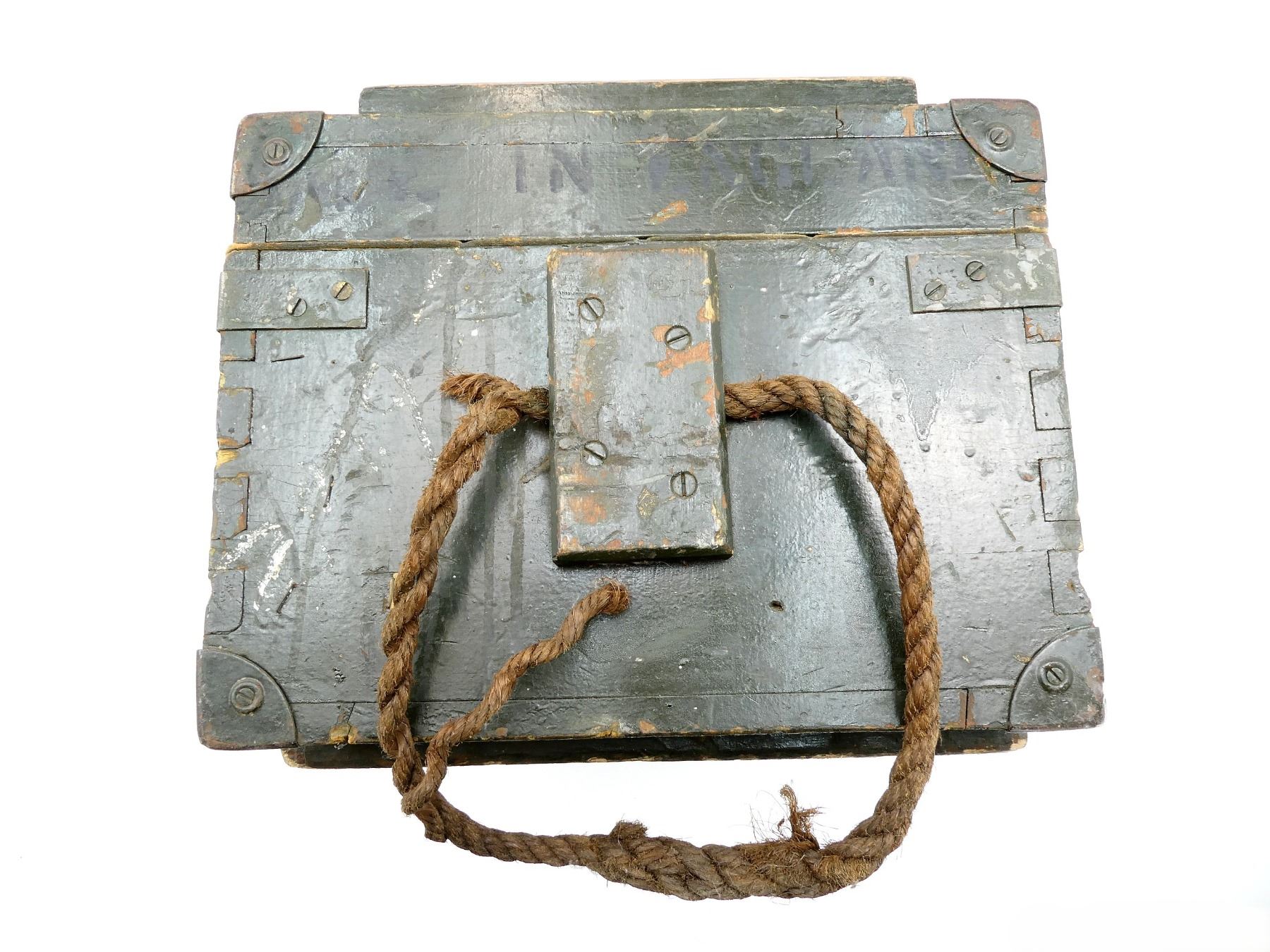 LOT INCLUDES; (1) BROWN PAINTED METAL MINE DETECTOR, WITH RECEIVER MARKED: "DETECTORS, MINE, NO.4, Z.A. 27932, SERIAL NO. 7809, C.T.", KING'S CROWN OVER "R480" & VARIOUS OTHER MARKINGS, VARIOUS CONNECTOR CABLES, SWITCH BOX WITH CONTROLS, (1) TEST SEARCH COIL UNIT MARKED: "C.T. UNITS, TEST, SEARCH COIL ALIGNMENT NO. 1, ZA24870, SERIAL NO. 57359", (1) SET OF EARPHONES WITH TAN CANVAS HEAD & CHIN STRAPS, VARIOUS MARKINGS, SHOWS AGE / WEAR / TEAR, (1) TELESCOPIC DETECTOR POLE, BLACK / BROWN PAINTED, VARIOUS MARKINGS, WITH TAN CANVAS WRIST PADS / STRAP, (1) EXTRA SET OF HEADPHONES / MICROPHONE, MARKED: "MICROPHONE, HAND NO.7" WITH C-BROAD ARROWS, (1) TAN P37 WEB CANVAS HAVERSACK WITH DIVIDERS, MARKED: "BAGCRAFT LTD. K 1945, CAT. NO. Z.A. 24242" WITH BROAD ARROW & (1) GREEN PAINTED CRATE, VARIOUS MARKINGS, PADDED / DIVIDERS INSIDE, ROPE CARRY HANDLES, APPROX. 25.5" X 16" X 12.5". SEE PHOTOS.