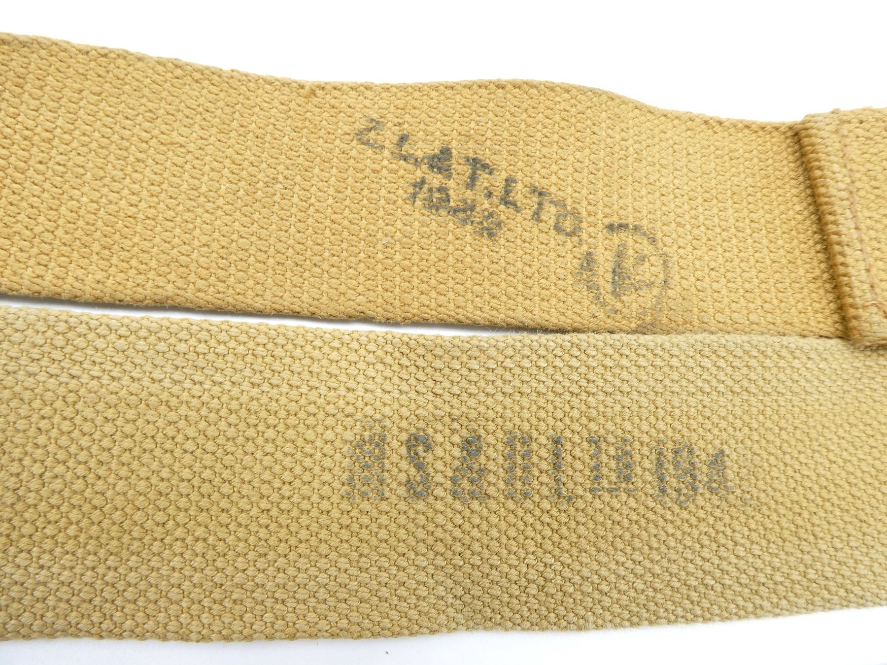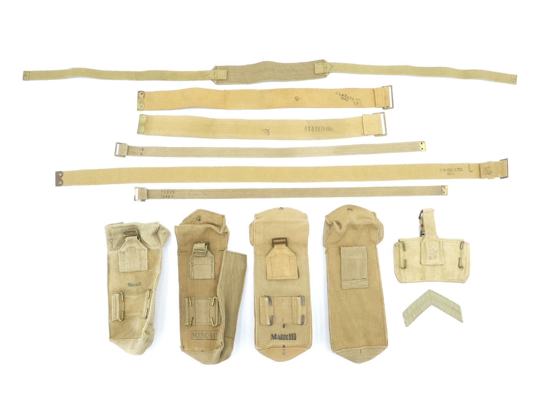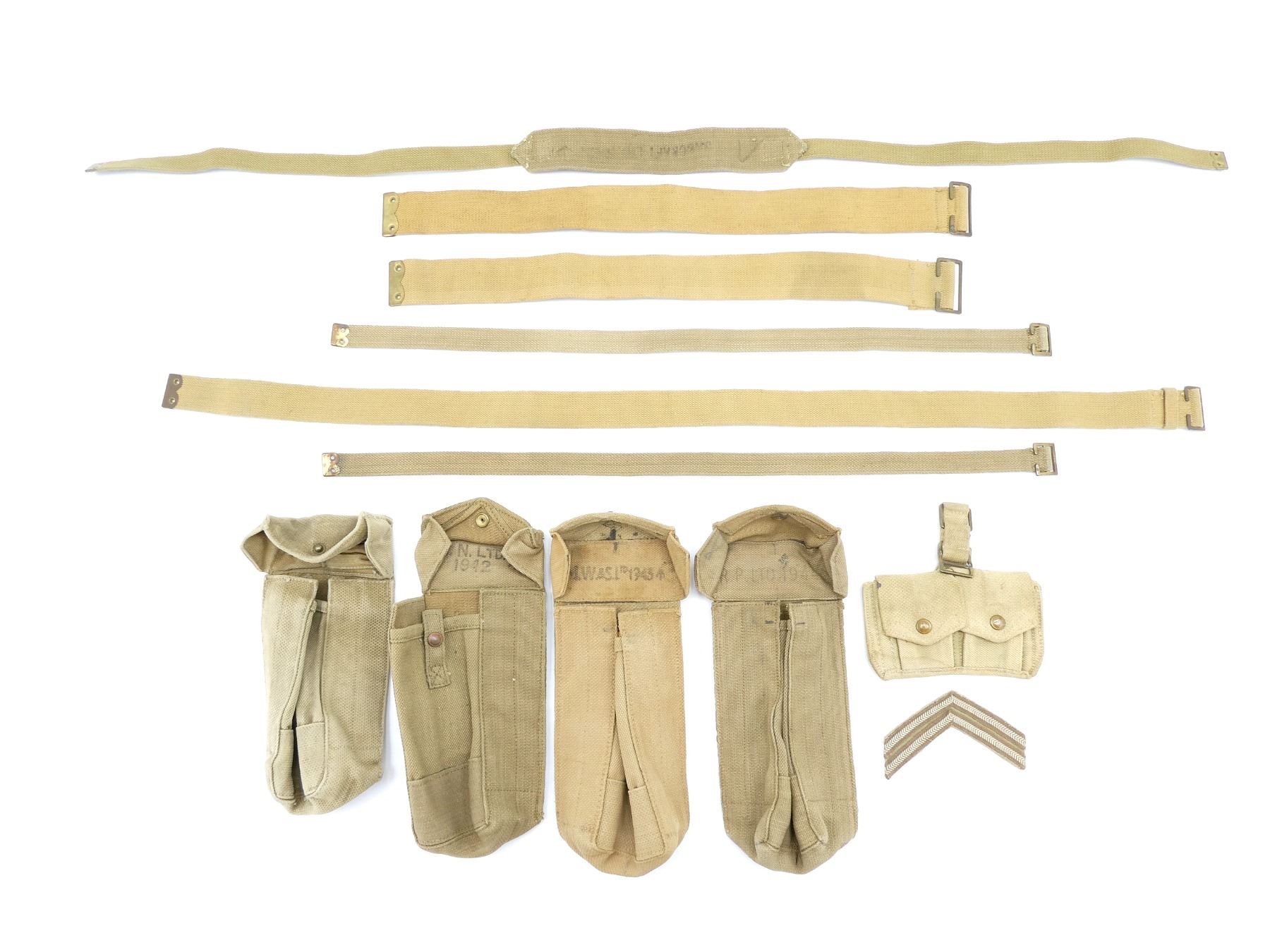 LOT INCLUDES; (1) CANADIAN TAN P37 WEB SMALL BASIC POUCH, MARKED: "Z.L.&T.LTD, 1941" WITH C-BROAD ARROW, SHOWS AGE / WEAR, (2) BRITISH TAN P37 WEB MARK III BASIC POUCHES, ONE MARKED: "S.N. LTD., 1942" WITH BROAD ARROW & "MARK III", OTHER MARKED: "M.W.&S. LTD., 1943" WITH BROAD ARROW & "MARK III", SHOWS SOME WEAR, (1) BRITISH TAN P37 WEB DRIVER'S BASIC POUCH, MARKED: "R.P. LTD. 1944" WITH BROAD ARROW, (1) CANADIAN TAN P37 WEB RIFLE AMMO POUCH WITH BELT HOOKS, FAINT C-BROAD ARROW ON BACK, (1) BRITISH TAN P37 WEB SHOULD STRAP, FAINTLY MARKED: "BAGCRAFT ??? ????" WITH FAINT BROAD ARROW, OAL APPROX. 50.25", (3) CANADIAN TAN P37 WEB LARGE EQUIPMENT STRAPS, ONE MARKED: "D. R. CO. LTD., 1943, L" WITH C-BROAD ARROW, ONE MARKED: "MS&N LTD, 194?" WITH C-BROAD ARROW, LAST MARKED: "Z.L.&T. LTD., 194?" WITH C-BROAD ARROW, OALS APPROX. 24" TO 43 3/8", (2) BRITISH TAN P37 WEB SMALL EQUIPMENT STRAPS, BOTH MARKED: "H&S LTD, 1940" WITH BROAD ARROW, OALS APPROX. 30" & (1) CANADIAN / BRITISH CORPORAL'S RANK CHEVRON. SEE PHOTOS.