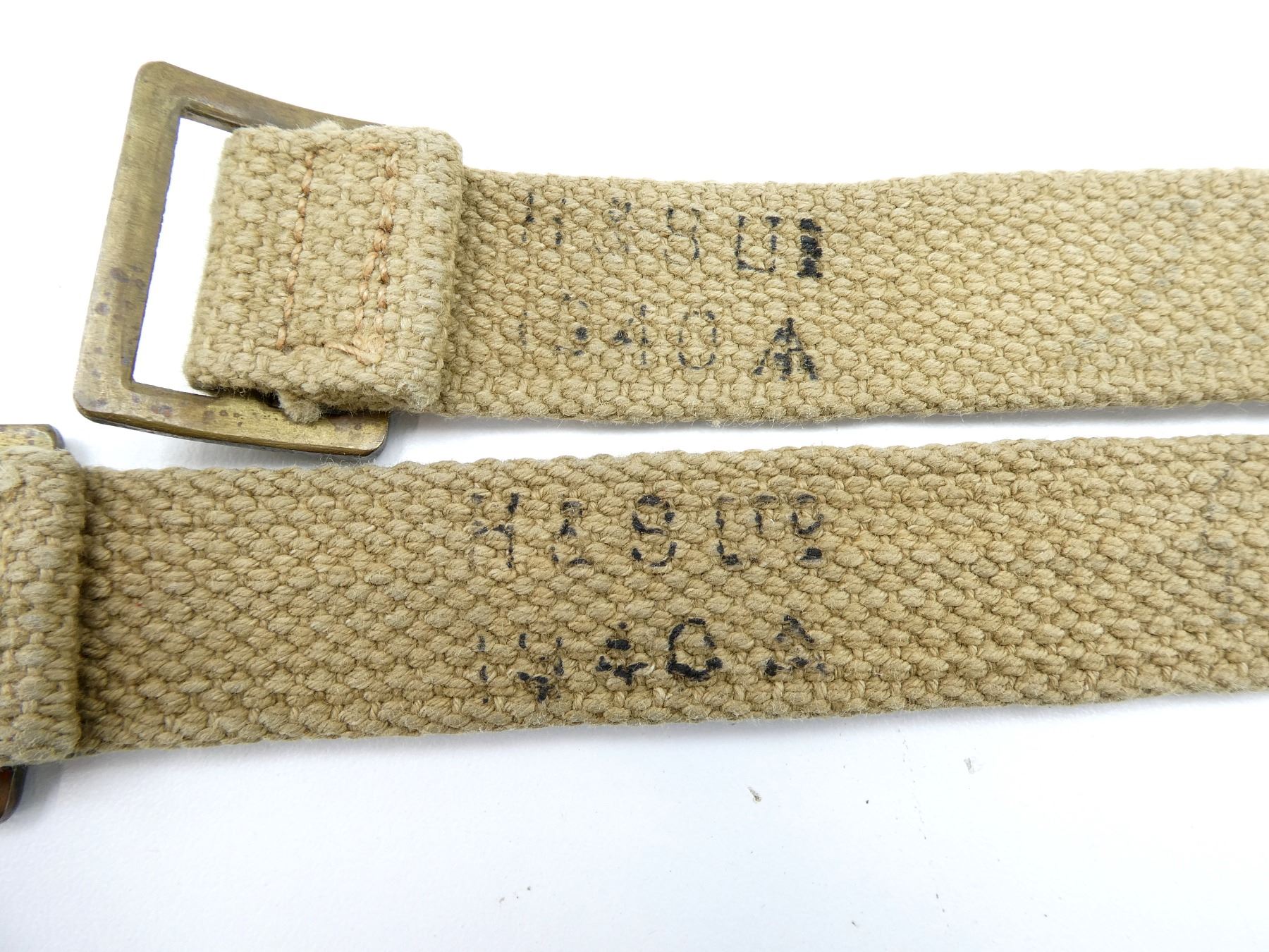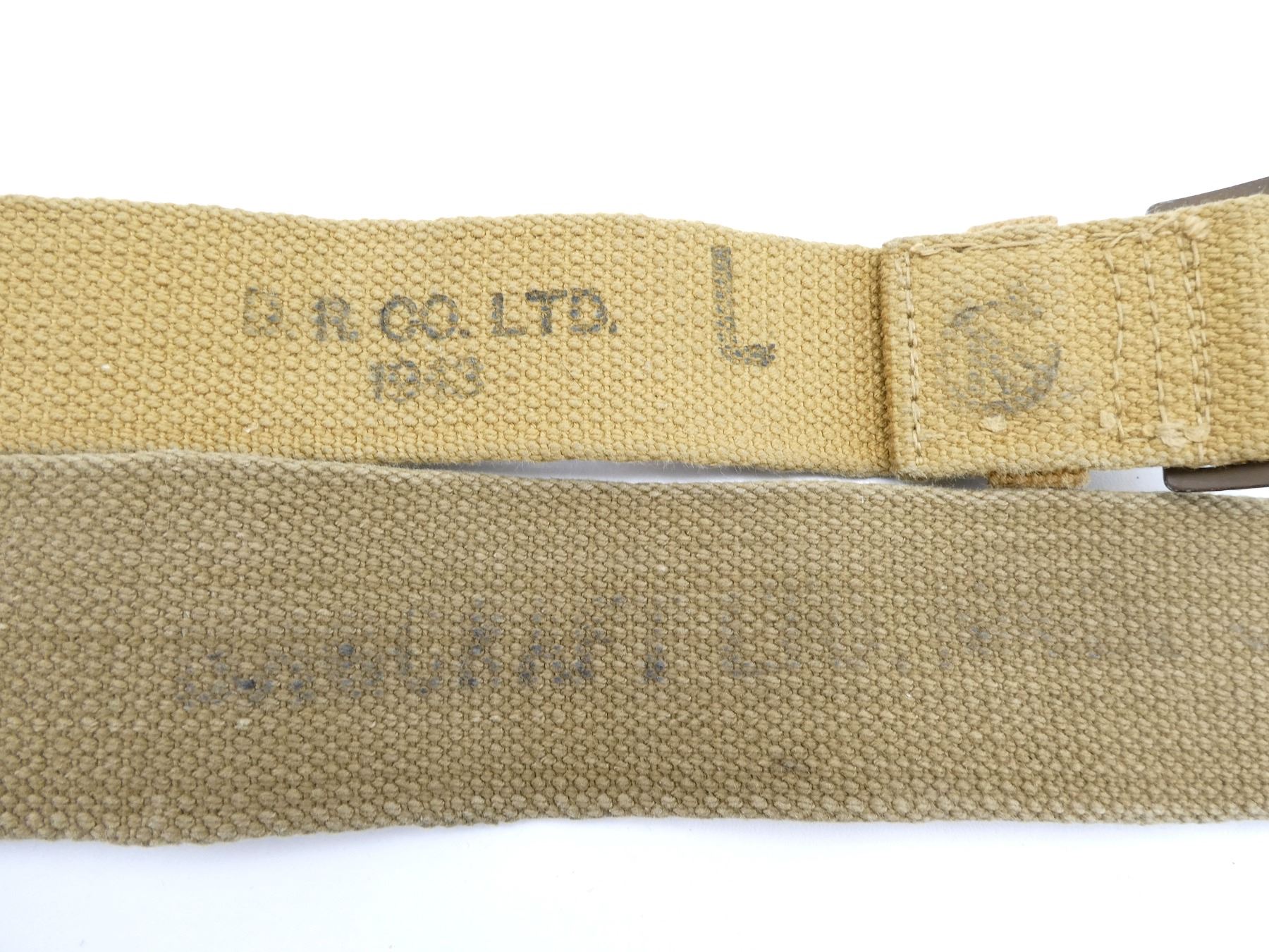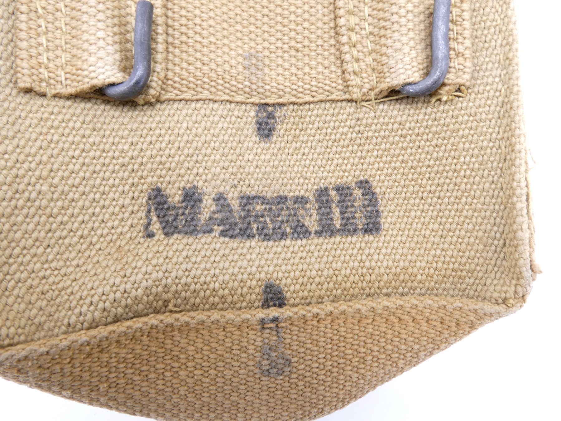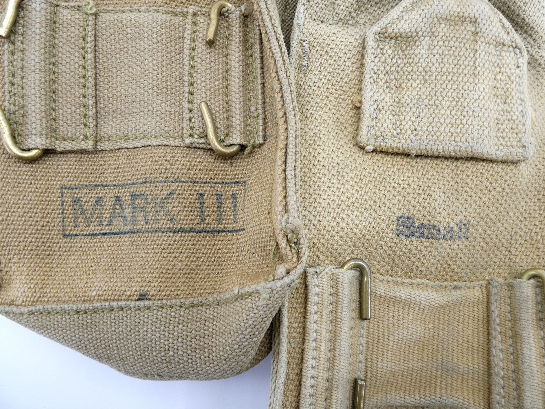 LOT INCLUDES; (1) CANADIAN TAN P37 WEB SMALL BASIC POUCH, MARKED: "Z.L.&T.LTD, 1941" WITH C-BROAD ARROW, SHOWS AGE / WEAR, (2) BRITISH TAN P37 WEB MARK III BASIC POUCHES, ONE MARKED: "S.N. LTD., 1942" WITH BROAD ARROW & "MARK III", OTHER MARKED: "M.W.&S. LTD., 1943" WITH BROAD ARROW & "MARK III", SHOWS SOME WEAR, (1) BRITISH TAN P37 WEB DRIVER'S BASIC POUCH, MARKED: "R.P. LTD. 1944" WITH BROAD ARROW, (1) CANADIAN TAN P37 WEB RIFLE AMMO POUCH WITH BELT HOOKS, FAINT C-BROAD ARROW ON BACK, (1) BRITISH TAN P37 WEB SHOULD STRAP, FAINTLY MARKED: "BAGCRAFT ??? ????" WITH FAINT BROAD ARROW, OAL APPROX. 50.25", (3) CANADIAN TAN P37 WEB LARGE EQUIPMENT STRAPS, ONE MARKED: "D. R. CO. LTD., 1943, L" WITH C-BROAD ARROW, ONE MARKED: "MS&N LTD, 194?" WITH C-BROAD ARROW, LAST MARKED: "Z.L.&T. LTD., 194?" WITH C-BROAD ARROW, OALS APPROX. 24" TO 43 3/8", (2) BRITISH TAN P37 WEB SMALL EQUIPMENT STRAPS, BOTH MARKED: "H&S LTD, 1940" WITH BROAD ARROW, OALS APPROX. 30" & (1) CANADIAN / BRITISH CORPORAL'S RANK CHEVRON. SEE PHOTOS.