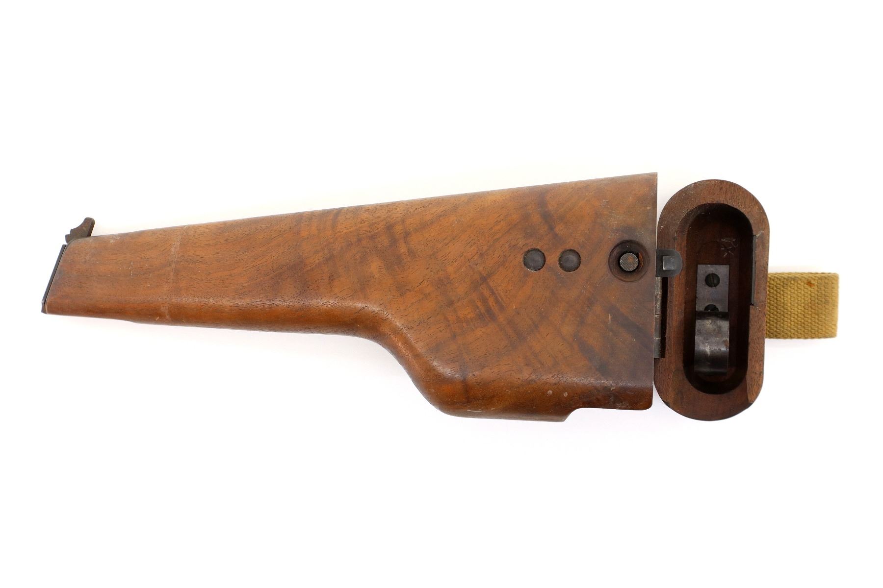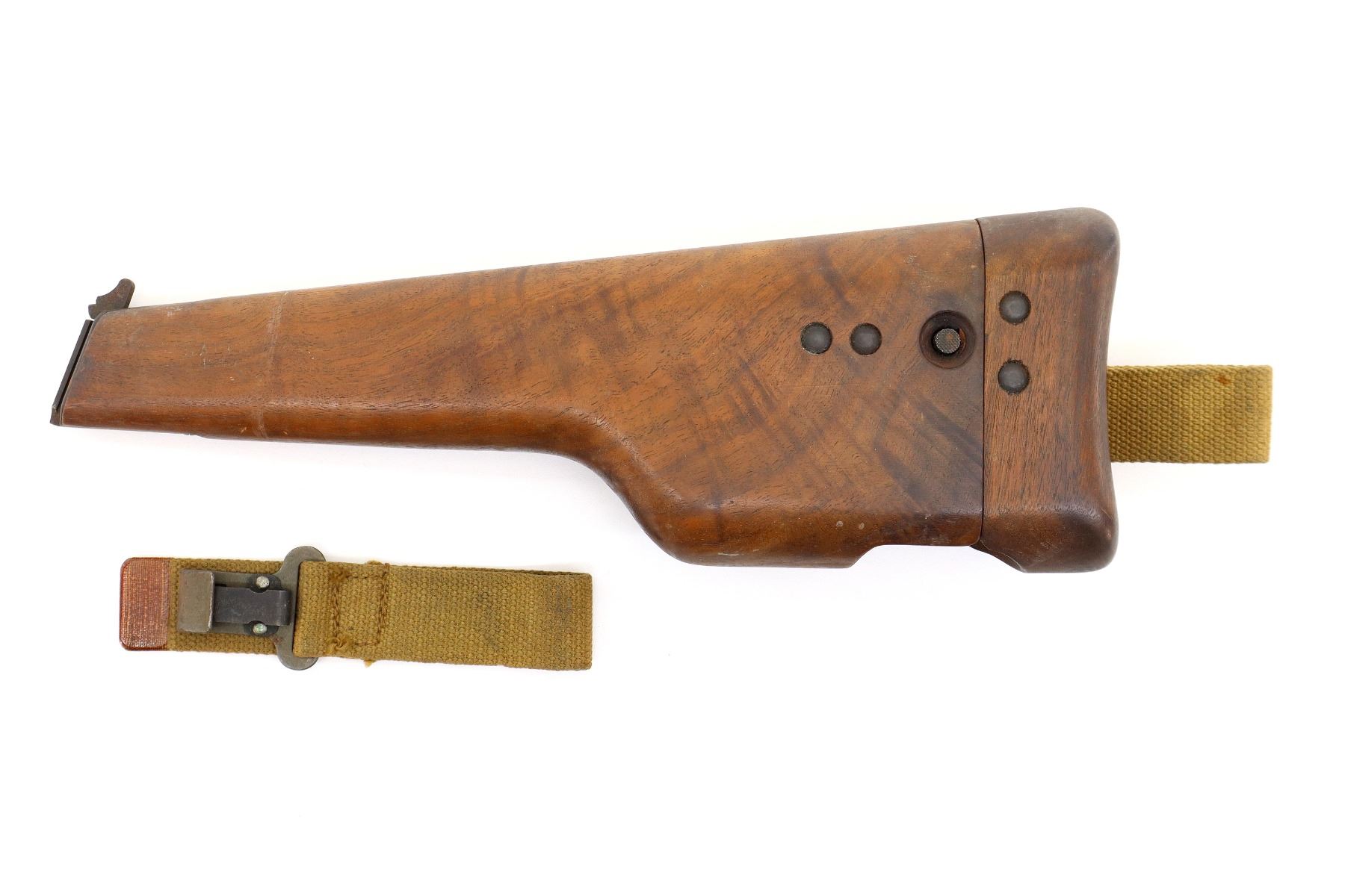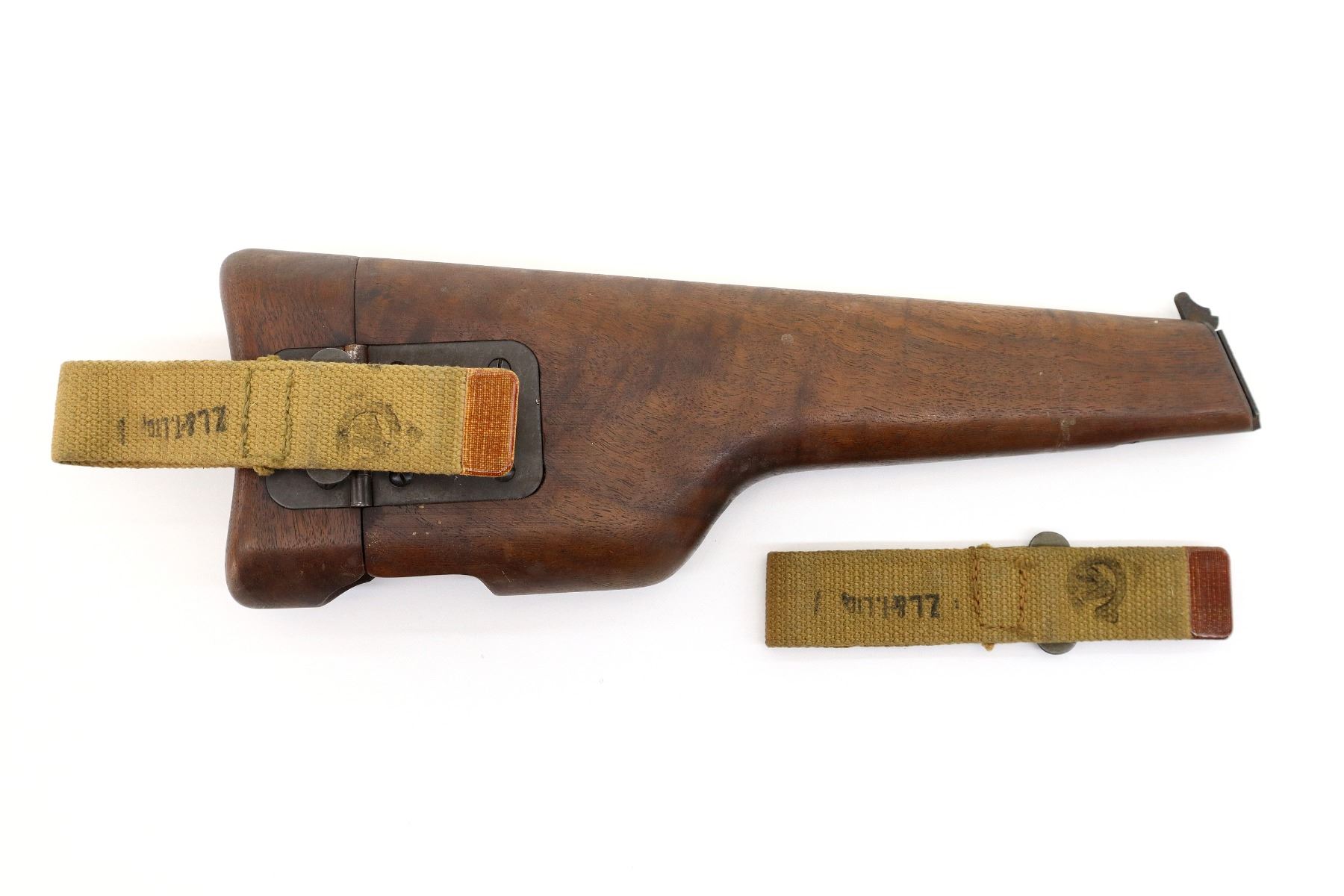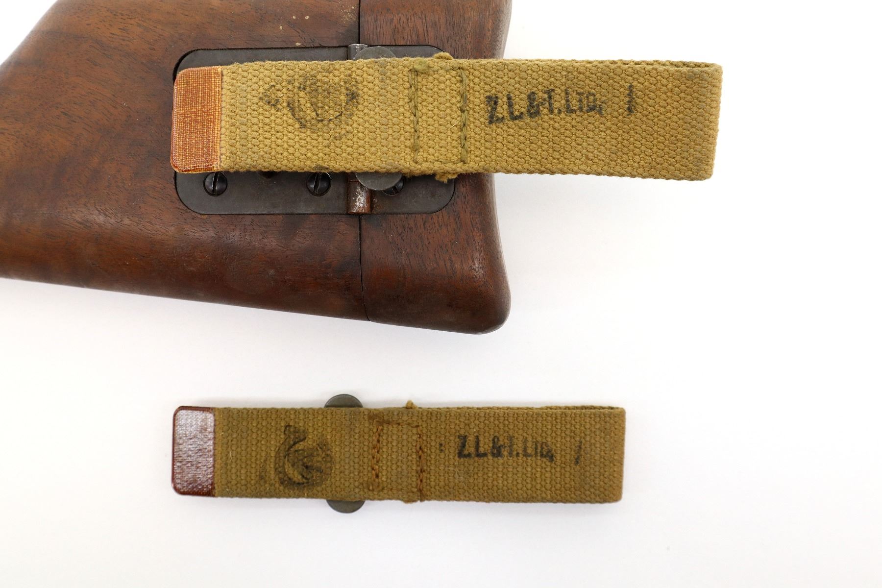 LOT INCLUDES; (1) FITS 9MM MKI & 9MM NO.2 MKI, WOOD, MARKED: "S.A.LTD." OVER "1945", C-BROAD ARROW WITH FAINT "17", CANVAS HANGER MARKED: "Z.L.&T.LTD" WITH C-BROAD ARROW, RELEASE BUTTON TO OPEN HOLSTER & (1) CANVAS HANGER, P37 TAN WEB WITH METAL CLIP, MARKED: "Z.L.&T.LTD. (ZEPHA LOOM & TEXTILES)" & C-BROAD ARROW, OAL APPROX. 6.25". SEE PHOTOS.