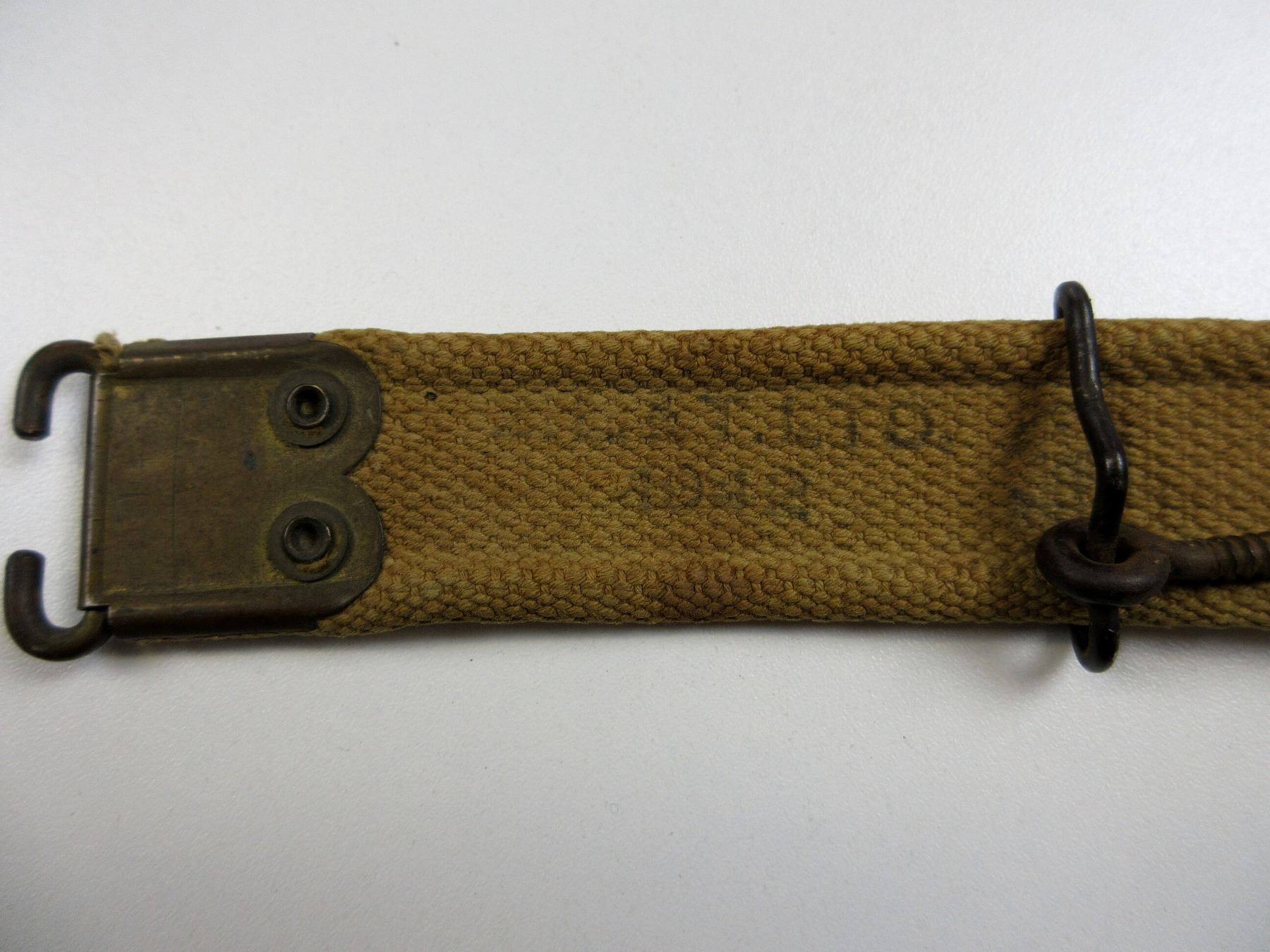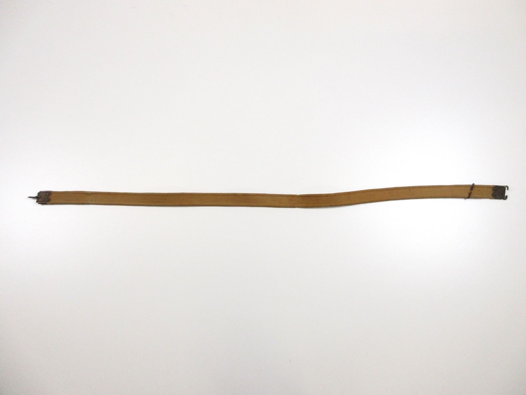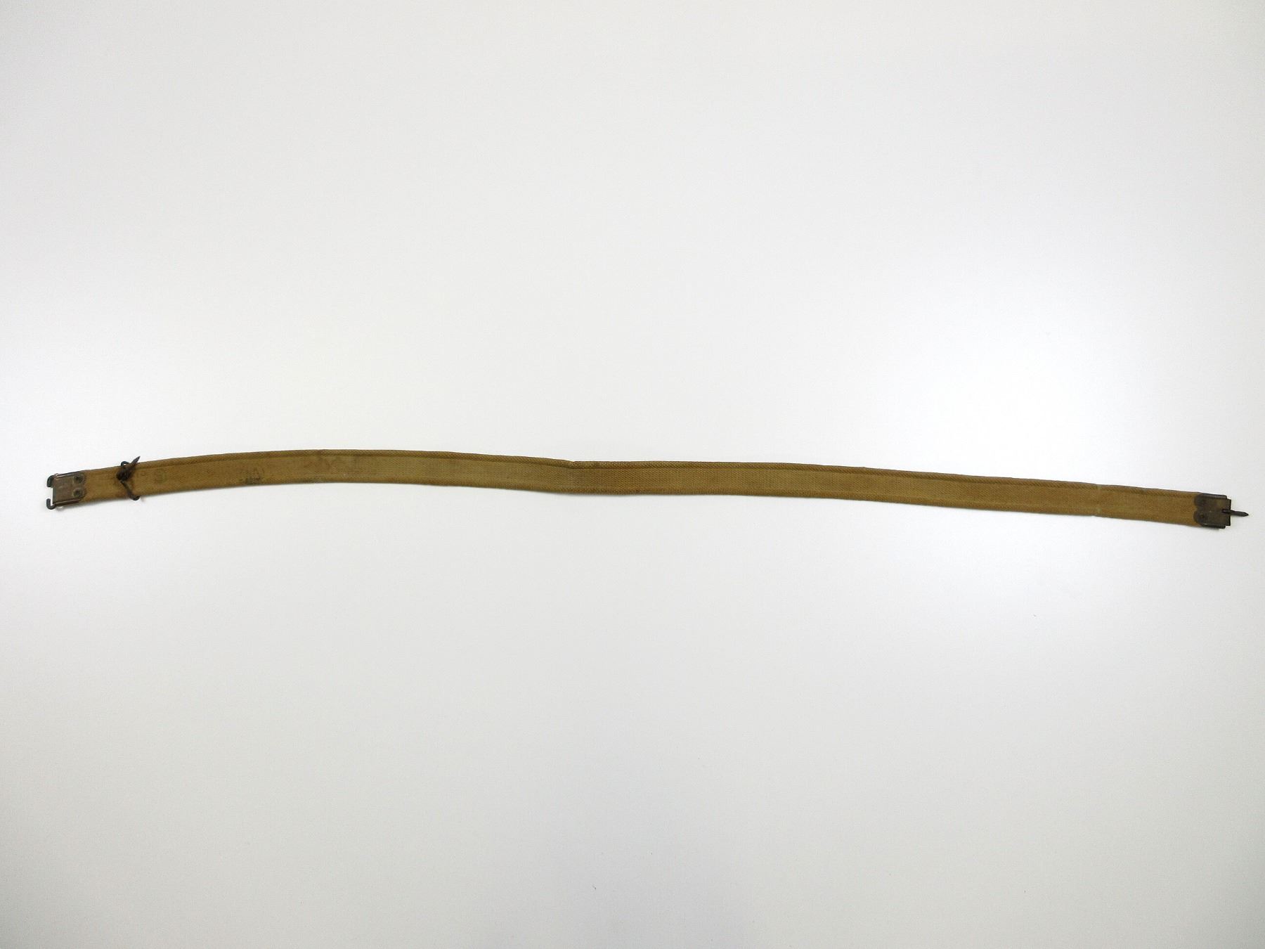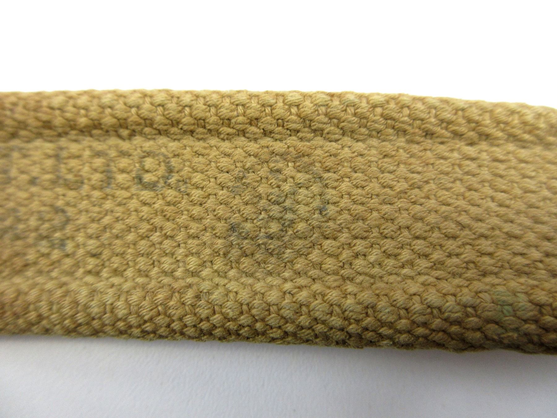 (1) TAN P37 WEB CANVAS SLING, FAINTLY MARKED: "Z.L. & T.LTD, 1942" WITH C-BROAD ARROW & "W" IN A CIRCLE, BRASS / METAL FITTINGS & OAL APPROX. 44.75". SEE PHOTOS.