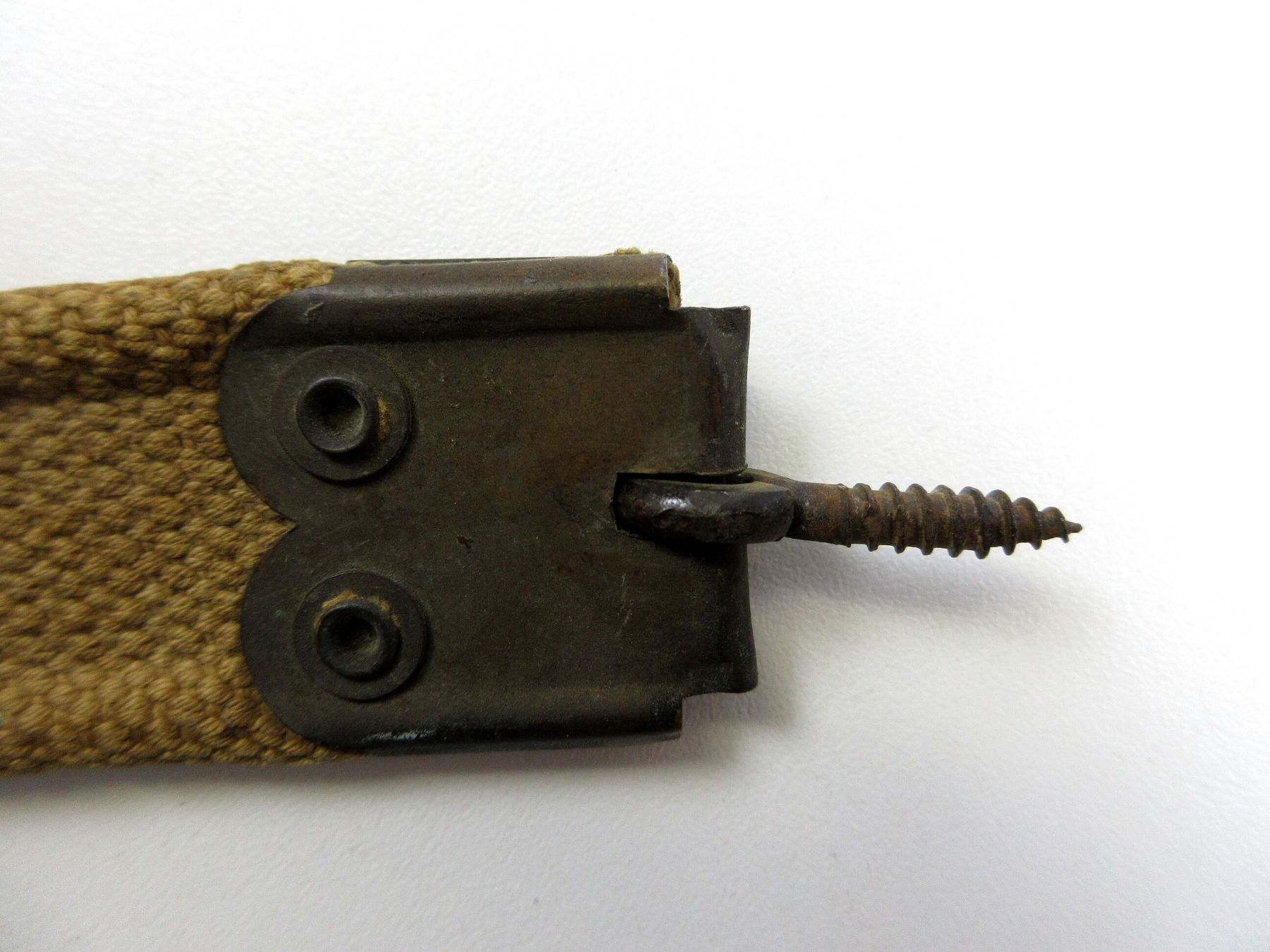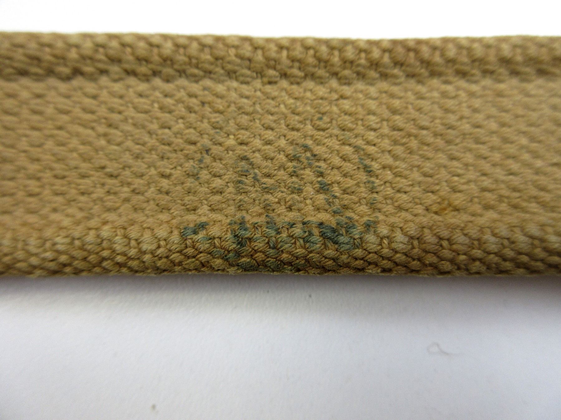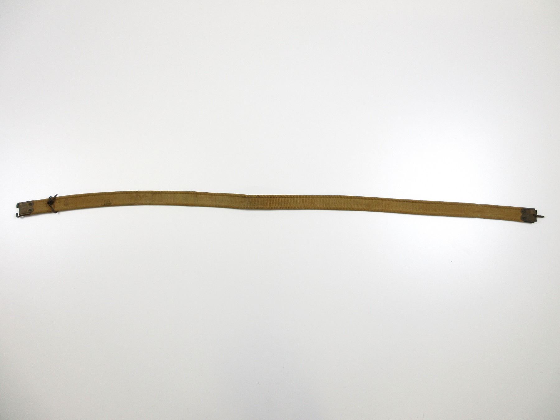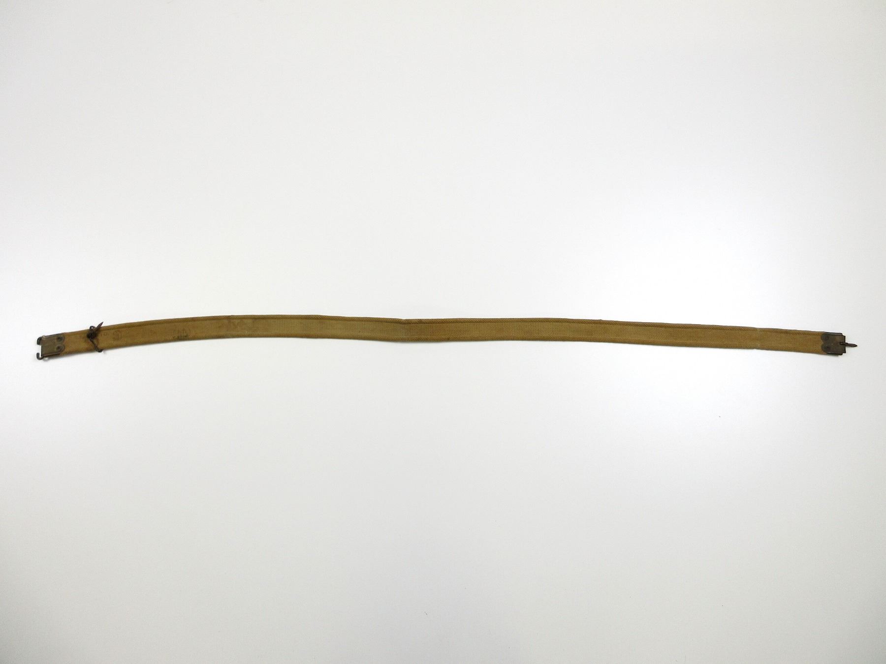 (1) TAN P37 WEB CANVAS SLING, FAINTLY MARKED: "Z.L. & T.LTD, 1942" WITH C-BROAD ARROW & "W" IN A CIRCLE, BRASS / METAL FITTINGS & OAL APPROX. 44.75". SEE PHOTOS.