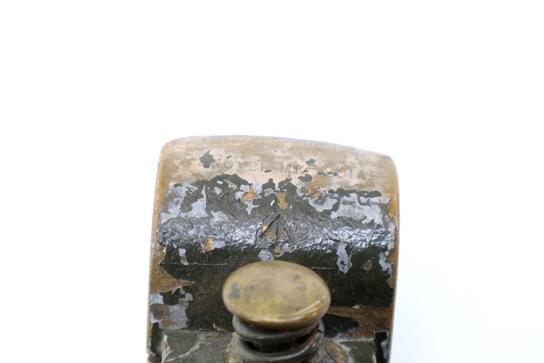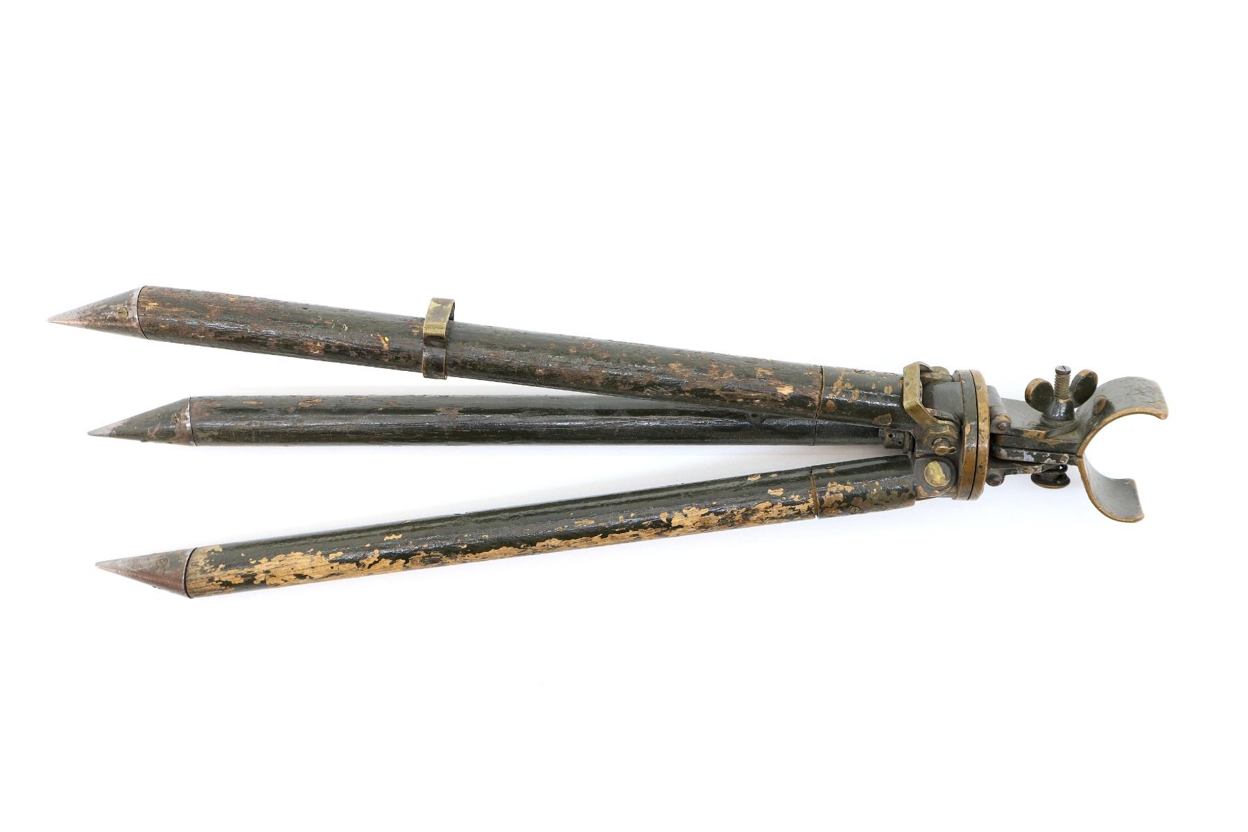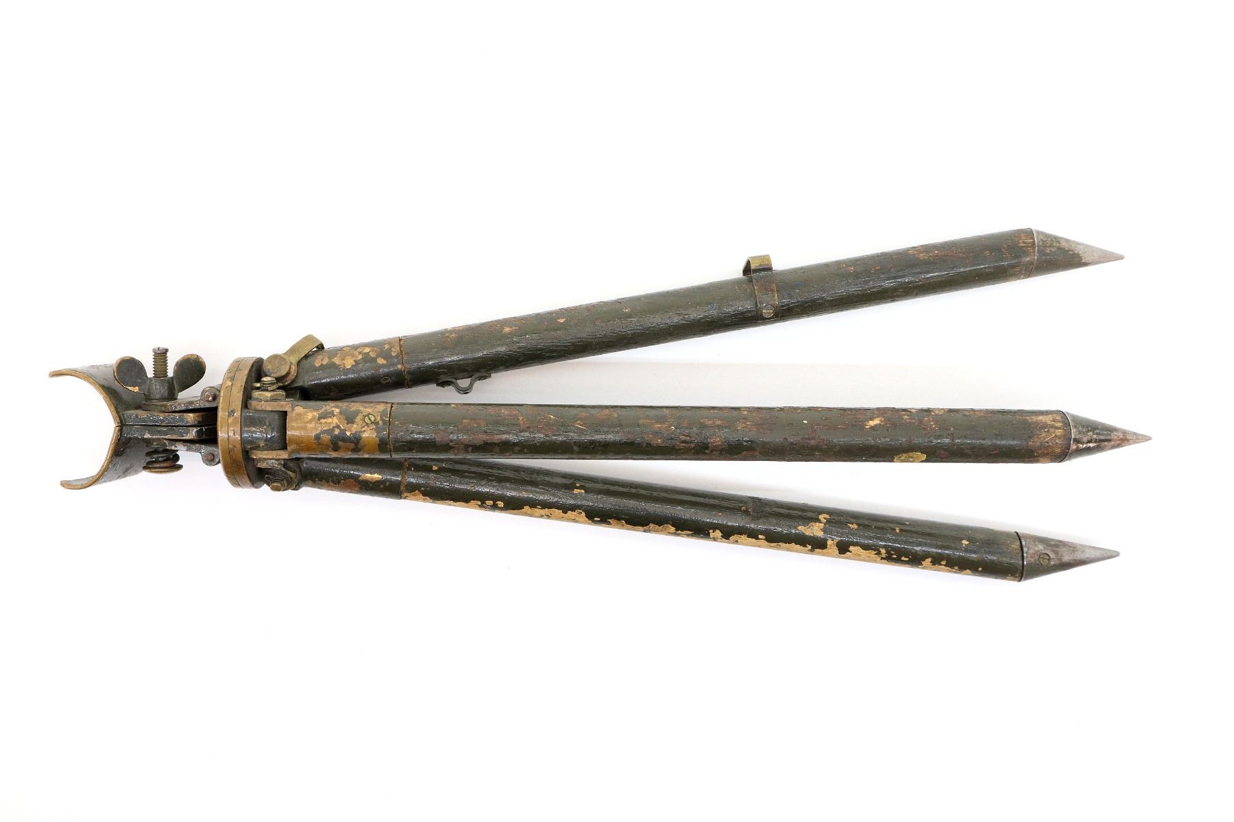 (1) GREEN PAINTED BRASS CLAMP WITH WOOD LEGS, LEGS UNFOLD PROPERLY, CLAMP MARKED: "TRIPOD TELESCOPE, NO.21 MK 5, (C1A1), SERIAL-274-C" WITH BROAD ARROW, OTHER-SIDE MARKED: "R.E.L. / CANADA, 1942", OAL APPROX. 17.75" (FOLDED). SEE PHOTOS.