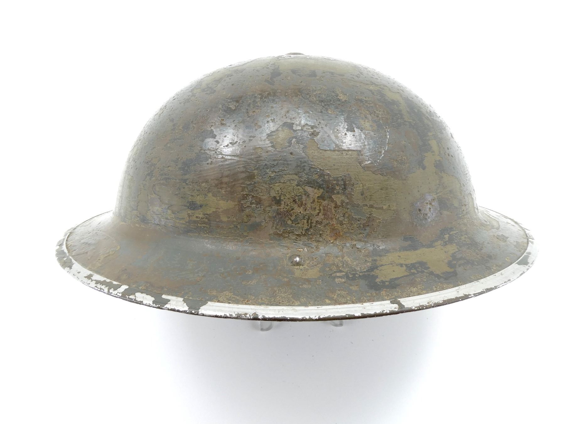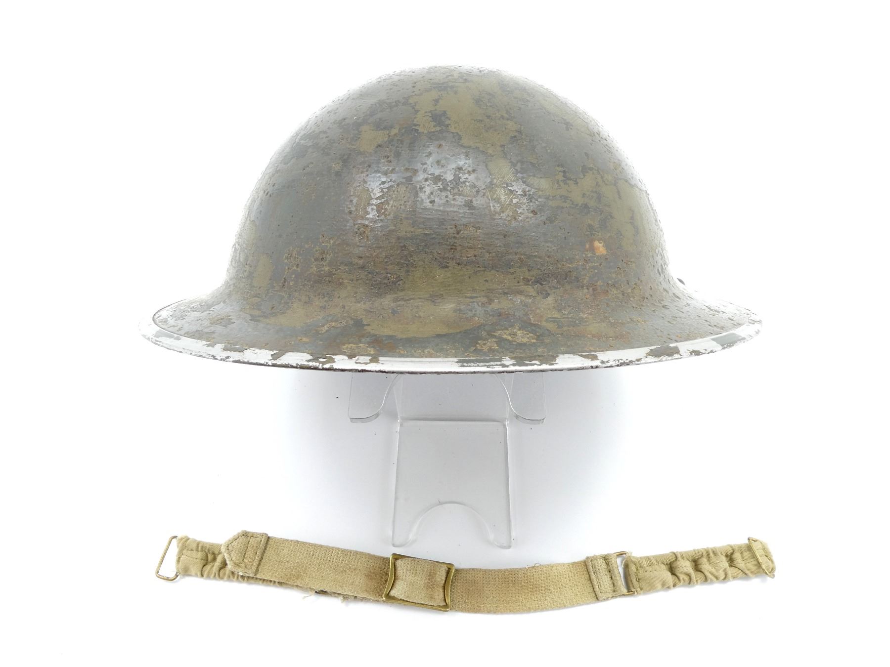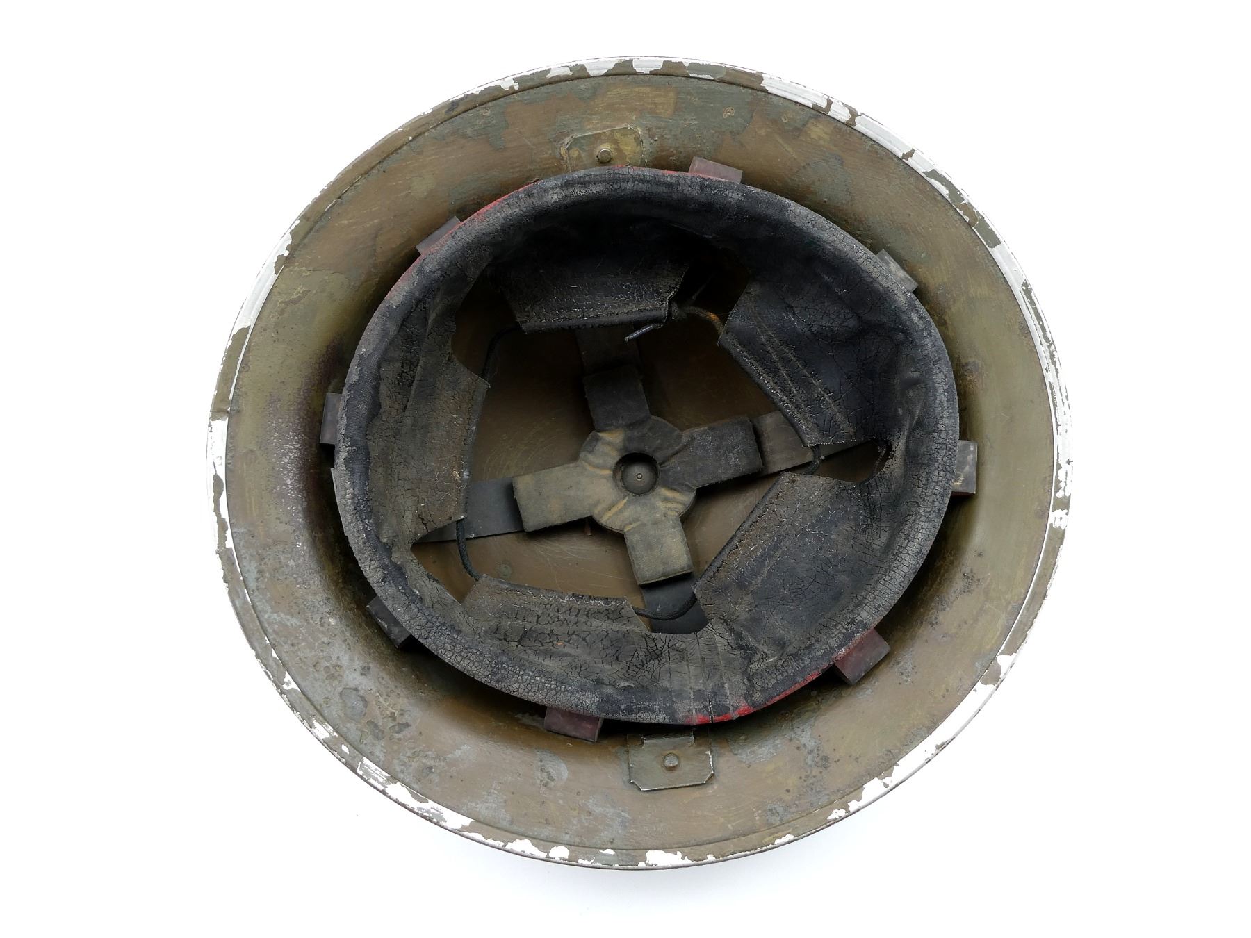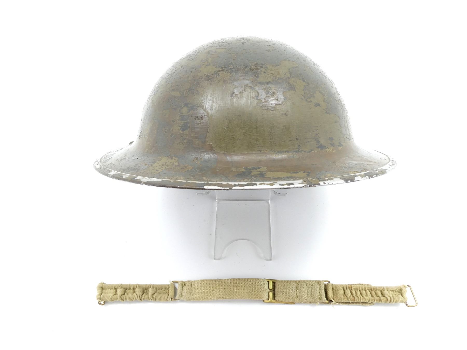 (1) GREEN PAINTED STEEL WITH BLACK HEAD LINER, STIFF / SHOWS WEAR / TEAR, CANVAS & METAL CHIN STRAP, NOT ATTACHED, HELMET MARKED: "C.L./C. (CANADIAN LAMP CO.) 1942" ON FRONT SKIRT, HEAD LINER MARKED: "7 1/2". SEE PHOTOS.