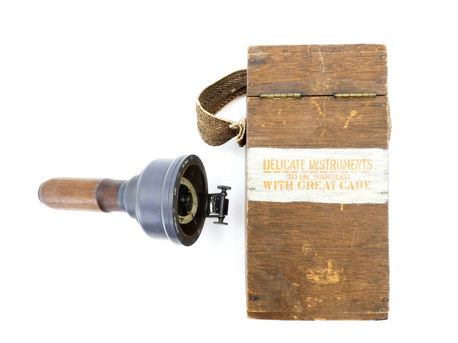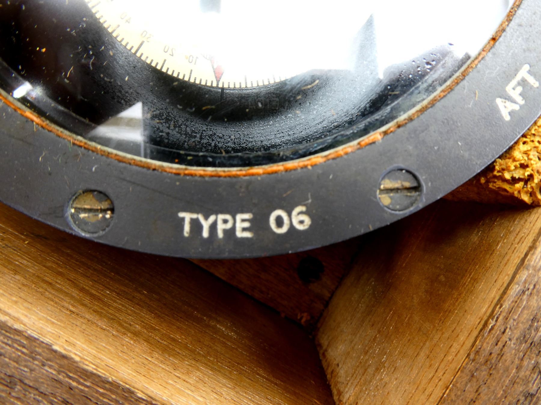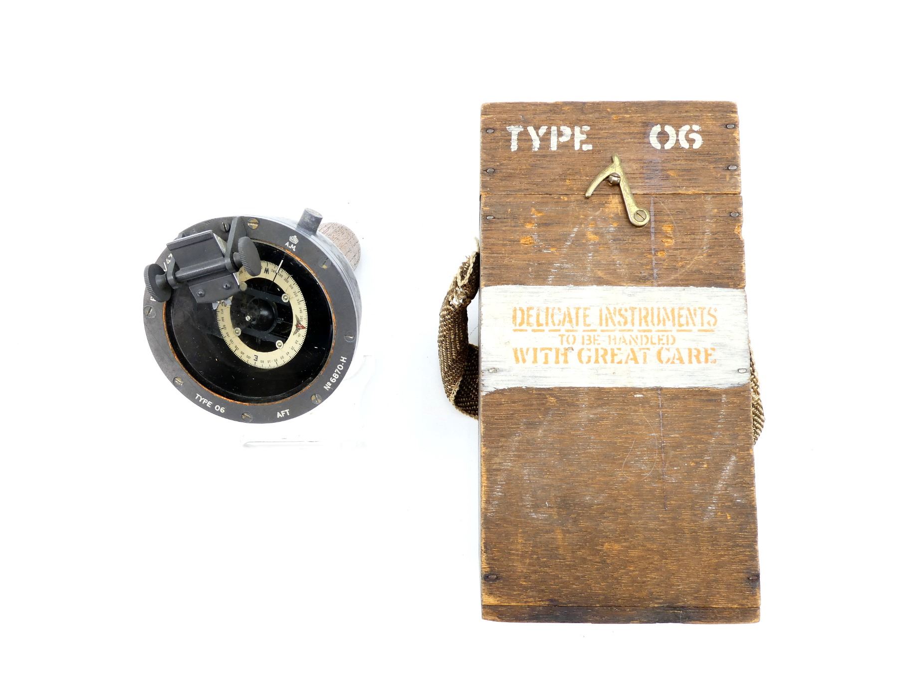 (1) HAND BEARING COMPASS TYPE 06, COMPASS MARKED: "TYPE 06, AFT, NO. 6870.H", CROWN OVER "A.M.", "REF. NO 6A/473", GREY PAINTED METAL & WOOD CONSTRUCTION, WITH ORIGINAL WOODEN STORAGE BOX, BOX MARKED: "14 JAN 1941" IN A CIRCLE WITH VARIOUS FAINT / UN-CLEAR MARKINGS AROUND DATE, BOX MARKED: "TYPE 06" & VARIOUS OTHER MARKINGS AROUND OUTSIDE OF CASE, CANVAS CARRY HANDLE, COMPASS MISSING FLUID, COMPASS OAL APPROX. 9" & BOX APPROX. 5.25" X 5.5" X 10.5". SEE PHOTOS.