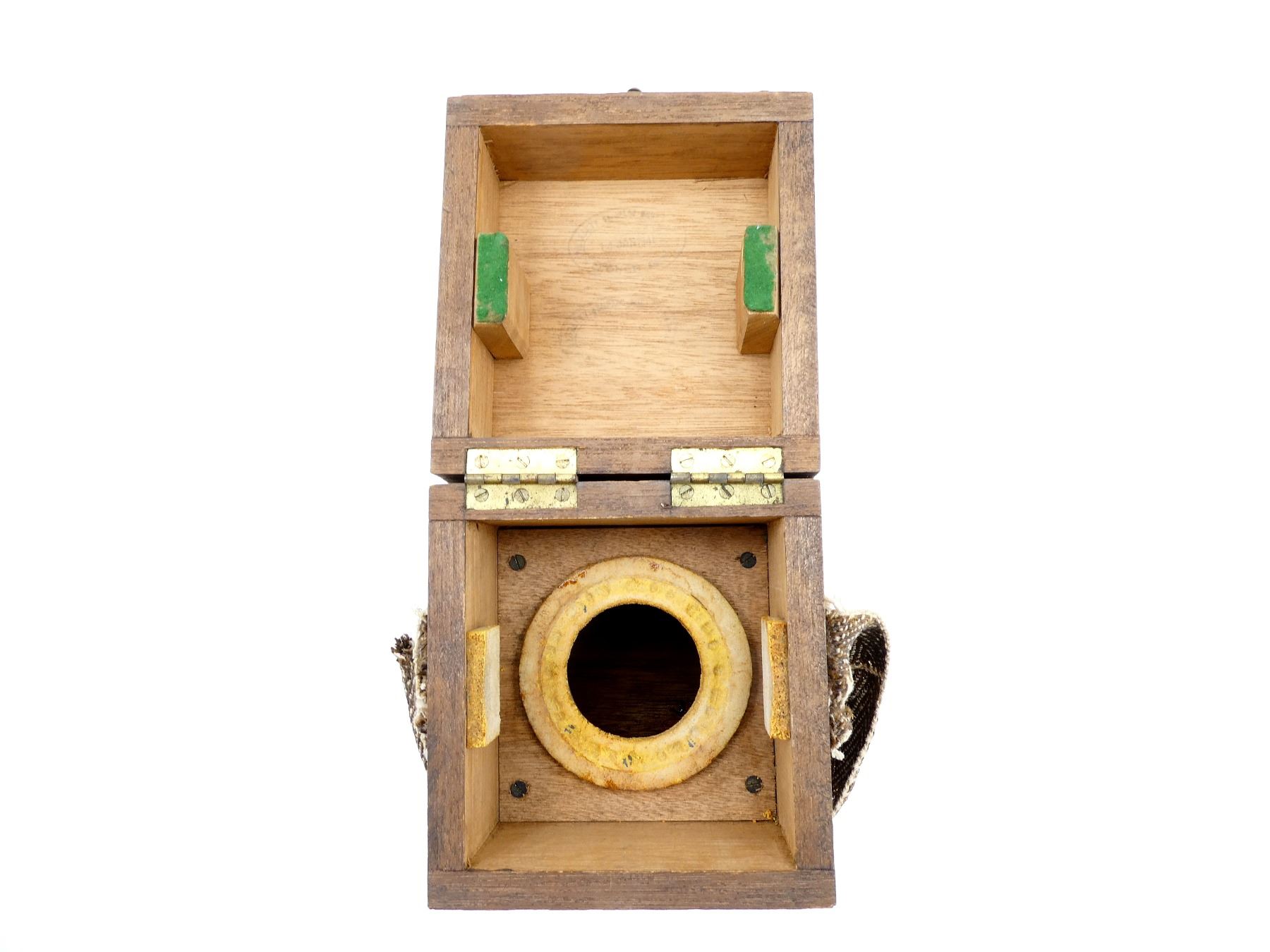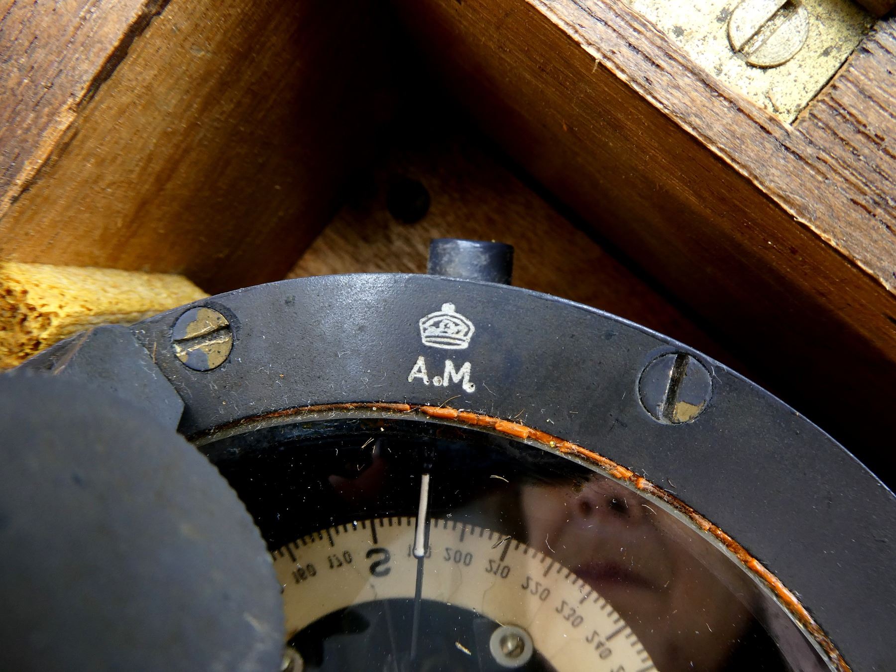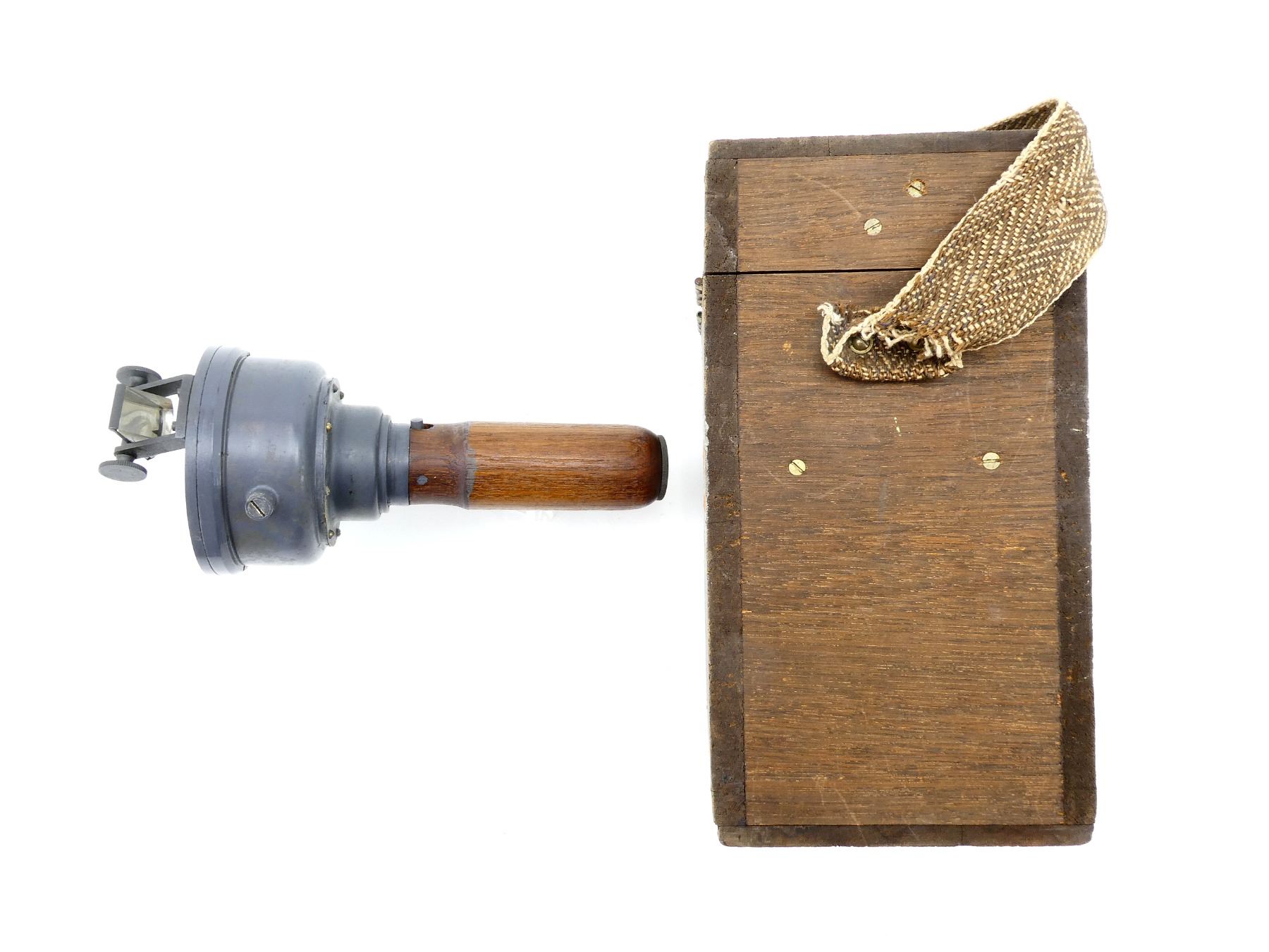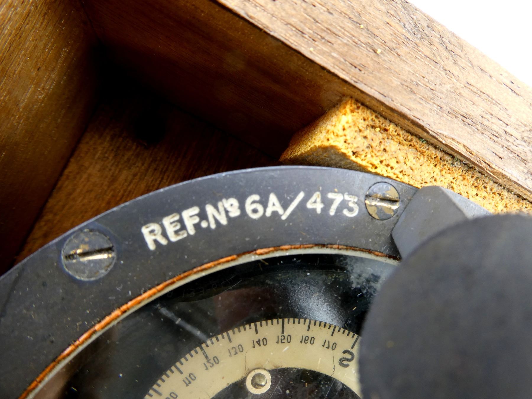 (1) HAND BEARING COMPASS TYPE 06, COMPASS MARKED: "TYPE 06, AFT, NO. 6870.H", CROWN OVER "A.M.", "REF. NO 6A/473", GREY PAINTED METAL & WOOD CONSTRUCTION, WITH ORIGINAL WOODEN STORAGE BOX, BOX MARKED: "14 JAN 1941" IN A CIRCLE WITH VARIOUS FAINT / UN-CLEAR MARKINGS AROUND DATE, BOX MARKED: "TYPE 06" & VARIOUS OTHER MARKINGS AROUND OUTSIDE OF CASE, CANVAS CARRY HANDLE, COMPASS MISSING FLUID, COMPASS OAL APPROX. 9" & BOX APPROX. 5.25" X 5.5" X 10.5". SEE PHOTOS.