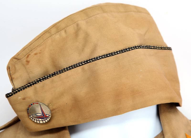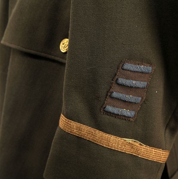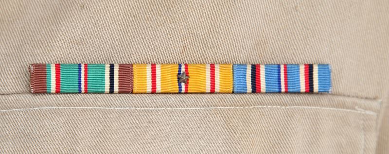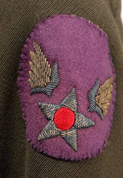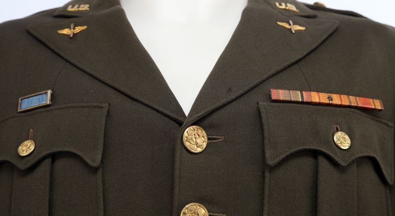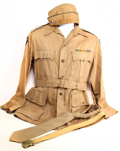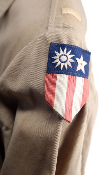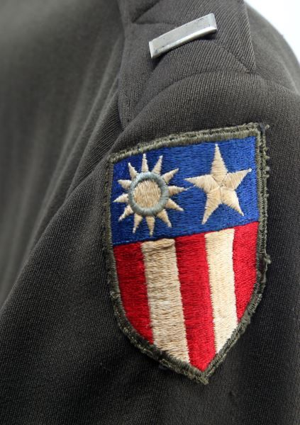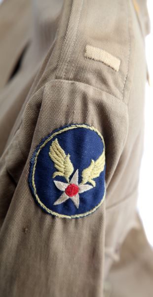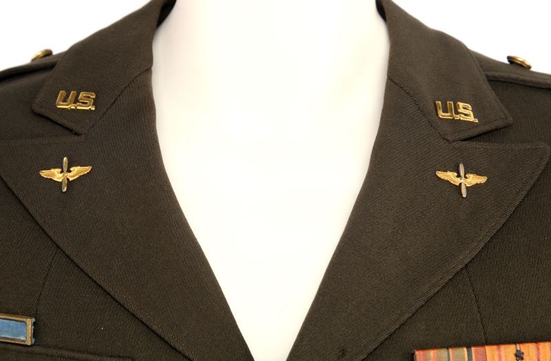 Two tunics from same 1st LT. included is khaki tropical tunic with embroidered collars and epaulets (1LT ). In-country made CBI and AAF shoulder patches. Includes matching belt and overseas cap with Sterling ATC badge. All in very good condition. Also included is a PP (Hart, Schaffner & Marx) dress tunic the same rank (sterling) and clutch back devices. Presidential unit citation to right breast. Two piece Superior buttons. Left sleeve carries 4 hashes in bullion. Original waist belt is present. Also includes tie and pant belt. All in very good condition. Both tunics have ribbons for American, European-North African-middle Eastern plus Asiatic-Pacific campaigns with service star. Nicotine smells to both units.