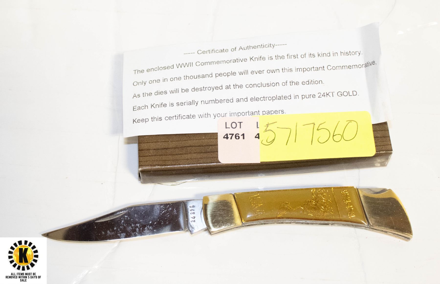 24 KARAT GOLD, ONLY ONE IN ONE THOUSAND PEOPLE WILL EVER OWN THIS IMPORTANT COMMEMORATIVE AS THE DIES WILL BE DESTROYED AT THE CONSLUSION OF THE EDITION, EACH KNIFE IS SERIAL NUMBERED.