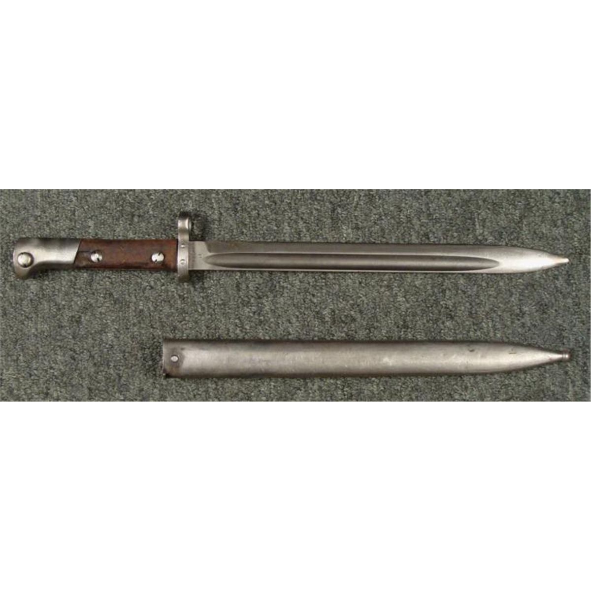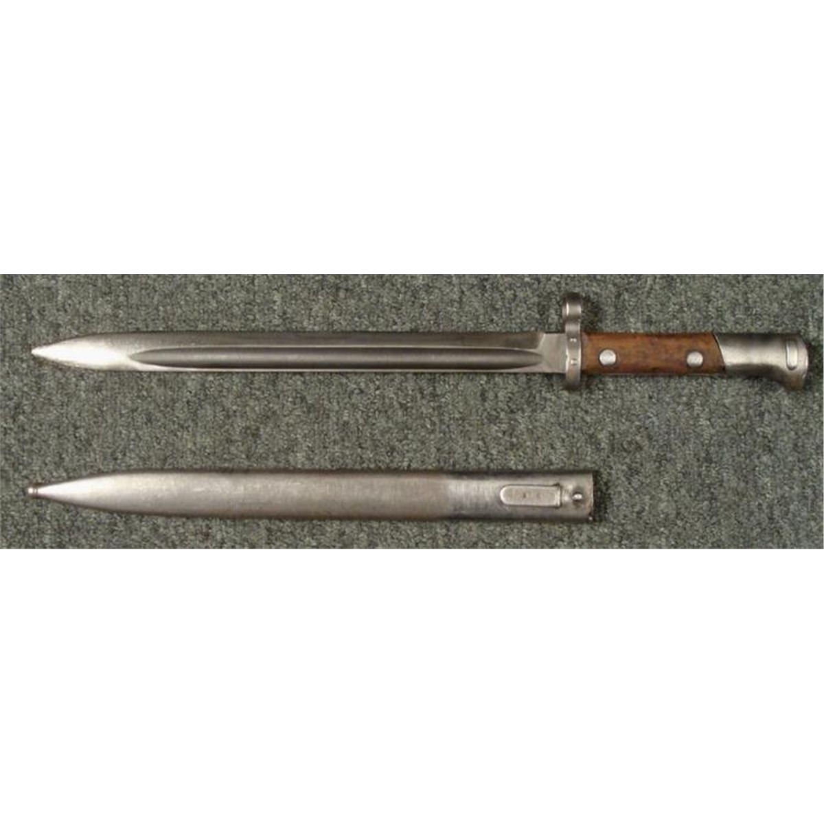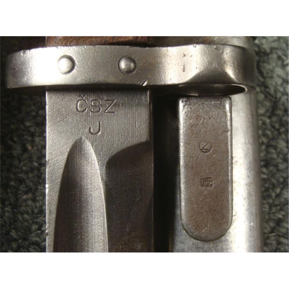 WWII CZECH MAUSER BAYONET & SCABBARD * OCCUPIED CHECK WWII MAUSER BAYONET-WOOD GRIPS EAGLE HEAD POMMEL-RELEASE BUTTON WORKS FINE--STEEL BLADES RICASSO MARKED "CSZ J"--STEEL SCABBARD--FROG STUG MARKED "CZ AND M IN RECTANGLE"FROG STUD SLIGHTLY LOOSE--O/A LENGTH 17 1/2" *