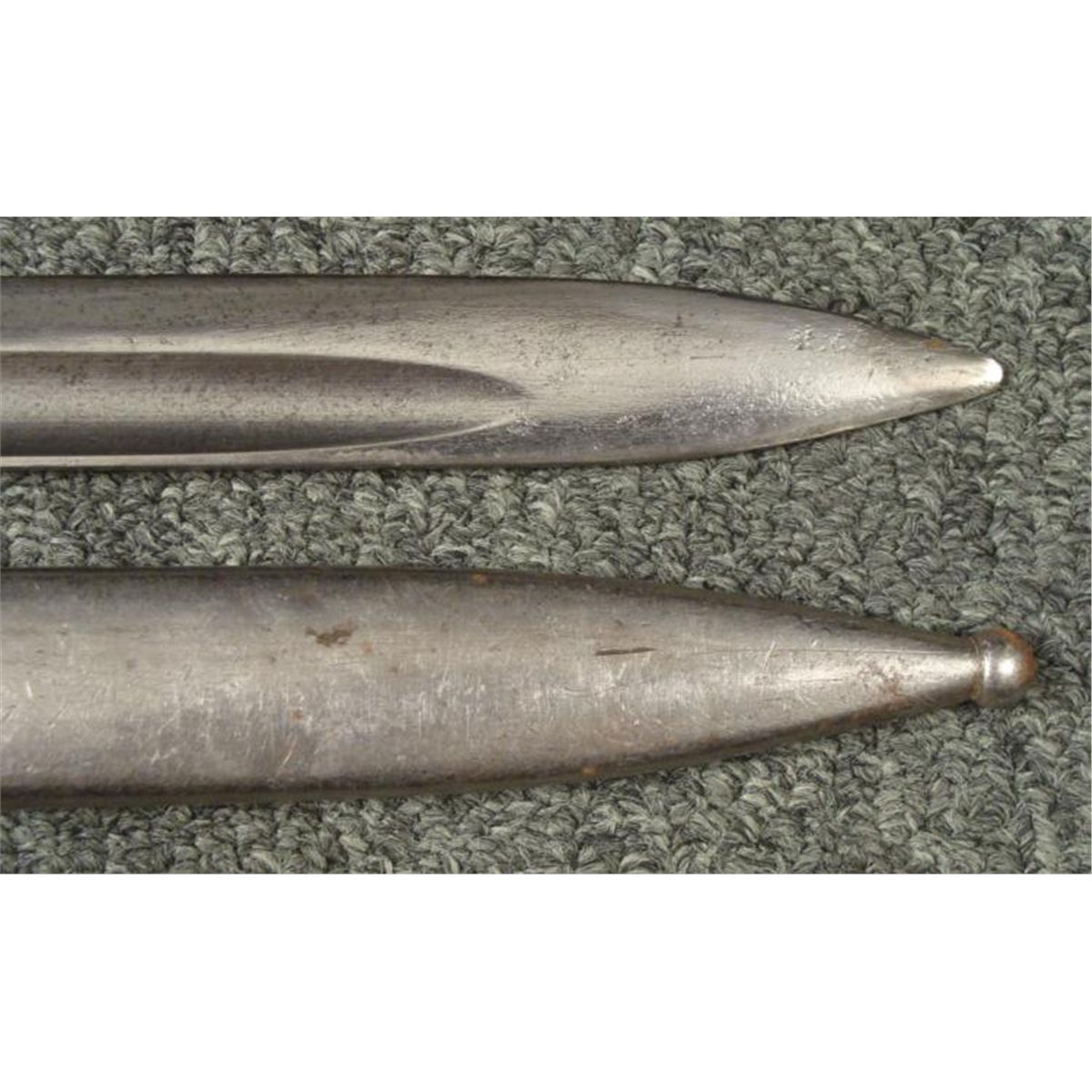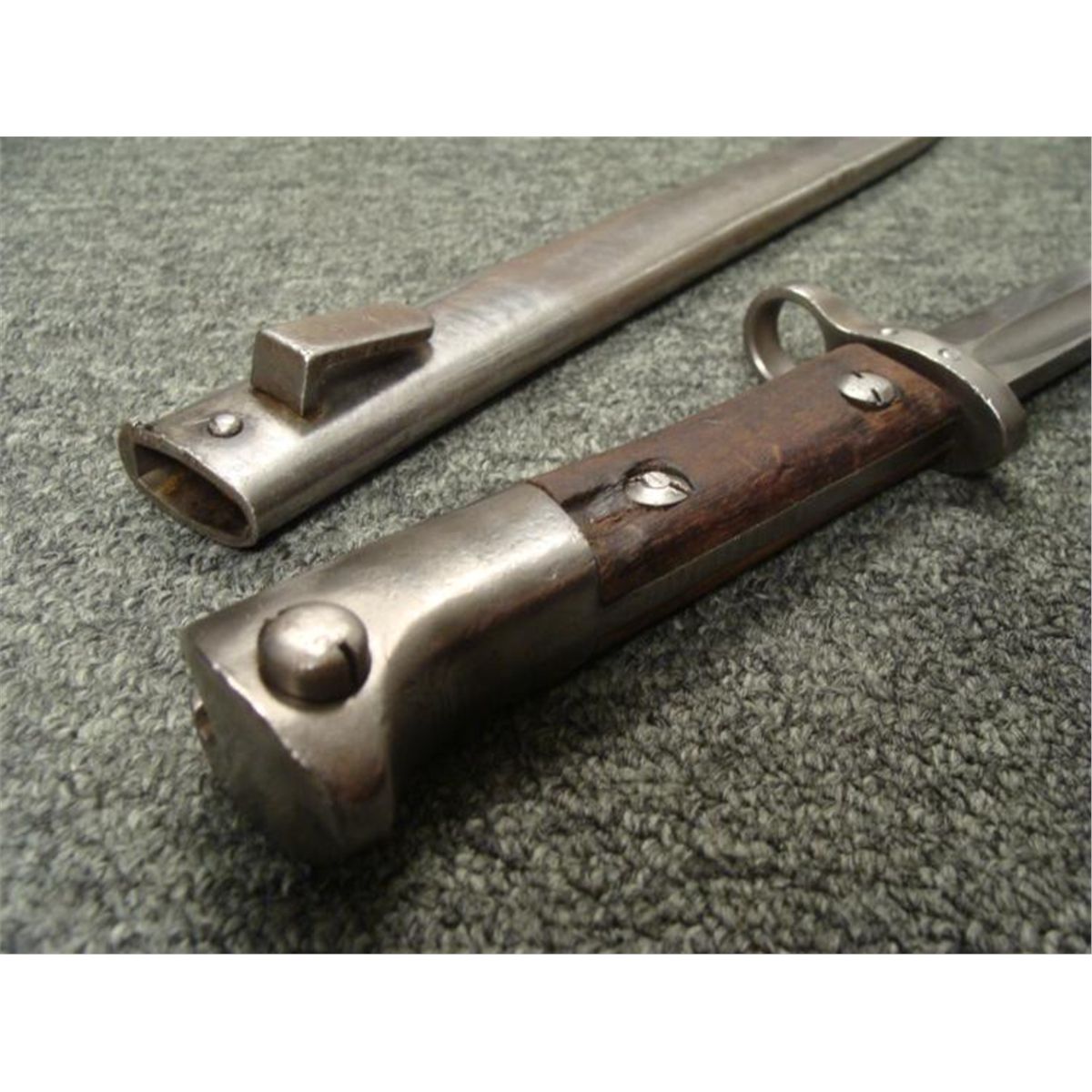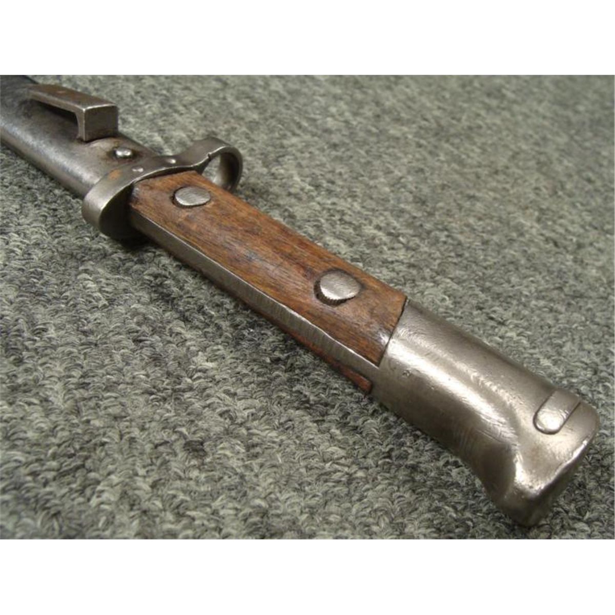 WWII CZECH MAUSER BAYONET & SCABBARD * OCCUPIED CHECK WWII MAUSER BAYONET-WOOD GRIPS EAGLE HEAD POMMEL-RELEASE BUTTON WORKS FINE--STEEL BLADES RICASSO MARKED "CSZ J"--STEEL SCABBARD--FROG STUG MARKED "CZ AND M IN RECTANGLE"FROG STUD SLIGHTLY LOOSE--O/A LENGTH 17 1/2" *