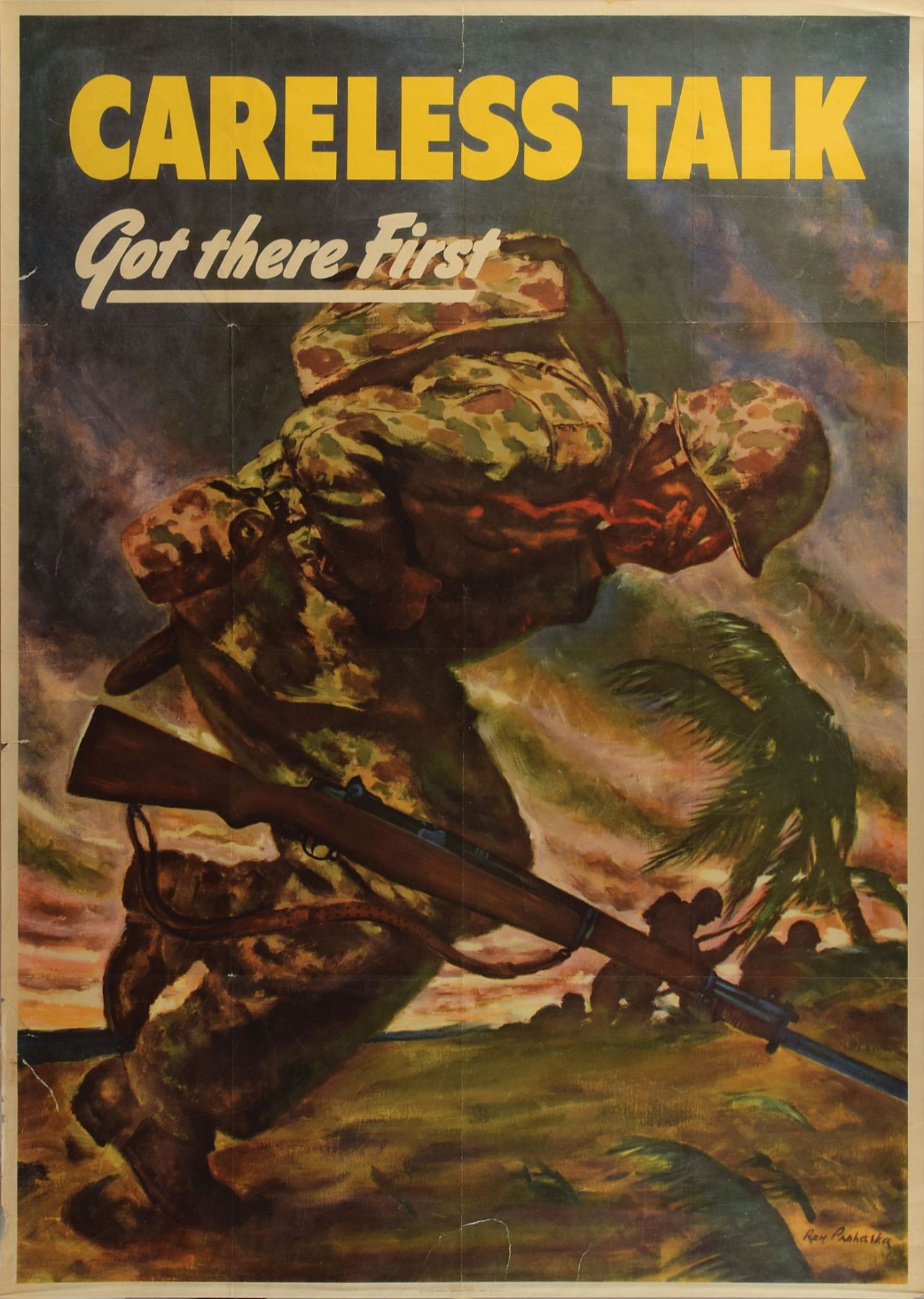 Original color 28.5 x 40 American WWII poster published in 1944 by the US Government Printing Office (1944-O-576497), portraying a soldier in camouflage hit by enemy fire, with bold text at the top, "Careless Talk Got There First." Removably encapsulated in a mylar sleeve. Rolled and in very good to fine condition, with smoothed folds and several repaired tears to the bottom and left edges.