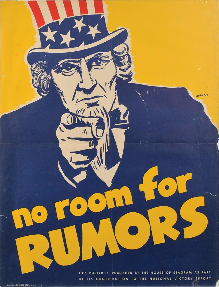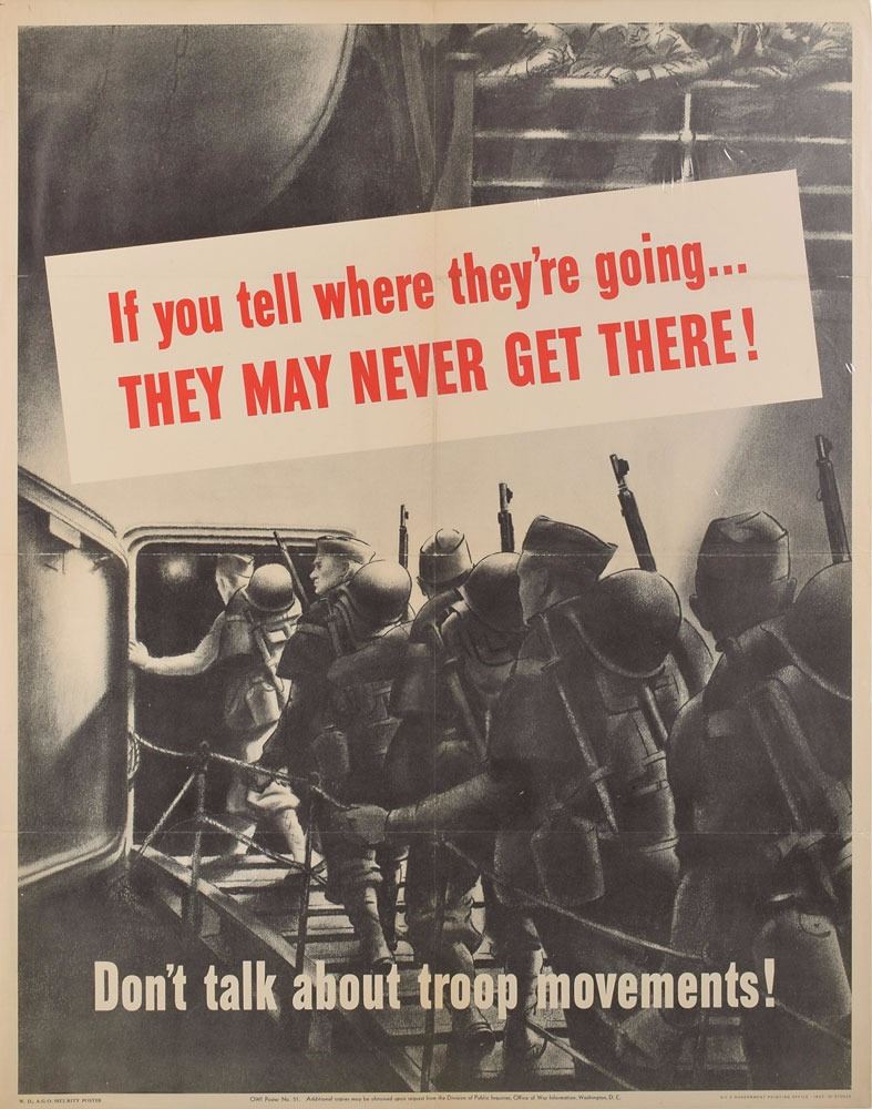 Three original color American WWII posters, including: a 14 x 20 poster published by the US Government Printing Office in 1943 (1943-O-558552), showing two grieving parents, with red text, "Americans Suffer when careless talk kills!"; a 22 x 28 Office of War Information poster (No. 51) showing troops boarding a ship, reading, "If you tell where they're going…They may never get there! Don't talk about troop movements!"; and a 21.25 x 27.75 poster of Uncle Sam "published by the House of Seagram as part of its contribution to the national victory effort," with large yellow text reading, "No Room for Rumors." In overall very good to fine condition, with some edge tears and paper loss to the Seagram poster.