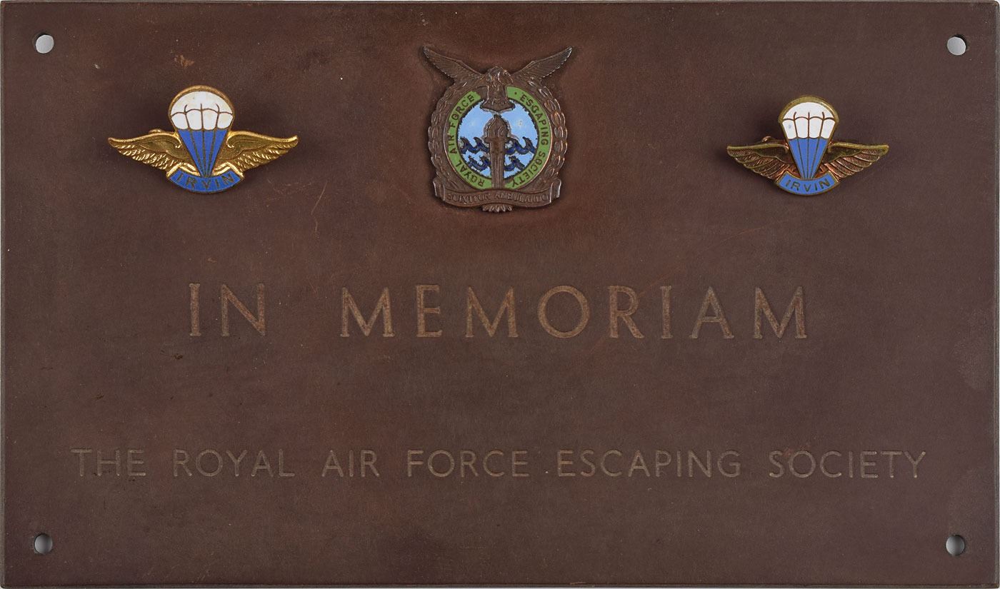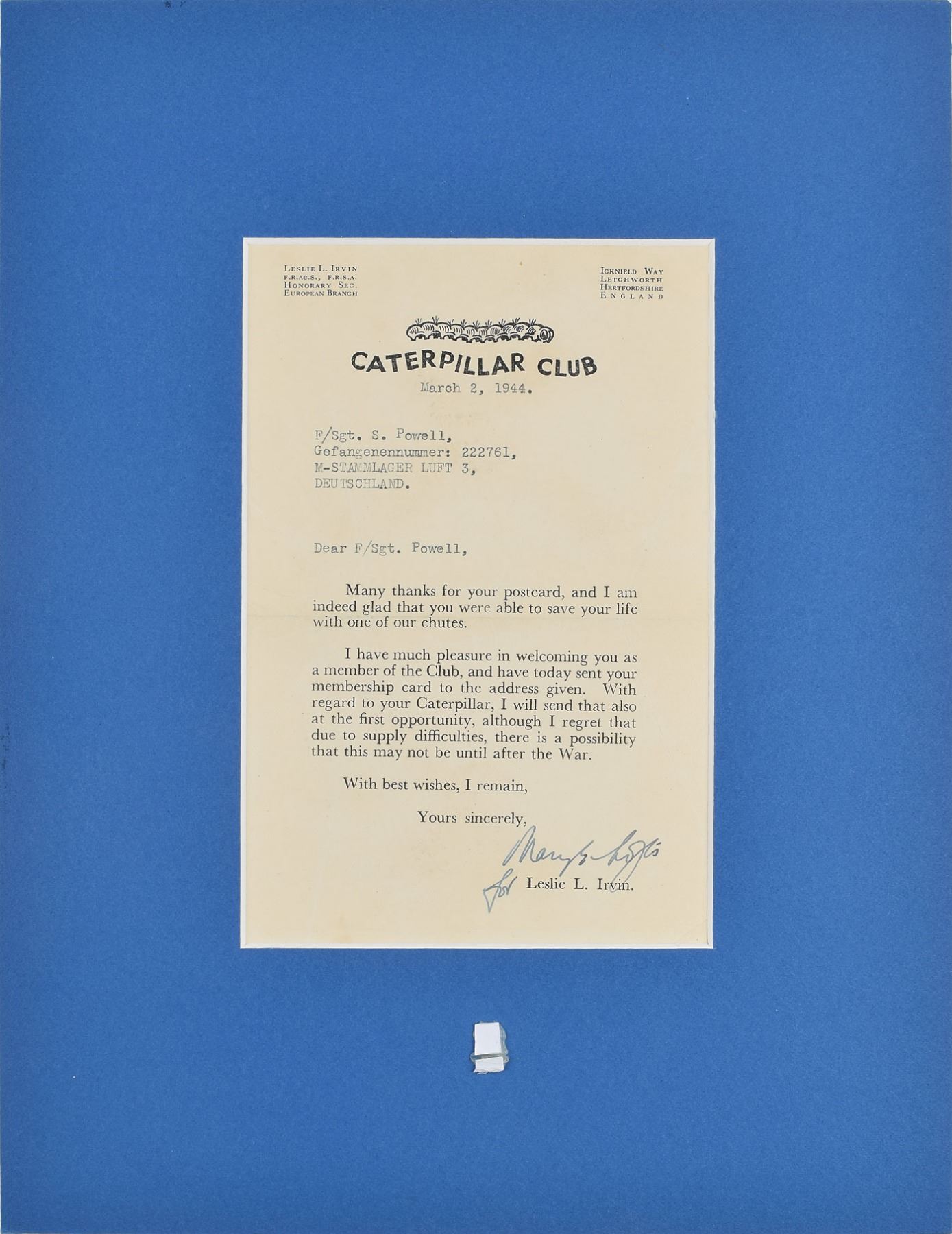 Collection of six items related to the Caterpillar Club, an association formed by parachute pioneer Leslie Irvin for airmen who successfully bailed out of a disabled aircraft and saved their lives through the use of a parachute. First, a TLS signed "Leslie L. Irvin," one page, 4.5 x 7.75, Caterpillar Club letterhead, August 13, 1945, in part: "I am indeed glad that you were able to save your life with an Irvin chute, and have much pleasure in welcoming you as a member of the Club. I am enclosing herewith your Caterpillar Pin and membership card with our compliments." Second, the associated laminated Caterpillar Club card, 3.25 x 2.25, signed in blue ballpoint by Irvin. Next, two enameled 1.25 x .75 membership pins, and a similar secretarially signed typed letter welcoming Sgt. S. Powell to the club. And finally, a metal plaque engraved "In Memoriam, the Royal Air Force Escaping Society." The first letter and membership card are mounted and matted to an overall size of 15 x 12.5; the second is mounted and matted with one of the pins to an overall size of 9.75 x 12.75. In overall fine condition. Especially famous members of the Caterpillar Club include James Doolittle, Charles Lindbergh, and John Glenn. The name of the club was derived from the silk threads that made the original parachutes, the club's motto being 'Life depends on a silken thread.'