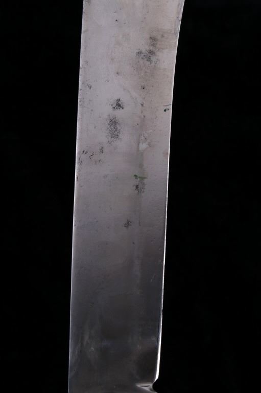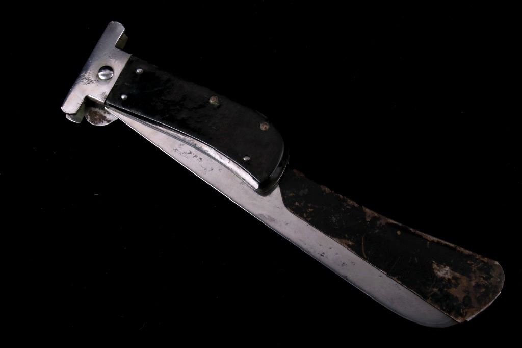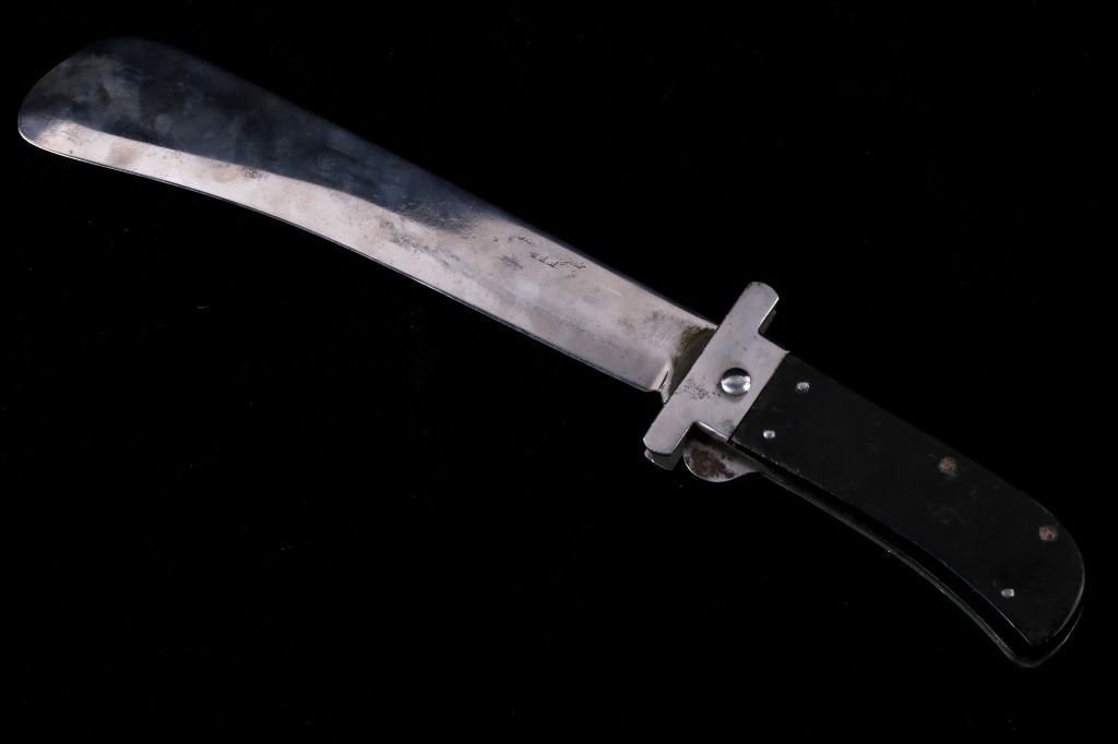 For your bidding pleasure is this WWII Cattaraugus U.S.A. folding machete. This machete folds out to show a solidly constructed tool. When WWII began, Cattaraugus ceased their regular production and began making knives exclusively for the military. During this time, the company was honored with an “E” for excellence in production from both the Army and Navy. This blade features a guard while folding it in and out and is stamped Cattaraugus U.S.A on the blade. The measurements of this machete are 11" x 3 1/2" folded and 15 1/2" x 2 1/2" un folded.