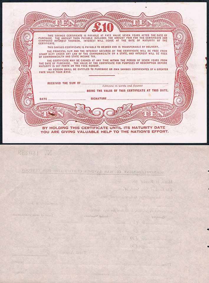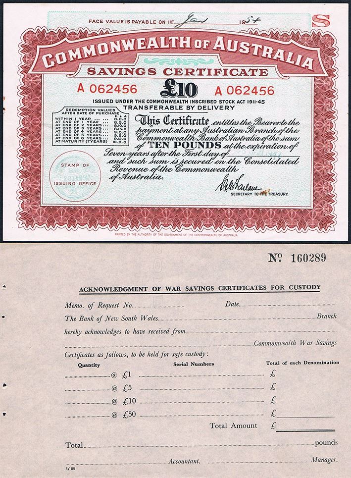 WWII, Commonwealth of Australia, Ten Pounds, War Savings Certificate, issued 28th Jan 1947 (MVR.WF3a), small rust stain which has turned into a nick to left hand margin, else graded as extremely fine; together with Bank of New South Wales, acknowledgement of war saving certificates of custody, normal staple holes to left hand margin, extremely fine (2 items)