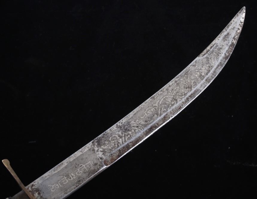 Featured in this lot is a WWII era curved spear point trench theater fighting knife originating from 1945. The knife displays an etched curved blade, layered plastic resin grip, and brass D guard. The blade displays a curved blade with an etched design across both sides and spear point. The guard shows brass construction with a D style design. The grip shows a layered plastic/resin construction with clear, blue, white, purple, and red coloration. The knife comes with a leather loop sheath. The knife displays good condition overall, with some wear and patina across the piece. The knife measures 13" long with the blade being 9" long.