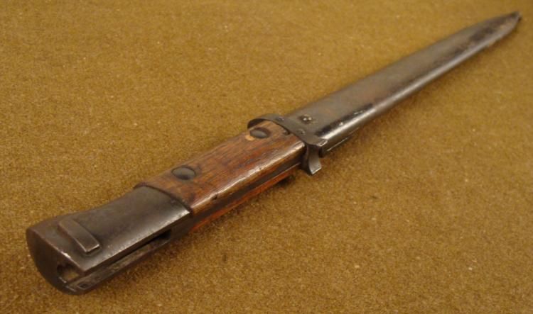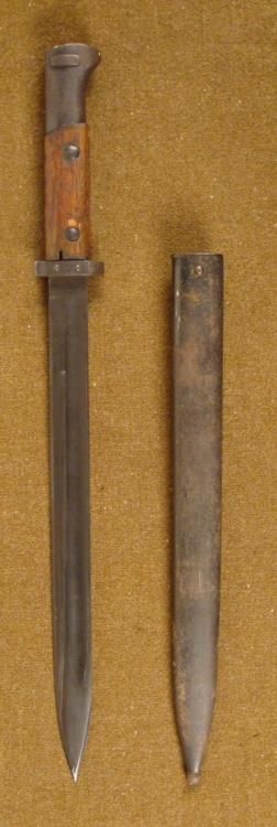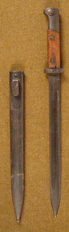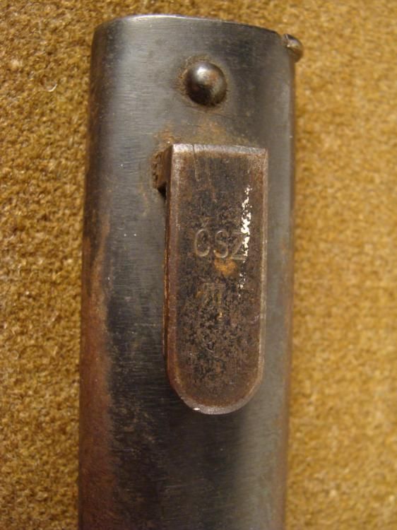 This is a WWII era Czech Mauser Bayonet & Scabbard. It features wood grips, and black blade. One side of the ricasso is marked CSZ L, and the other side has E 26 with hallmark. The blade length is 11 3/4", and the overall length in the scabbard is 17 1/2". The blade is good with a fine point. The wood has some nicks, and the scabbard has light surface rust.