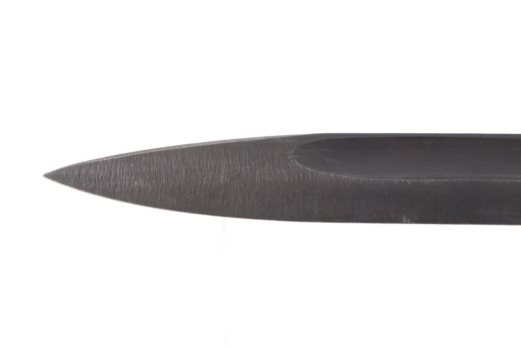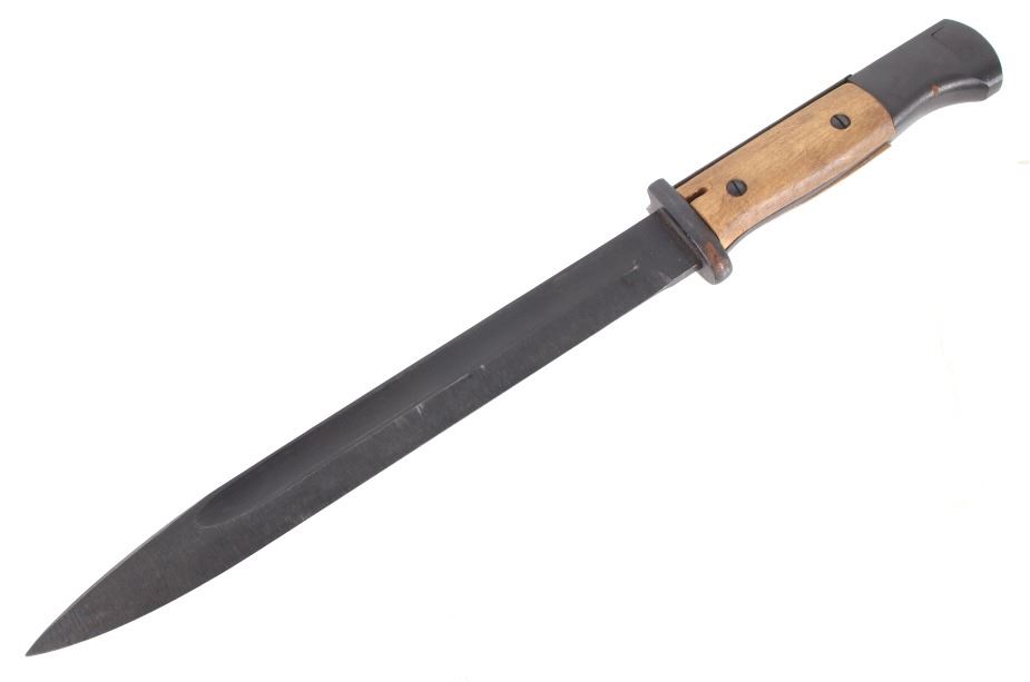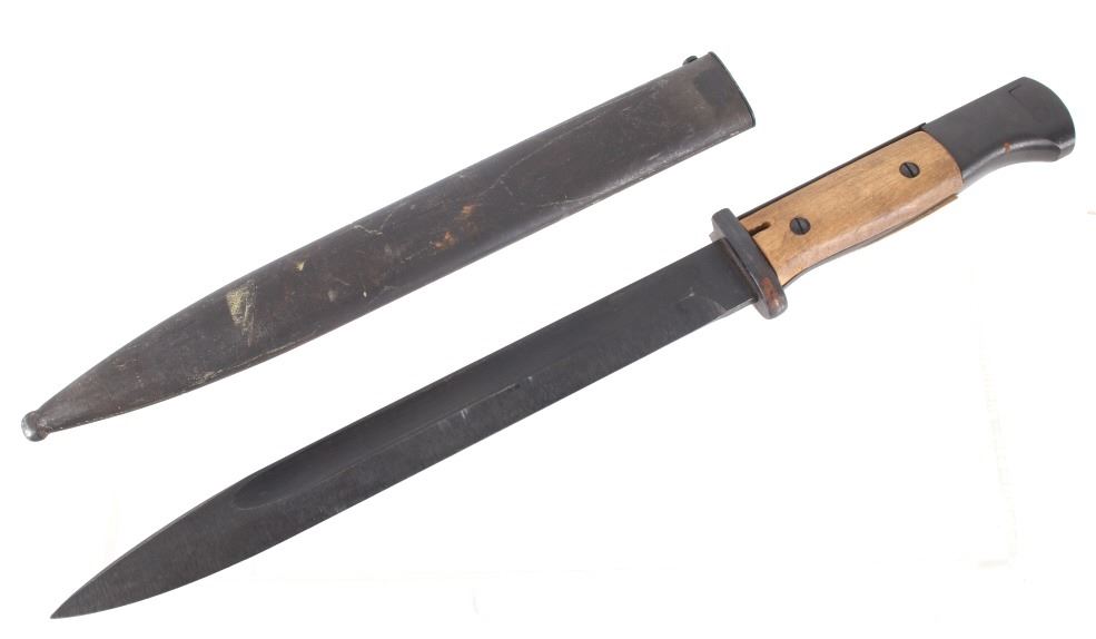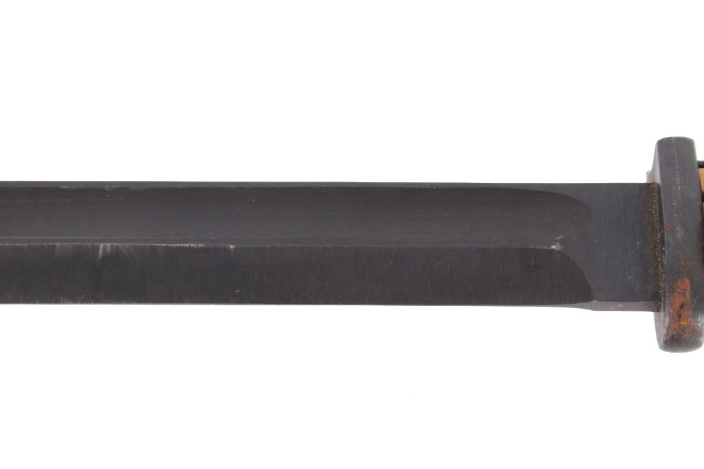 Featured in this lot is this WWII Czech S-24 modified Mauser K98 bayonet. the bayonet features a beautifully crafted steel and wooden handle construction that shows the traditional knife bayonet blade and was modified to fit a Mauser K98. The bayonet does no contain any serial number or marks adorning the bayonet or the metal sheath. The condition of this bayonet is good with some slight wear to the metal sheath and some scratching to the blade and wooden handle of the bayonet but otherwise shows good overall condition. The overall measurements of this bayonet in sheath is 16" x 1 5/8" x 1 1/4" and the blade length is 9 7/8".