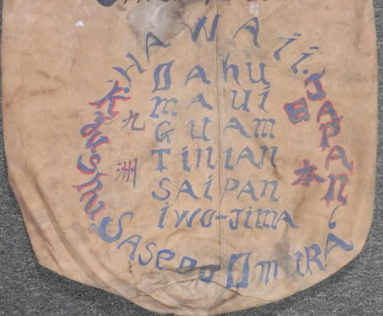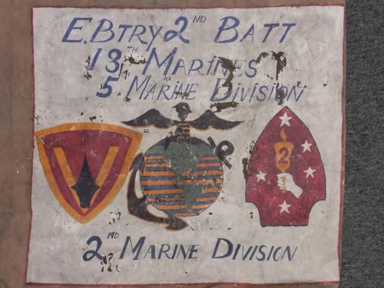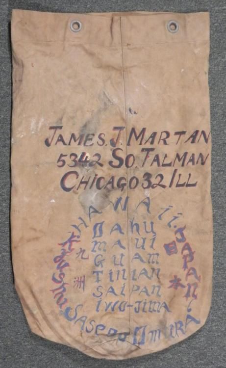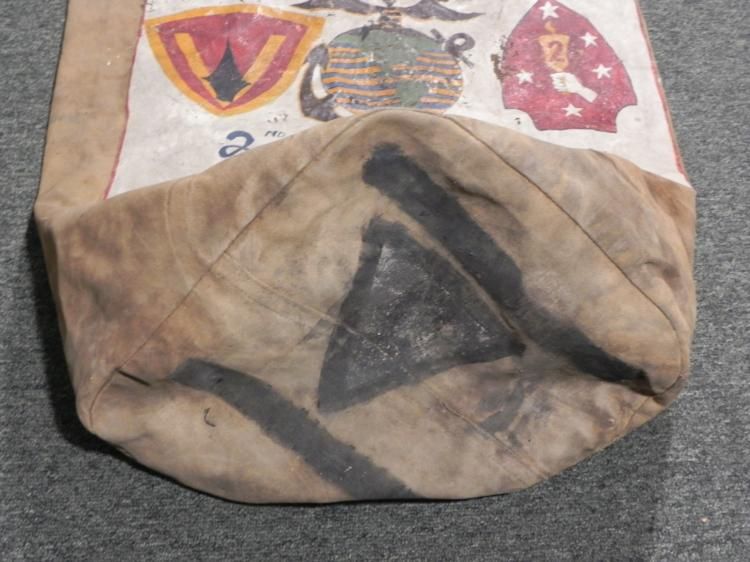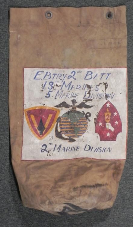 THIS IS A WWII DOUBLE SIDE PAINTED MARINE DUFFEL BAG-2ND MARINE DIVISION. THIS IS RARE ORIGINAL, NEVER SEEN BEFORE MARINE DUFFEL BAG. THIS YOUNG MARINE, OBVIOUSLY WAS QUITE AN ARTIST. IT READS, "E. BATTERY, 2ND BATTALION-13TH MARINES-5TH MARINE DIVISION-2ND MARINE DIVISION" WITH ALL INSIGNIAS. ON THE REVERSE IT IS IDENTIFIED WITH AN ADDRESS. CENTRAL ARE AREAS OF COMBAT INCLUDING IWO JIMA, SAIPAN, TINIAN, GUAM,+JAPANESE KONJI. THIS IS A OUTSTANDING MARINE MEMORABILIA THAT YOU CAN NOT PASS UP ON. * *