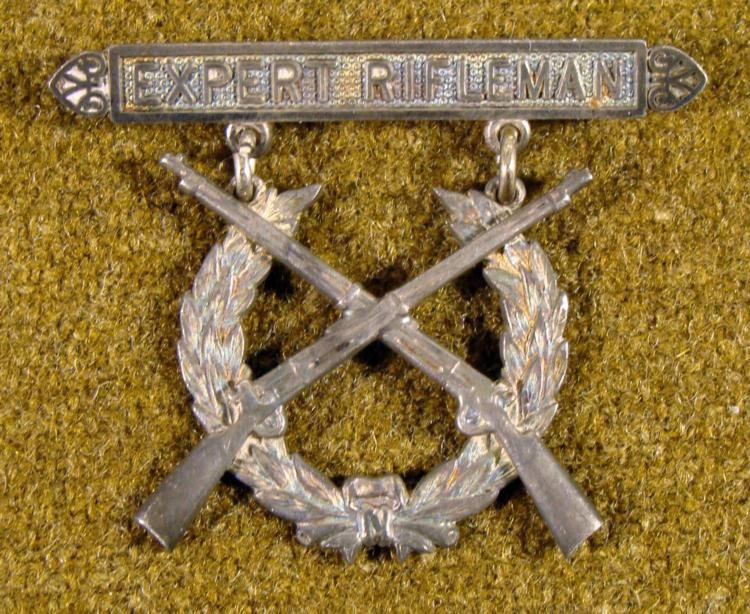 THIS A WWII ARMY EXPERT RIFLEMAN AWARD BADGE WITH CROSSED RIFLES ON AWREATH. IT IS AN EARLY PERIOD AWARD BADGE.