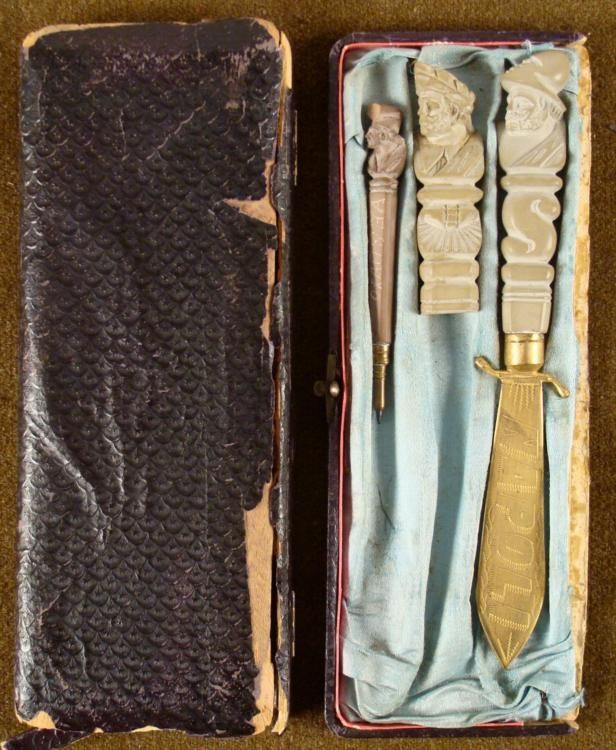 OFFERED HERE IS A WWII ERA THREE PIECE CASED ITALIAN SOAPSTONE SET. IT COMES WITH A PENCIL, LETTER OPENER, AND PAPER WEIGHT; ITALIAN HISTORICAL FIGURE BUSTS. THE PENCIL IS SIGNED "VESUVIO" AND THE LETTER OPENER IS SIGNED "NAPOLI". THEY ARE BEAUTIFULLY CARVED ARTISTIC PIECES. THE SOAPSTONE SET IS IN ITS ORIGINAL CASE, BUT IS IN NEED OF ILL REPAIR. *