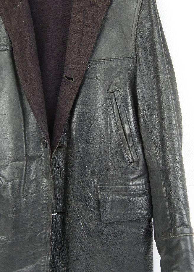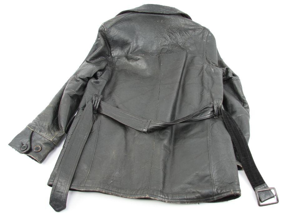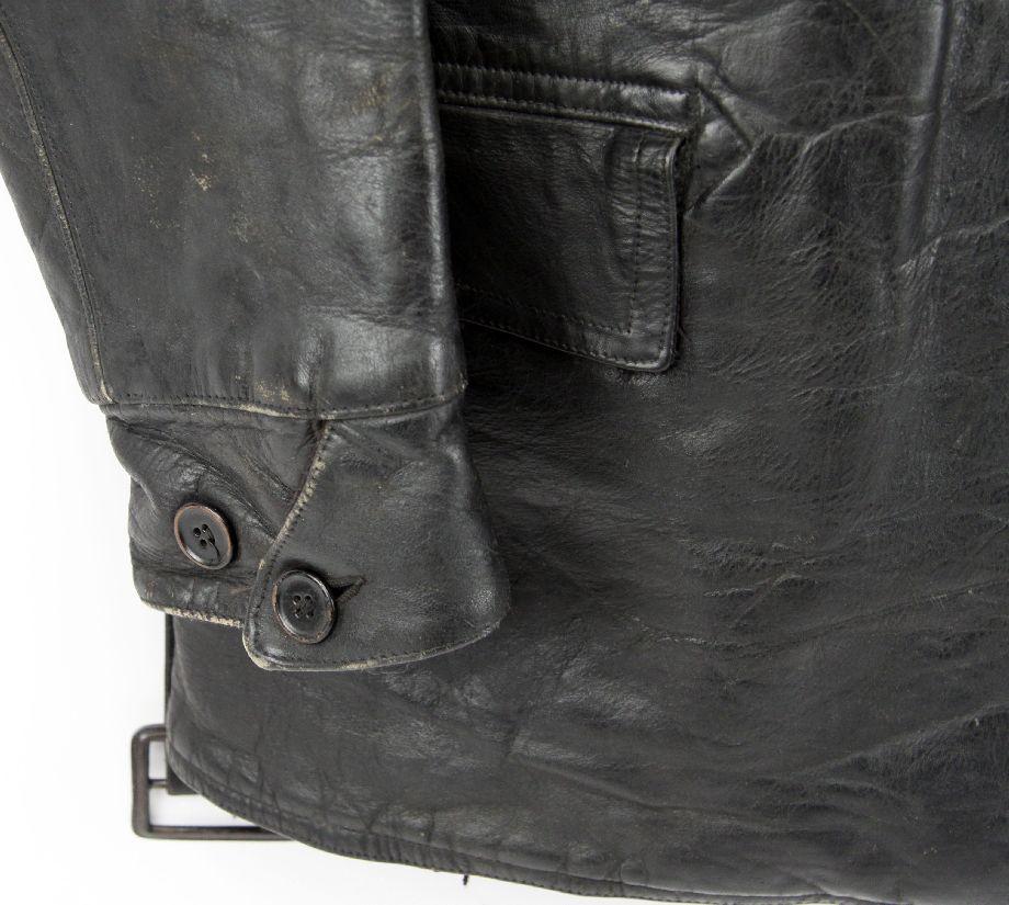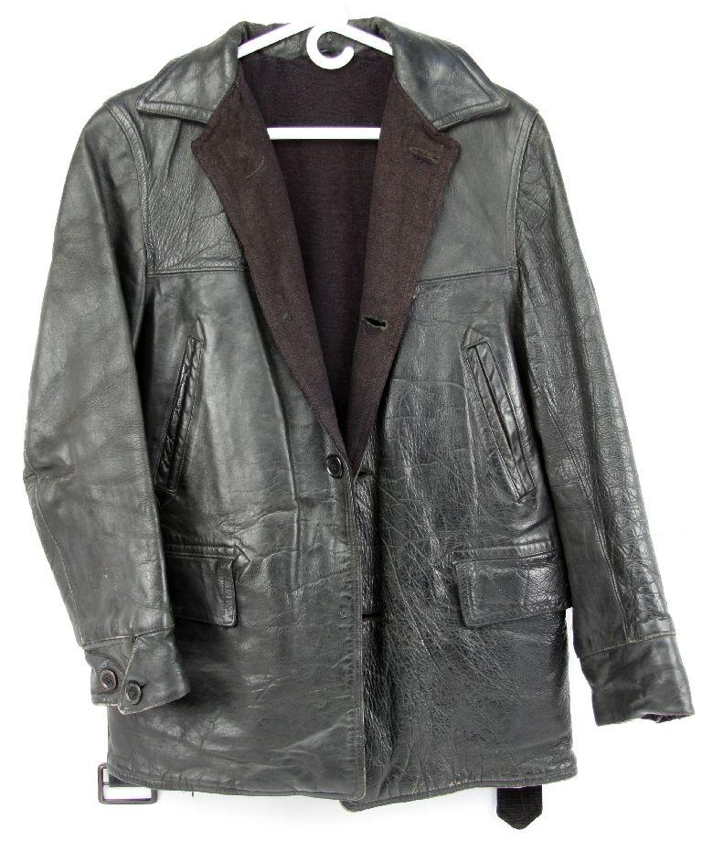 WWII Era black leather deck jacket. Appears to be German navy. Some wear and age. Two slant and two flap pockets, and black wool lining. Good condition.