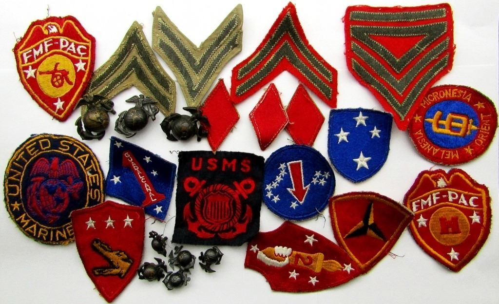 GLOBE PIN SET! (3) LARGE GLOABE AND (5) SMALL. 2 FMF-PAC PATCHES, ENGINEERS & ARTILLERY. USMC PATCH, A SET OF CORPORAL RANK, AND A USMS (MERCHANT MARINE) PATCH.