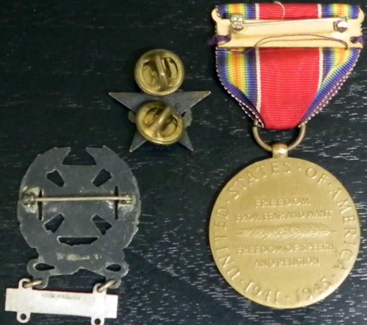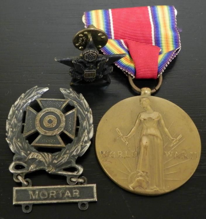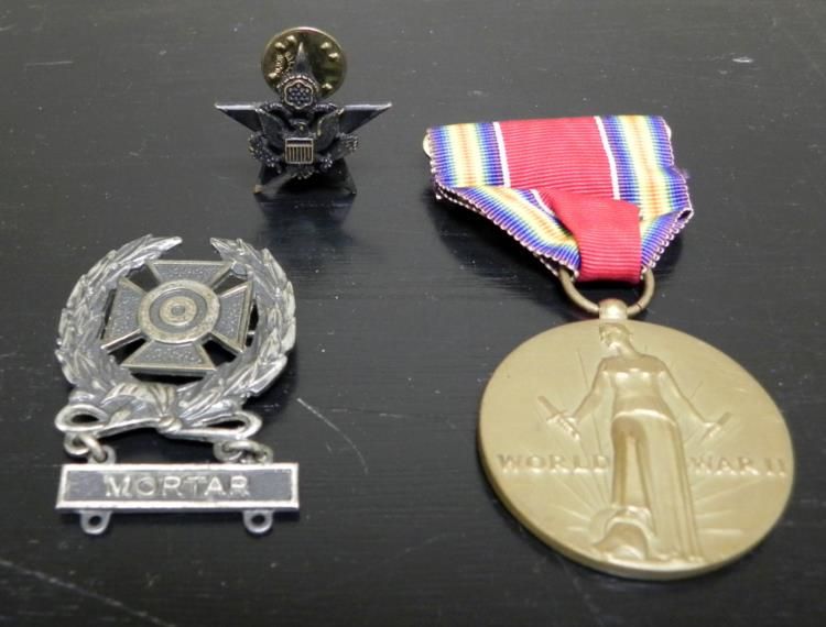 HERE IS A WWII ERA MEDAL & BADGES-VICTORY MEDAL-EXPERT BADGE W/MORTAR BAR & ARMY MEDAL. THE QUALIFICATION BAR AND MEDAL MARKED STERLING--ARMY STAR BADGE MARKED KREW.