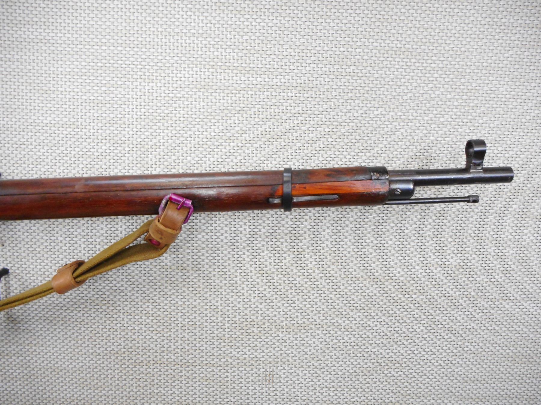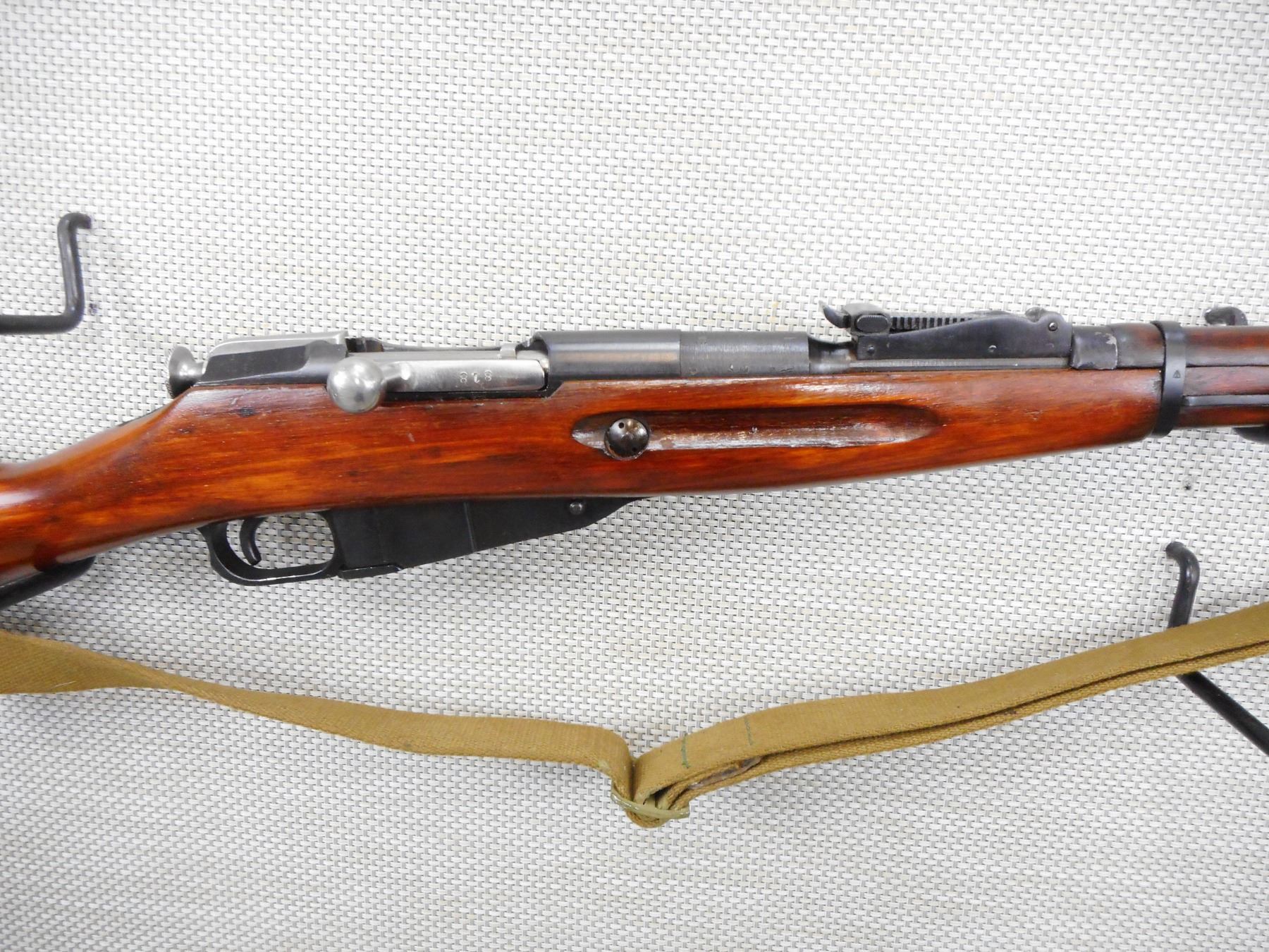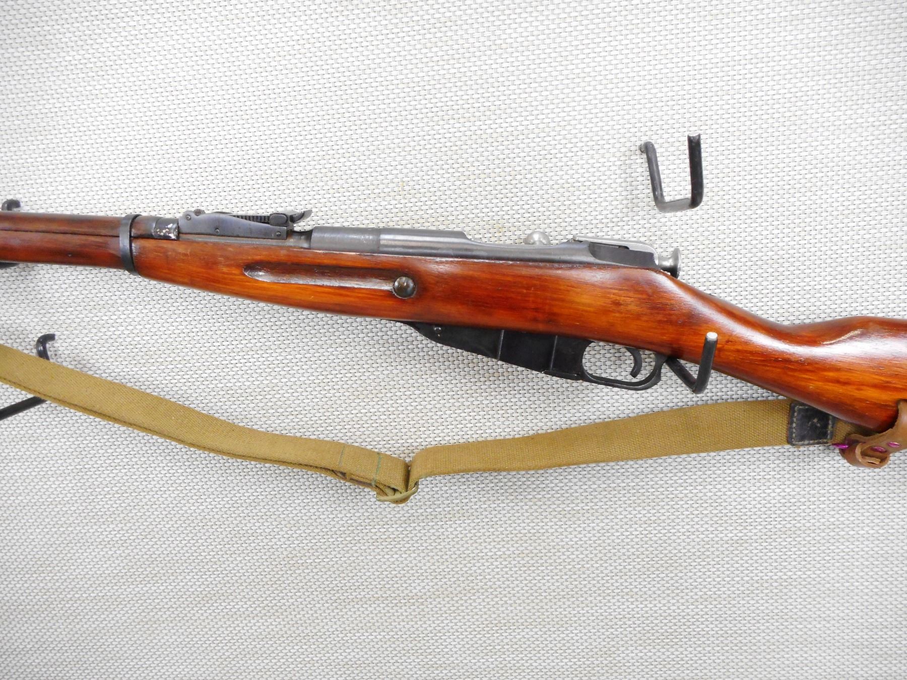 WWII ERA, MOSIN NAGANT , MODEL: 91/30 , CALIBER: 7.62 X 54R , THIS IS AN EX SNIPER RIFLE WITH REPLACED BOLT, ON THE LEFT SIDE OF THE RECEIVER YOU CAN SEE IT WAS DRILLED FOR SCOPE MOUNTS WHICH ARE NOW PLUGGED, BOLT AND RECEIVER MATCH BY SERIAL #, DATED 1943, TULA ARSENAL, BORE IS GOOD, HOODED FRONT AND ADJUSTABLE REAR SIGHT, ORIGINAL MILITARY LEATHER AND CANVAS SLING, RETAINS FULL MILITARY CONFIGURATION, STEEL BUTT PLATE, ARESNAL REPAIRED WOOD ON THE FOREND, HAS ORIGINAL CLEANING ROD, SHOWS SOME HANDLING MARKS , STOCK # 10196 , SERIAL # T0618 , ACTION: BOLT ACTION RIFLE , BARREL LENGTH: 29" , CONDITION: 6/10 , CLASS: CLASS: CANADIAN NON RESTRICTED CLASS
