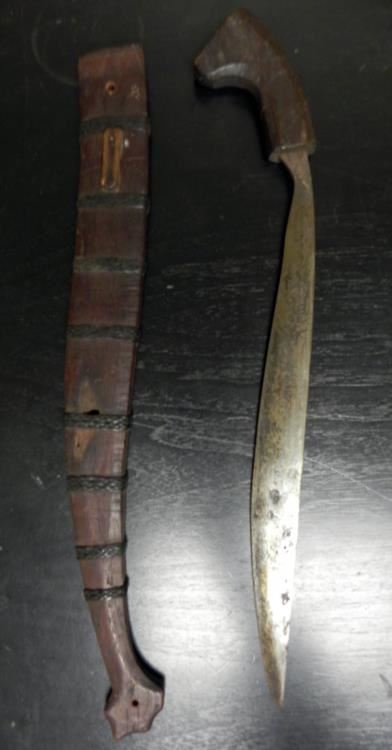 OFFERED HERE IS A WWII ERA PHILIPPINE BORANG MACHETE BOLO KNIFE & SHEATH. IT WAS WELL MADE CIRCA WWII KNIFE--14" BLADE--WOOD HANDLE--WOOD SCABBARD WITHWOVEN BANDS AROUND SCABBARD--SOUND KNIFE AND SCABBARD--PACIFIC THEATRE BRINGBACK.