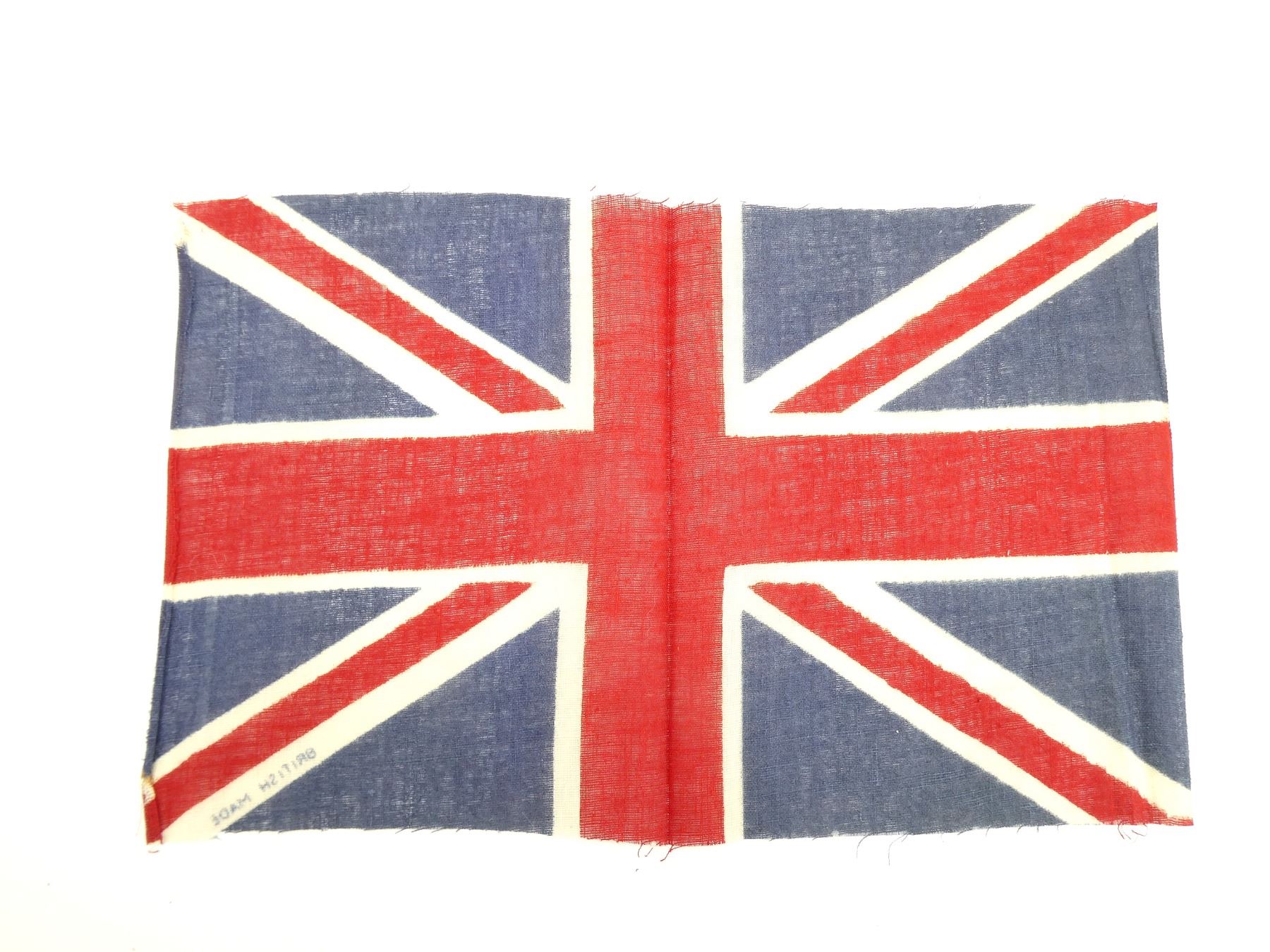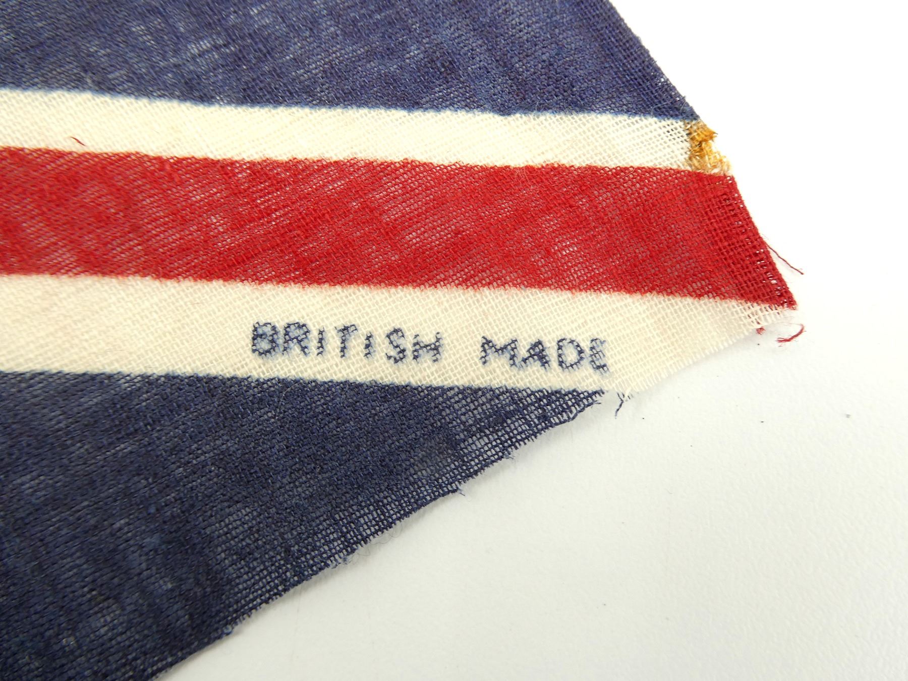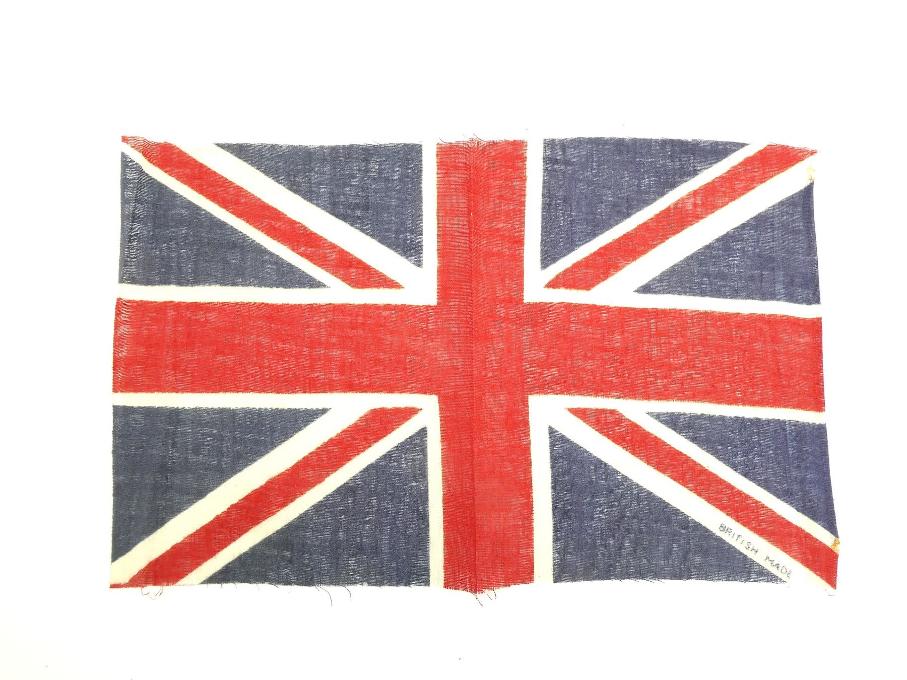 (1) RED / WHITE / BLUE ROUGH COTTON UNION JACK FLAG, MARKED: "BRITISH MADE", APPROX. 11.25" X 7". SEE PHOTOS.