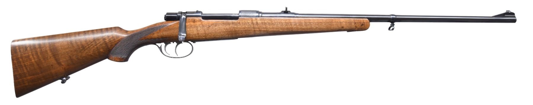 RIFLE. Cal. 7x64. S# 4738. Barrel 23.6" with "43" dated Czech proofs & swivel on barrel band. Ramp mounted blade front sight & 2 leaf rear sight. Small ring receiver with control feed claw extractor action with butterknife bolt handle. Double set triggers. Receiver ring is matted with Zbrojovka logo, left side of receiver stamped "WAFFENWERKE BRUNN / AKTIENGESELLSCHAFT". Hinged floorplate has checkering at top & checkered release button. Walnut stock with small schnabel tip, checkered pistol grip, Bavarian cheekpiece & sling swivel. LOP: 14" to grooved butt. CONDITION: very good metal & wood finish with light handling marks. Very good bore with strong rifling. (25-1556/MD). CURIO. $1,000-1,500.