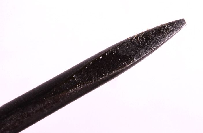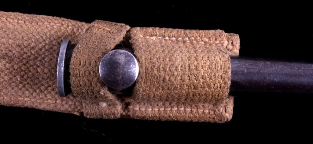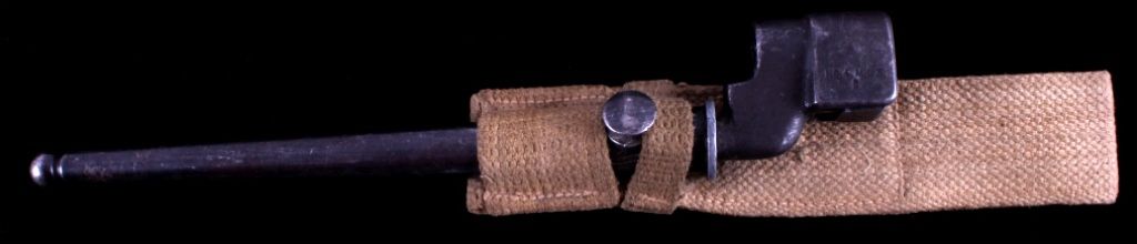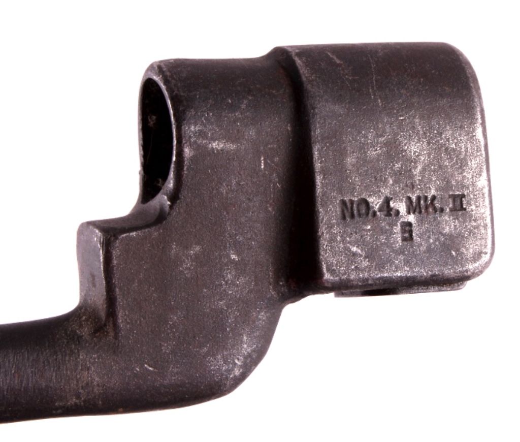 This is a WWII Enfield No. 4 Mark II bayonet w/ scabbard and frog. The bayonet is marked "No. 4 MK II S". The bayonet includes the canvas frog. It is in good condition. The bayonet measures 10" long.
