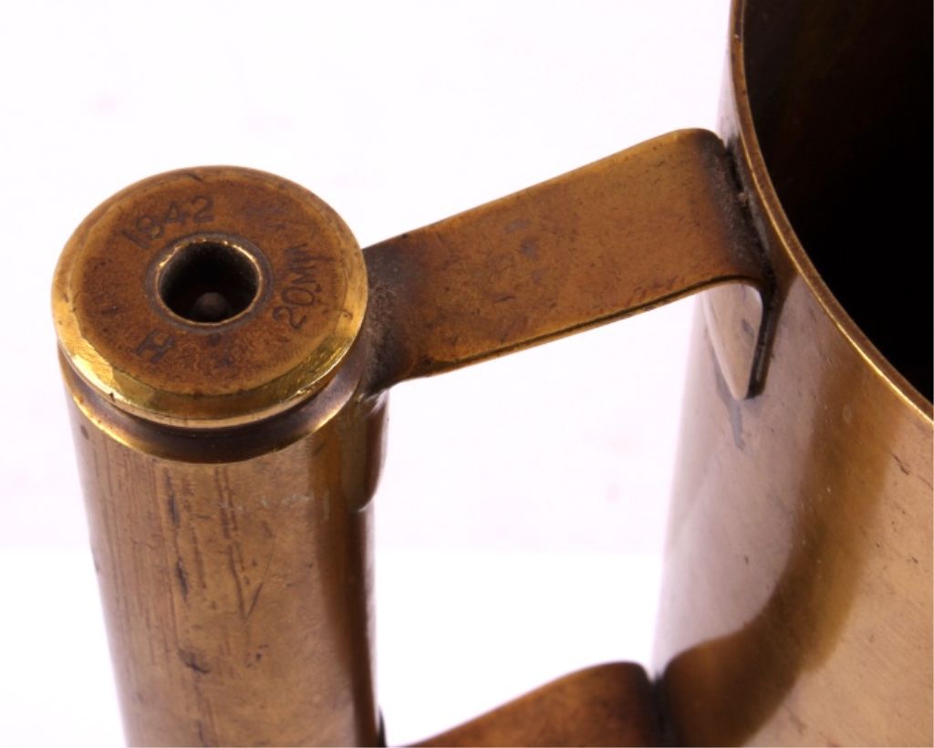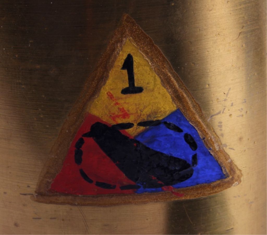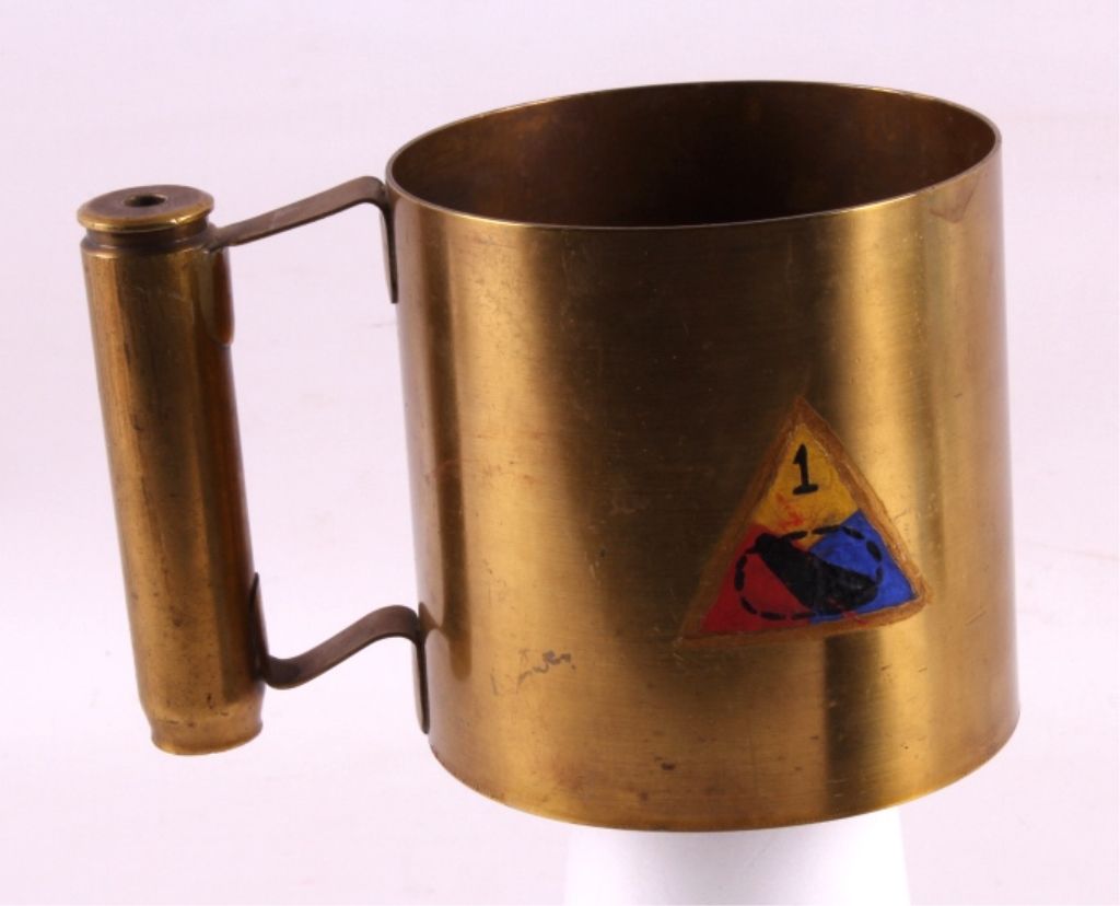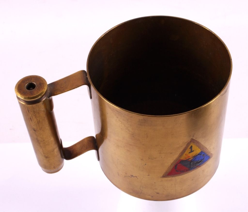 This is a WWII era artillery shell trench art mug. The mug was made from a large brass shell casing and a smaller 20mm shell case. The 20mm case is marked "1942 H 20mm". The mug has been painted with the logo of the 1st Armored Division. The trench art mug is in good condition. It measures 4.25" in diameter and is 4.25" tall.