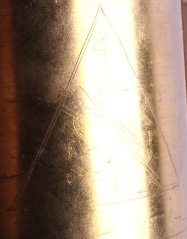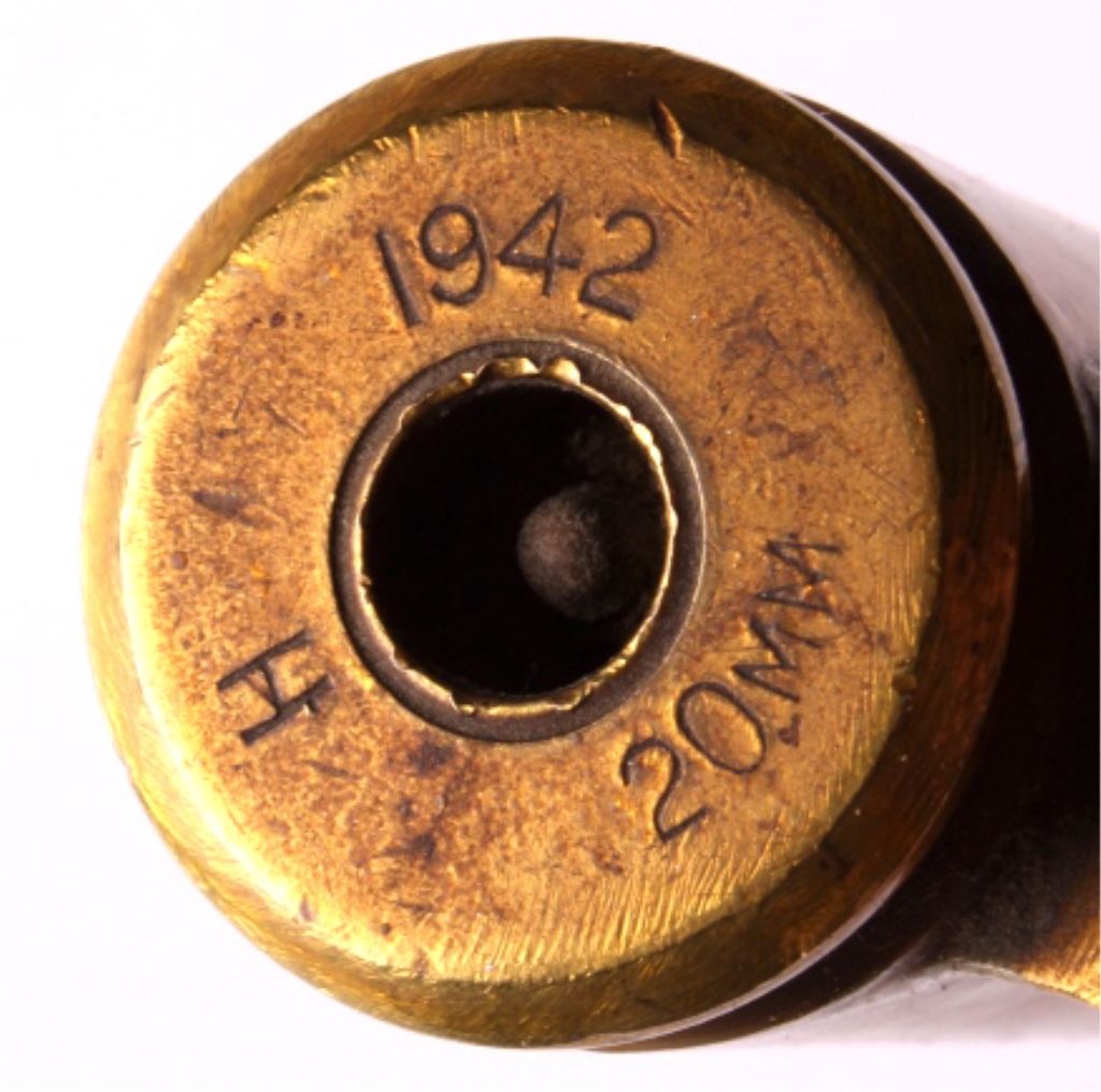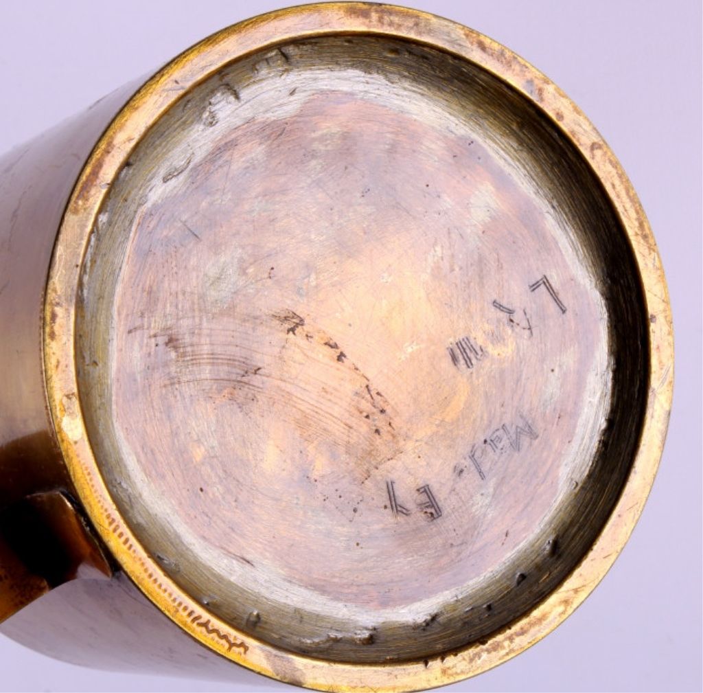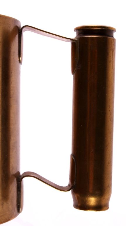 This is a WWII era artillery shell trench art mug. The mug was made from a large brass shell casing and a smaller 20mm shell case. The 20mm case is marked "1942 H 20mm". The mug has been painted with the logo of the 1st Armored Division. The trench art mug is in good condition. It measures 4.25" in diameter and is 4.25" tall.