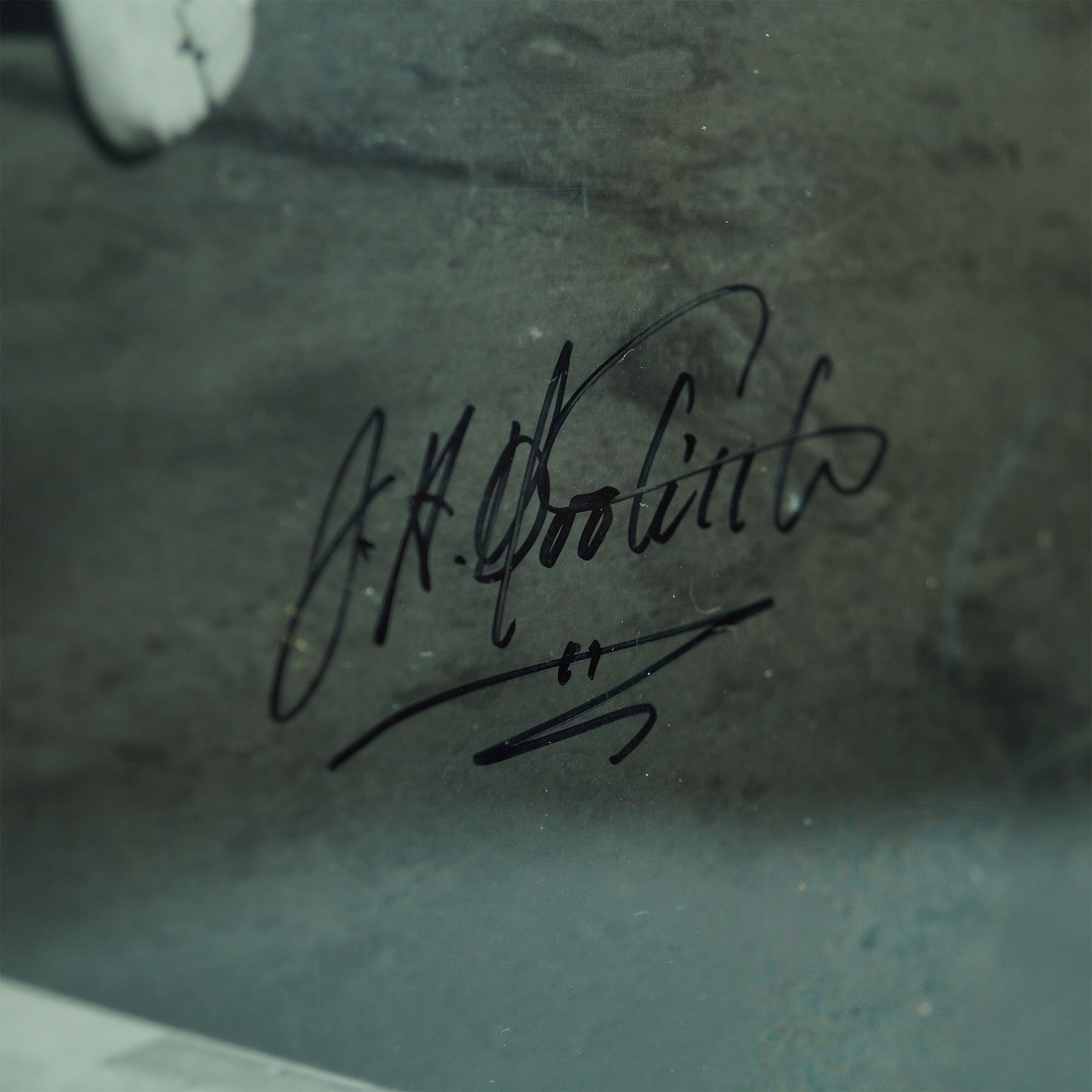 Striking black-and-white photograph depicting a squadron of Martin PBM Mariner patrol bombers in flight, signed by General J.H. Doolittle—renowned commander of the Doolittle Raid and Medal of Honor recipient. A pivotal figure in U.S. Air Force history, Doolittle led one of the most daring bombing missions of World War II. This framed photo is a remarkable piece of military and aviation history. Frame measures 8.5"L x 10.5"H.