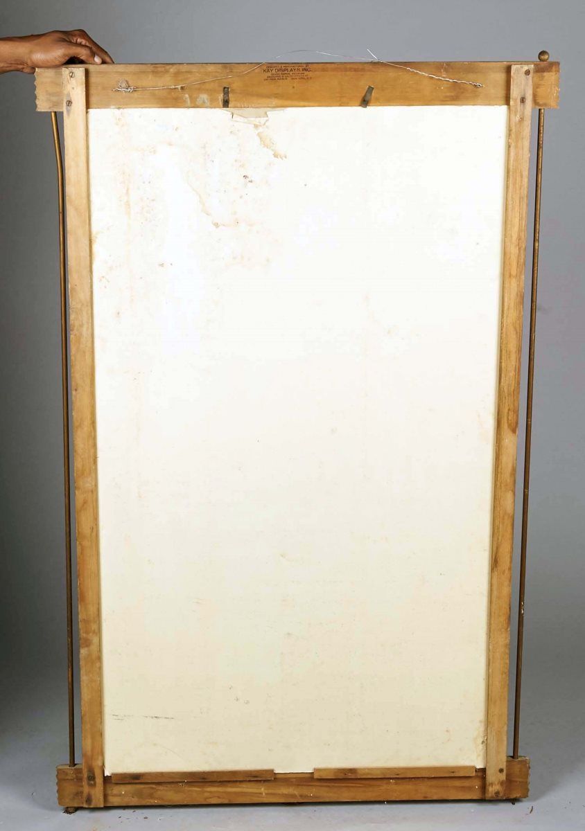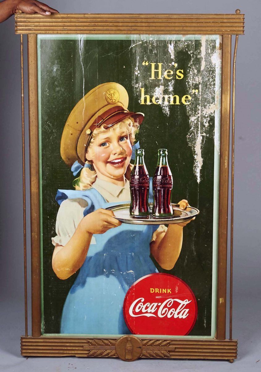 Tall 29" x 50" advertising sign with "He's Home" slogan showing a girl wearing her father's Army hat. Printed by The McCandlish Lithograph Corp., mounted in a wooden Kay's Display frame. Circa 1944. Condition (Fair). Size 35" x 56"