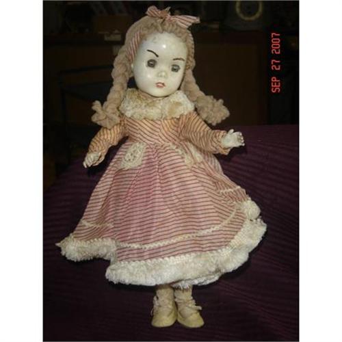 This is a pretty little doll. She is from the WWII Era. She is composition with moveable eyes. She has blonde yarn hair. She is wearing a red and white striped dress with fringe around the neck and bottom of dress. She also has her original socks and shoes. She is in good shape considering her age.