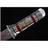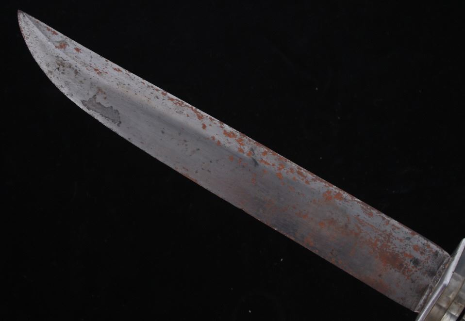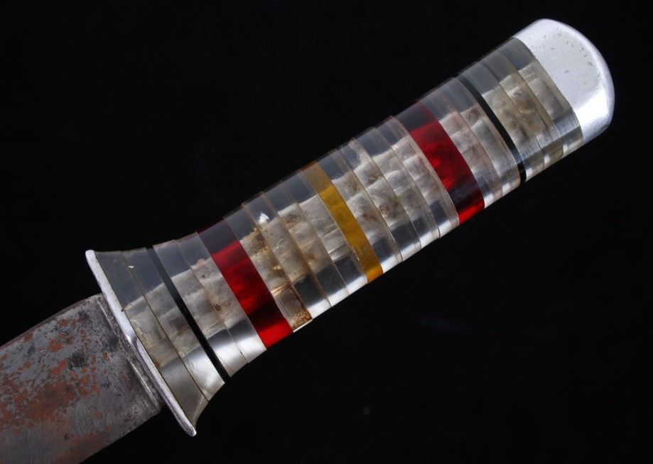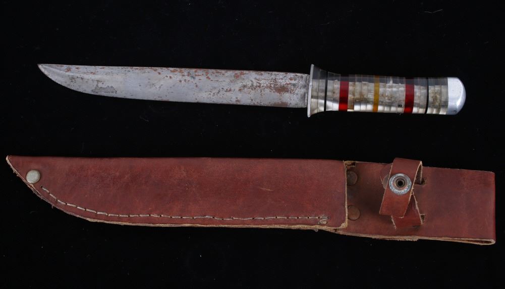 Featured in this lot is this WWII era drop straight back fighting knife, circa 1945. The knife features a drop straight back fighting knife with composite rings making up the handle. The condition of this knife and sheath are good and working, with oxidation and patina adorning the blade. The measurements of this knife in the sheath are 13 3/4" x 2" x 2 1/4" and the blade length is 8".