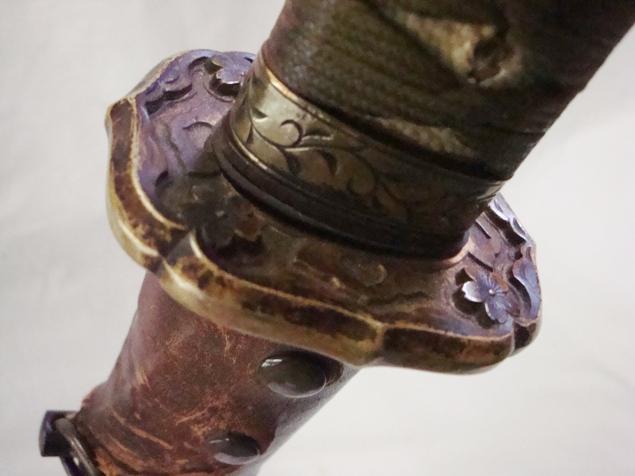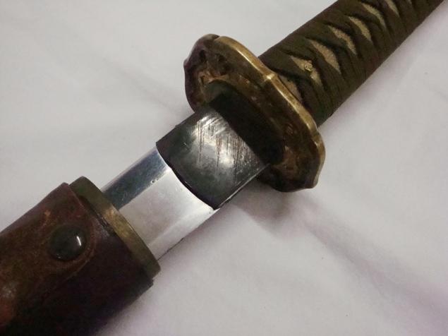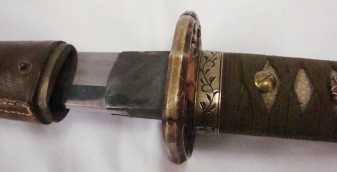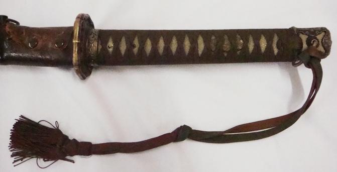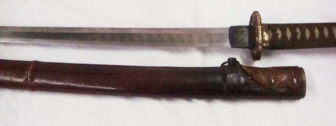 Excellent WWII era samurai military sword that is 40" in length with brown leather scabbard. Some minor wear probably from use during the war. Blade is intact with no apparent damage.