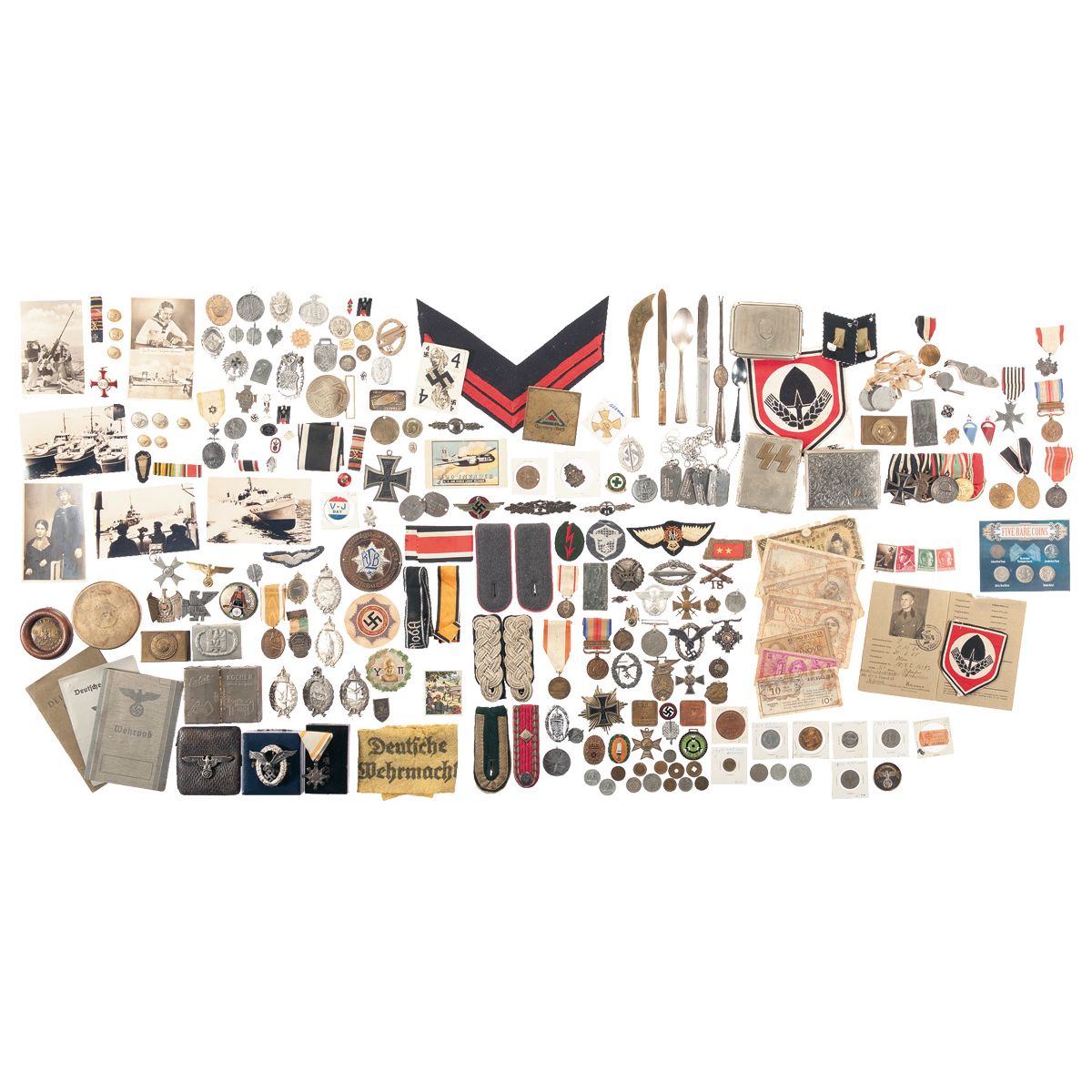 Approximately 220 items. Large number of pieces are Nazi related, some Japanese items, some pictures, SS cigarette cases, dog tags, pins, buttons, medals, shoulder boards, passports, and other assorted items.