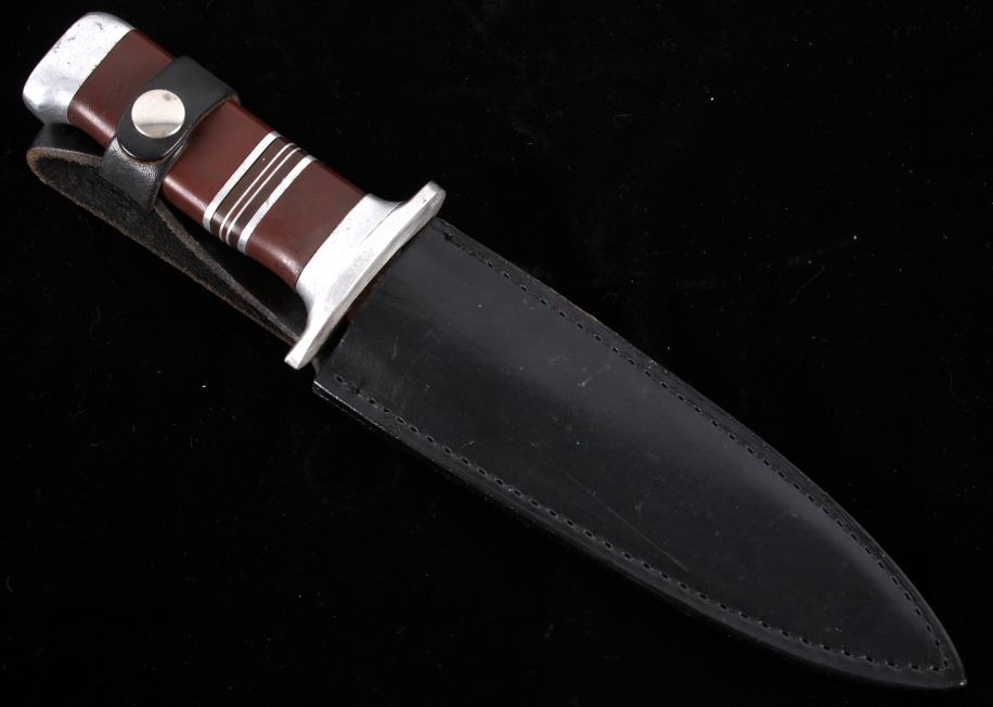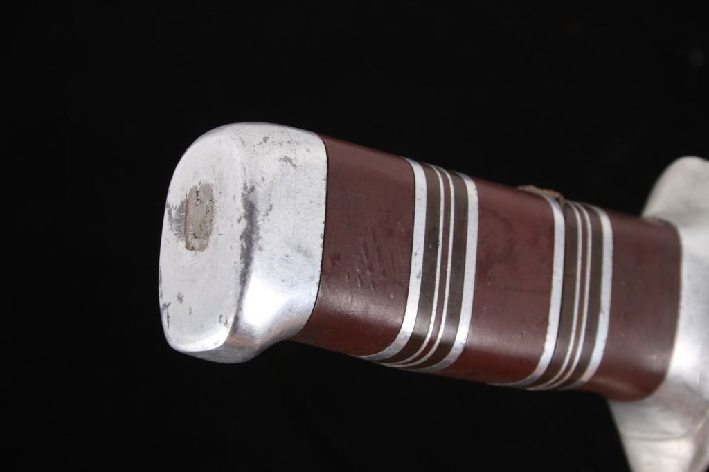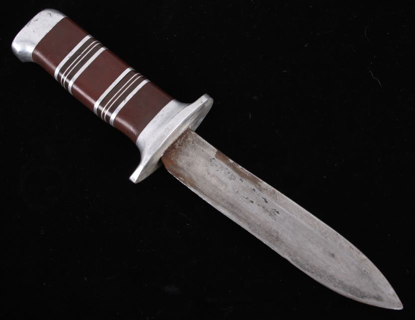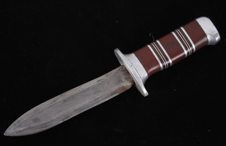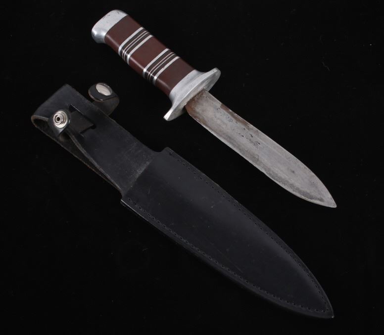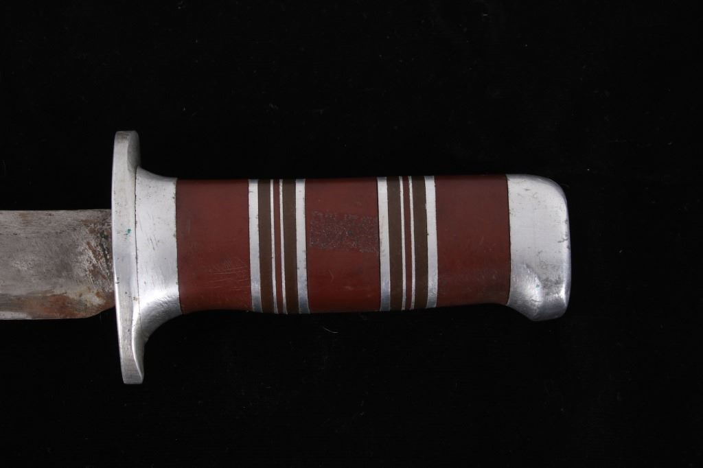 Featured in this lot is this WWII era trench theater dagger fighting knife, circa 1945. The knife features a personally sharpened dagger, trench knife style to the blade with rings of composite material and aluminum rings to the handle of this full tang blade. The condition of this knife is good, with the blade personally shaped into a dagger style of trench fighting knife. The measurements of this knife in the sheath are 12 1/2" x 2 1/2" x 1 7/8" and the blade length is 6 1/4".