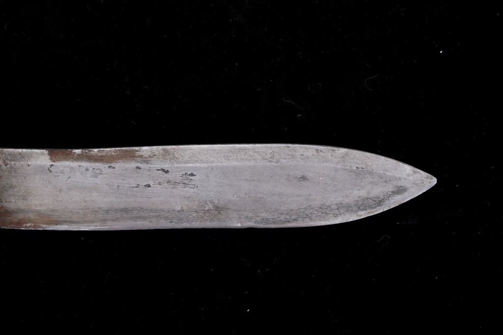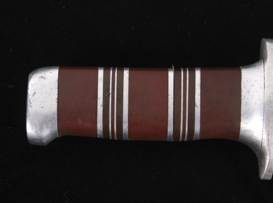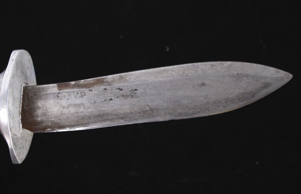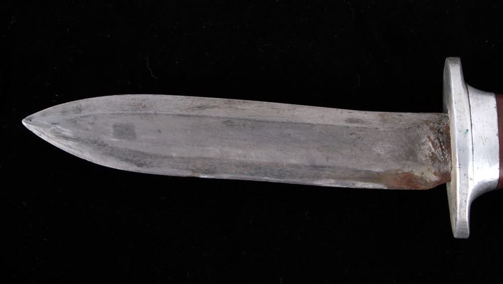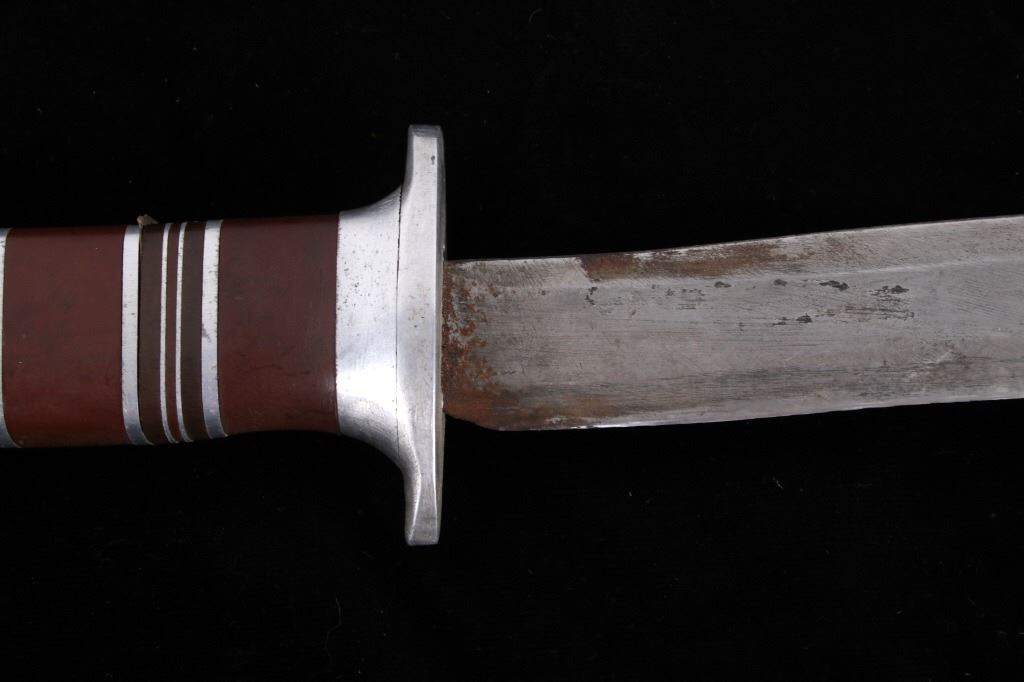 Featured in this lot is this WWII era trench theater dagger fighting knife, circa 1945. The knife features a personally sharpened dagger, trench knife style to the blade with rings of composite material and aluminum rings to the handle of this full tang blade. The condition of this knife is good, with the blade personally shaped into a dagger style of trench fighting knife. The measurements of this knife in the sheath are 12 1/2" x 2 1/2" x 1 7/8" and the blade length is 6 1/4".