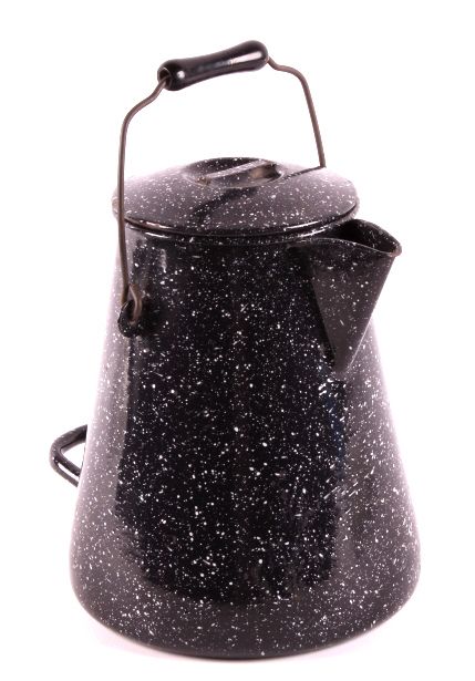 This is a WWII era U.S. Navy enamel ware coffee pot. The bottom of the pot is marked "U.S.N. The Vollrath Co." The handle is wooden and there is an extra horizontal handle near the bottom. The coffee pot does have the original lid. The Navy coffee pot is in very good condition. It measures 9.75" in diameter and is 11.25" tall.