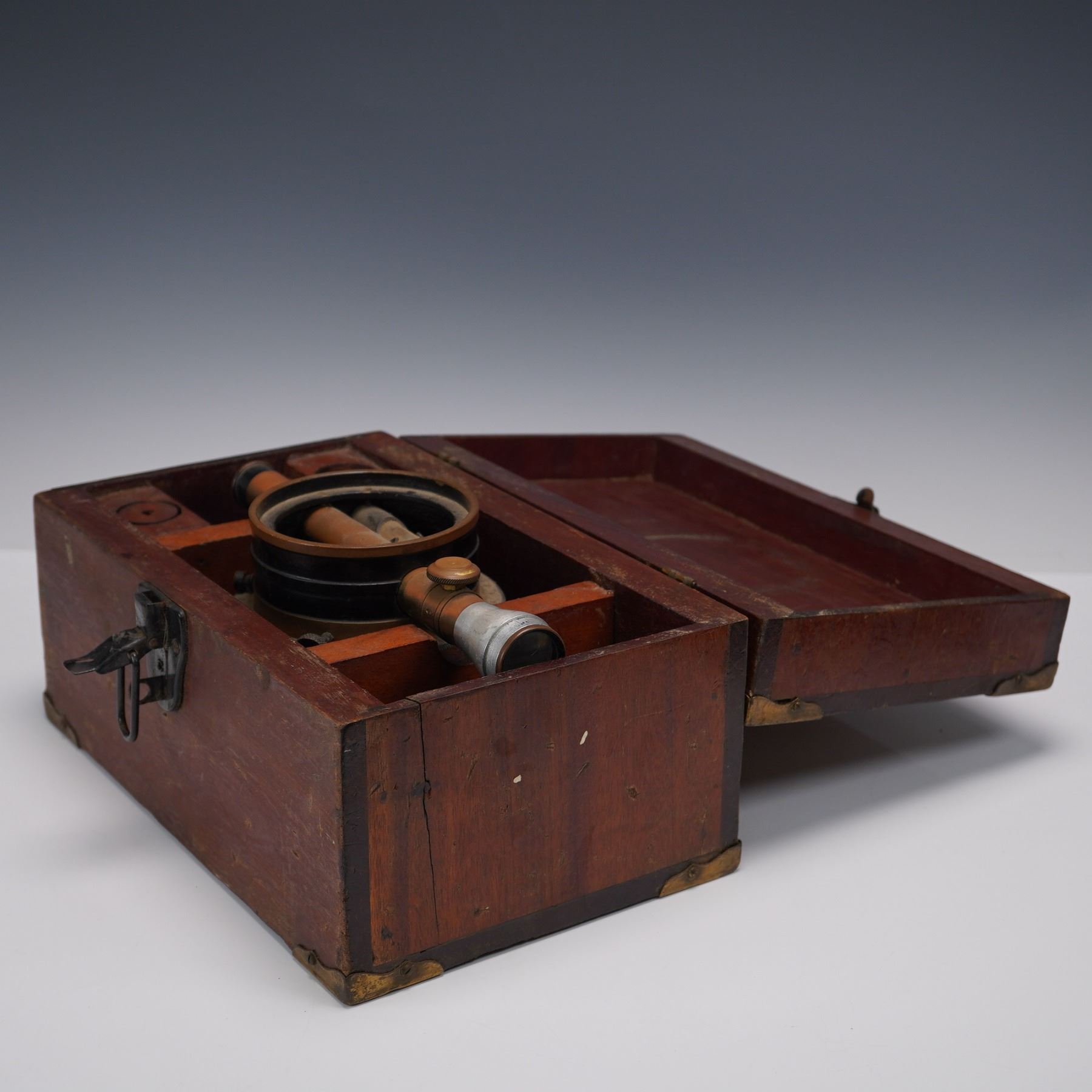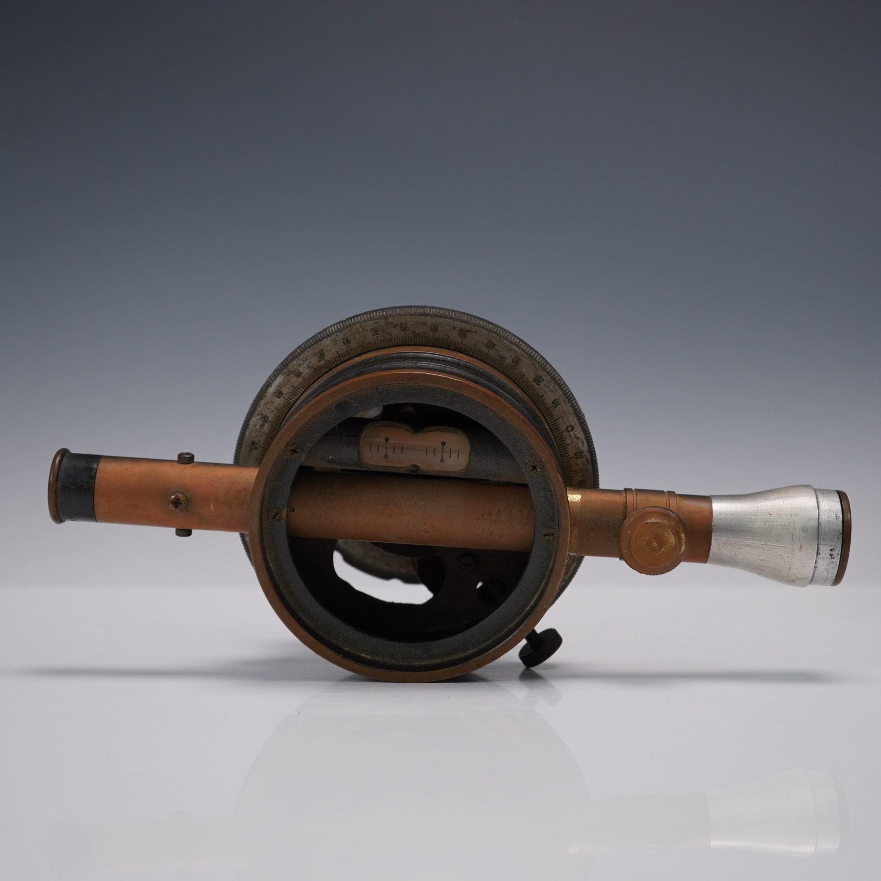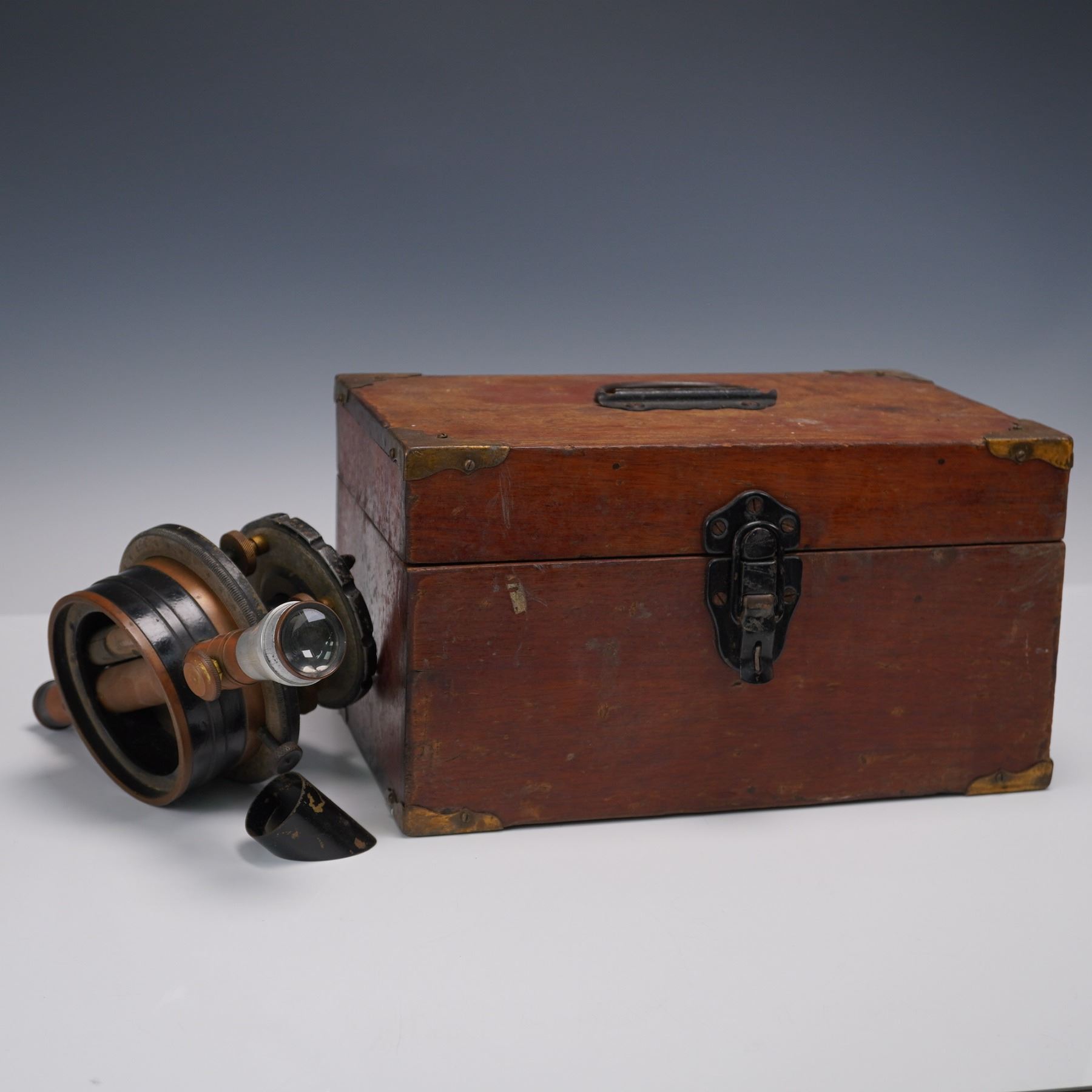 A U.S. Navy optical azimuth circle telescope or rangefinder, dating to World War II. Designed for use aboard naval vessels, the compact optical device features twin eyepieces with integral reticles, set into a rotating cylindrical body marked with degree measurements. Housed in a custom-fitted wooden case with compartments and brass hardware, the instrument would have been used for taking accurate bearings or sighting targets at sea. The unit displays patina, wear, and signs of naval use, contributing to its authenticity and historical appeal.