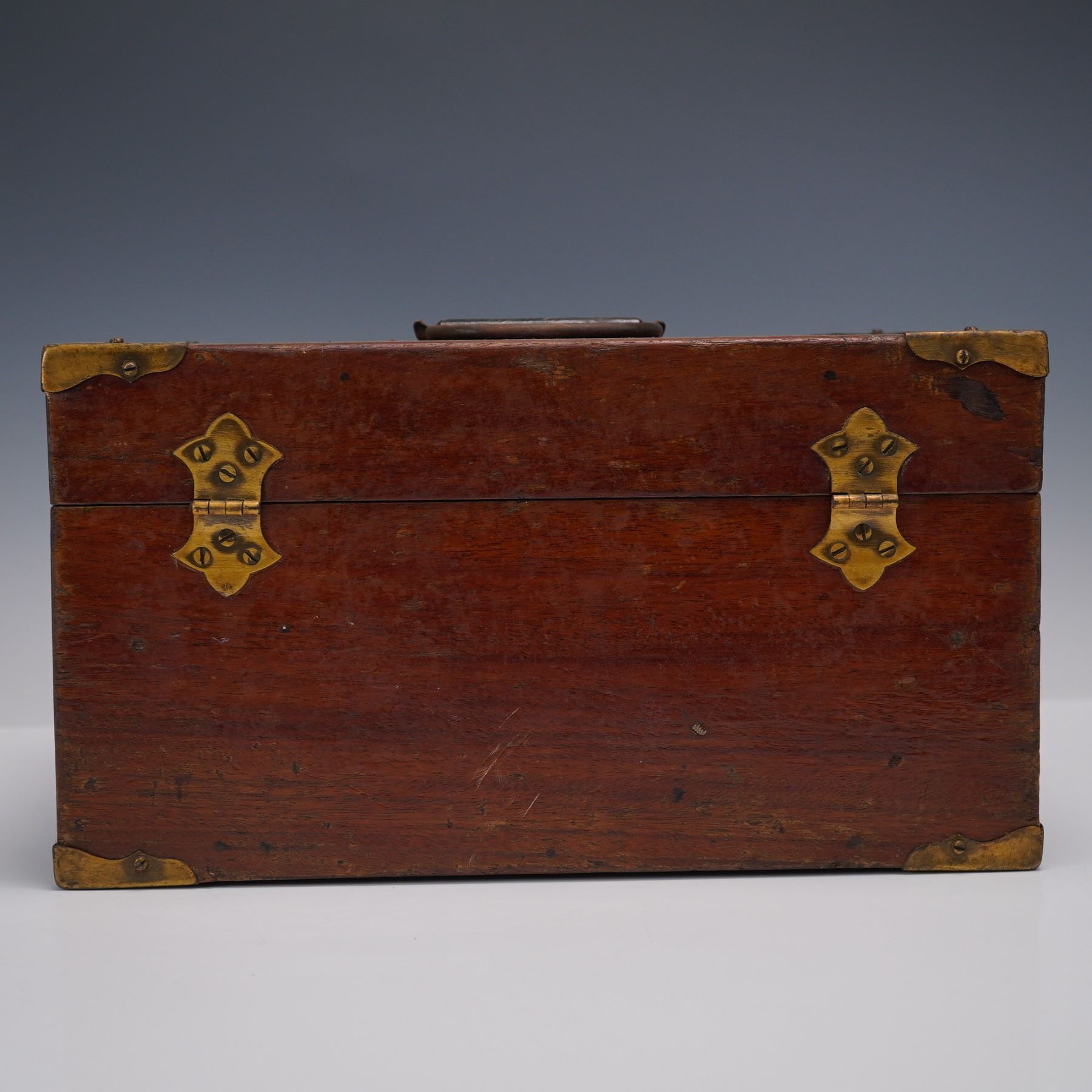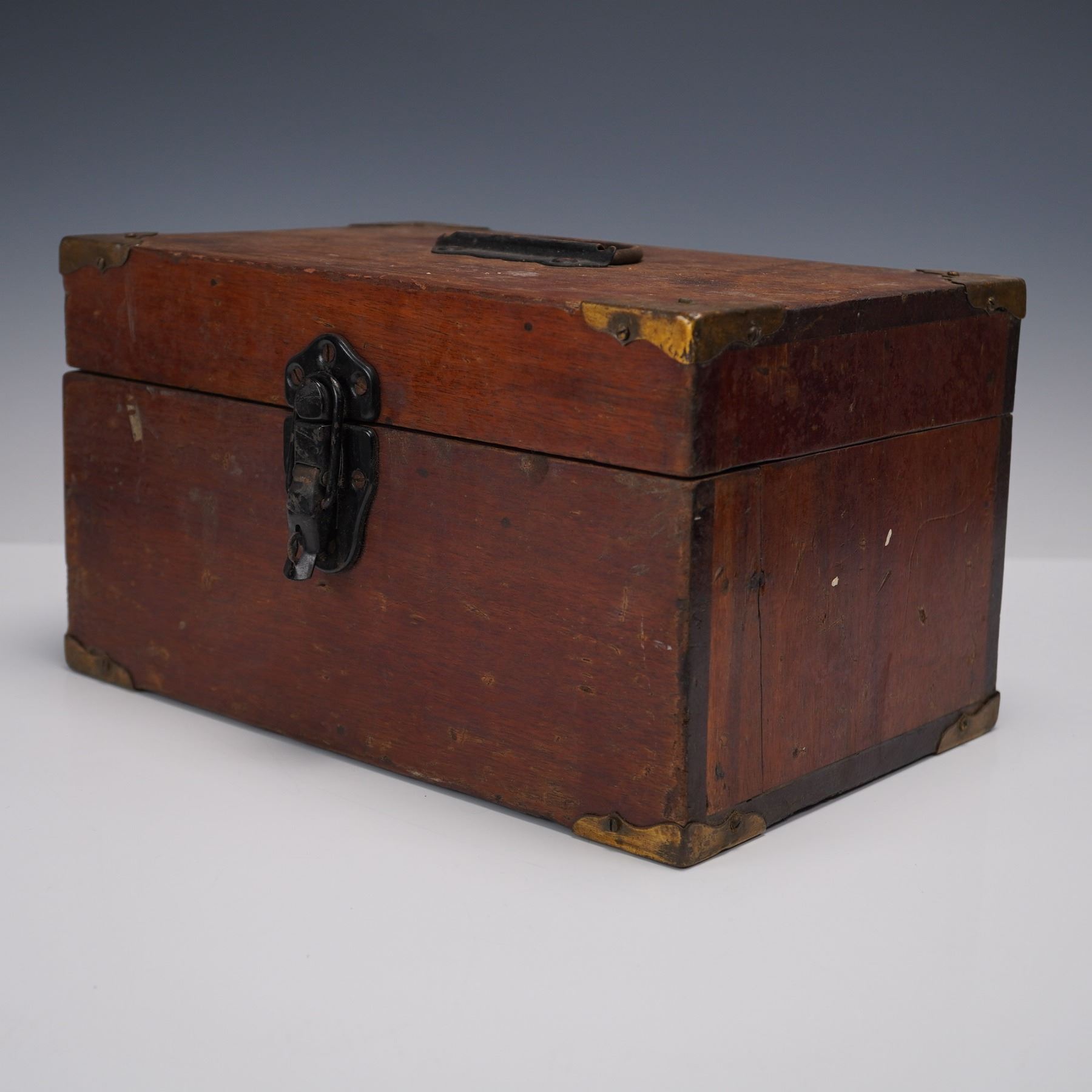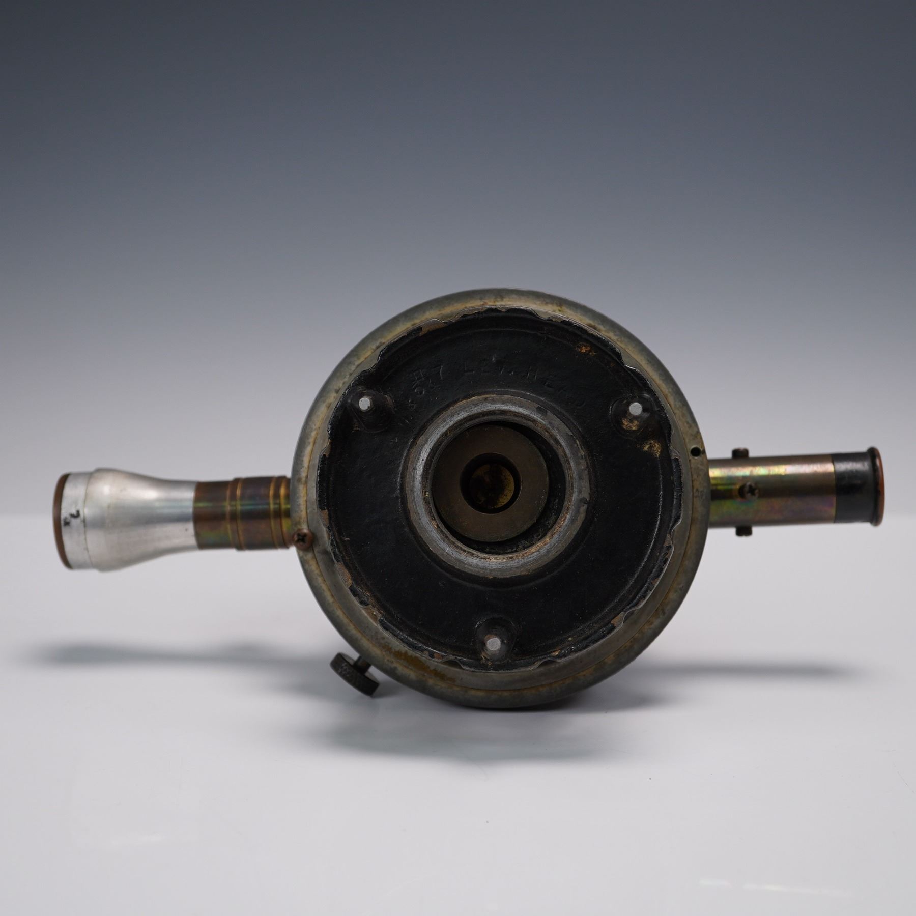 A U.S. Navy optical azimuth circle telescope or rangefinder, dating to World War II. Designed for use aboard naval vessels, the compact optical device features twin eyepieces with integral reticles, set into a rotating cylindrical body marked with degree measurements. Housed in a custom-fitted wooden case with compartments and brass hardware, the instrument would have been used for taking accurate bearings or sighting targets at sea. The unit displays patina, wear, and signs of naval use, contributing to its authenticity and historical appeal.