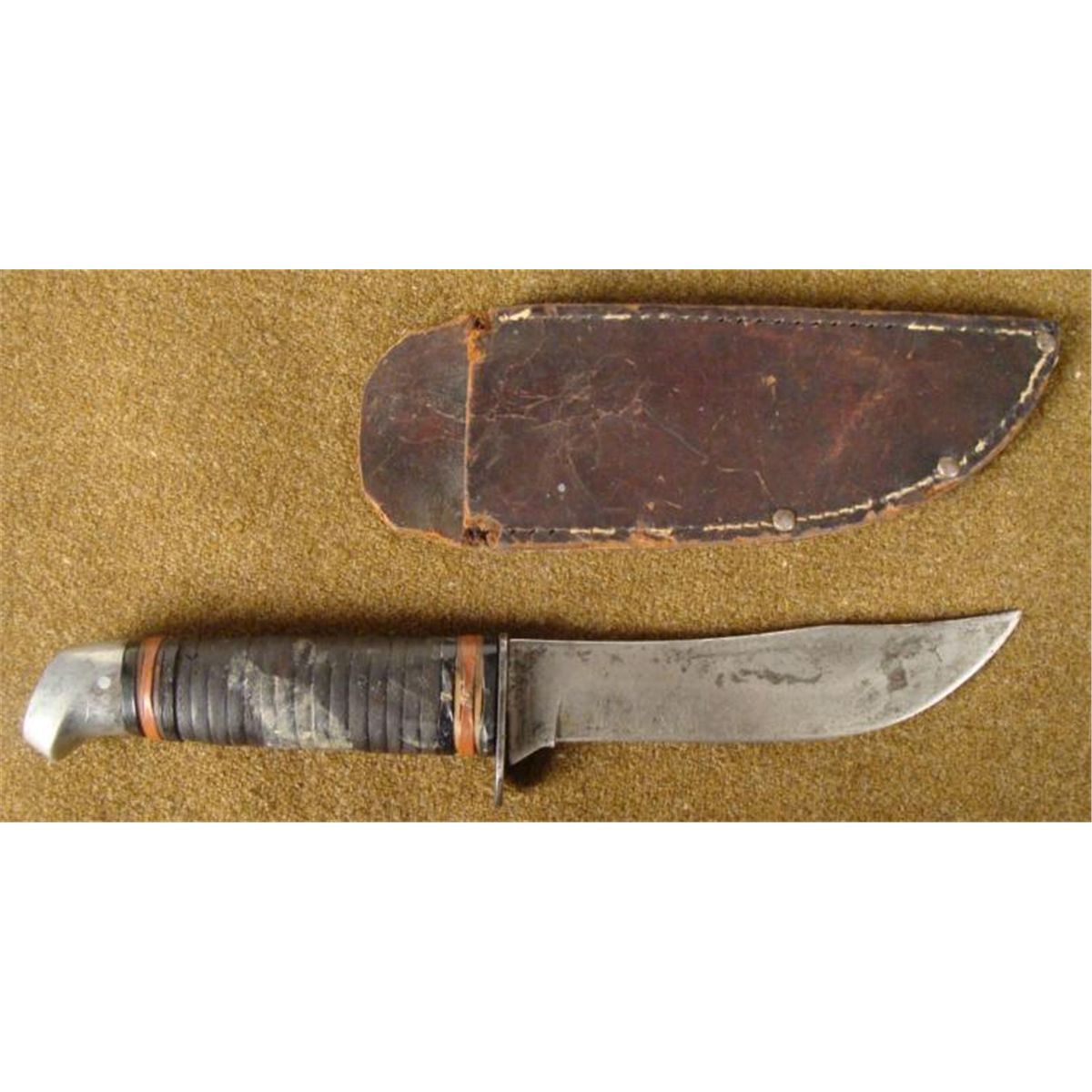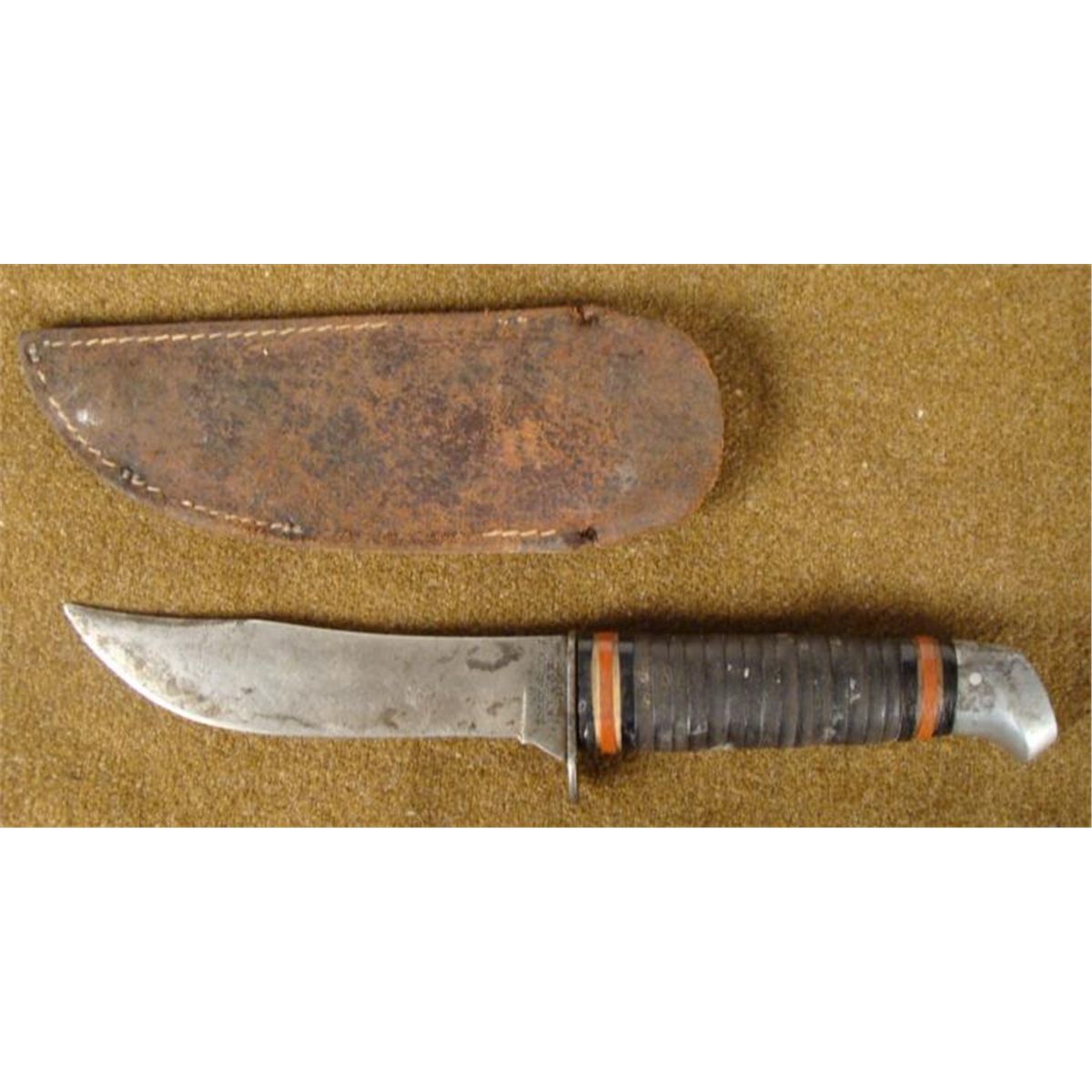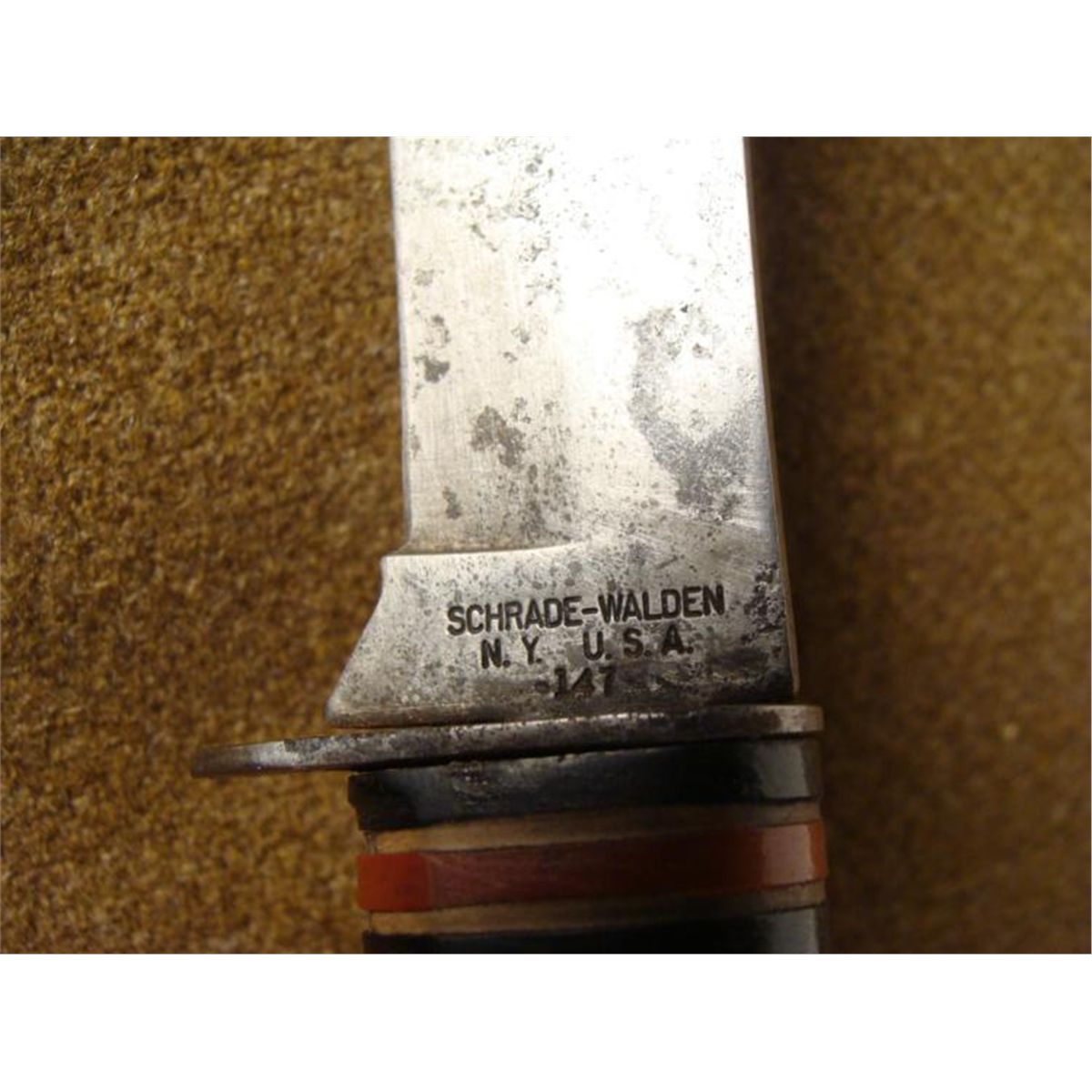 OFFERED HERE IS A WWII FIGHTING KNIFE AND LEATHER SHEATH, MODEL 147.  IT HAS A COMPOSITE GRIP AND A BOWIE TYPE BLADE THAT IS 4 1/2" LONG.  AT THE BOTTOM OF THE BLADE IT IS MARKED, SCHRADE-WALDEN, NY 147.  THERE IS SURFACE WEAR TO THE BLADE AND STAINS ON THE GRIP.  OVERALL IT IS IN GOOD CONDITION AND HAS AN OVERALL LENGTH OF 8 1/2". *  *  *  *